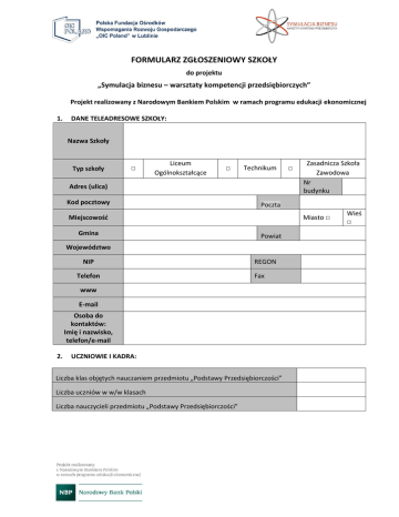 FORMULARZ ZGŁOSZENIOWY SZKOŁY do projektu „Symulacja biznesu – warsztaty kompetencji przedsiębiorczych” Projekt realizowany z Narodowym Bankiem Polskim w ramach programu edukacji ekonomicznej 1. DANE TELEADRESOWE SZKOŁY: Nazwa Szkoły Typ szkoły □ Liceum Ogólnokształcące □ Technikum Adres (ulica) Kod pocztowy Miasto □ Powiat Województwo NIP Telefon REGON Fax www E-mail Osoba do kontaktów: Imię i nazwisko, telefon/e-mail 2. UCZNIOWIE I KADRA: Liczba klas objętych nauczaniem przedmiotu „Podstawy Przedsiębiorczości” Liczba uczniów w w/w klasach Liczba nauczycieli przedmiotu „Podstawy Przedsiębiorczości” Zasadnicza Szkoła Zawodowa Nr budynku Poczta Miejscowość Gmina □ Wieś □ 3. DOTYCHCZASOWE DZIAŁANIA SZKOŁY: Czy szkoła brała udział we wsparciu w ramach projektu „COFFE – Competences of future” w ramach programu Leonardo da Vinci-Transfer Innowacji NIE □ TAK □ Czy szkoła brała udział we wsparciu w ramach projektu „Innowacyjne metody o obrębie przedsiębiorczości” w ramach POKL, Priorytet III - Wysoka jakość systemu oświaty, Projekty innowacyjne, współfinansowany przez Unię Europejską. NIE □ TAK □ Jakie nowoczesne metody szkoleniowe i narzędzia wykorzystywano dotychczas podczas prowadzenia zajęć z przedmiotu „Podstawy Przedsiębiorczości” z uczniami? Czy szkoła brała udział w olimpiadach, konkursach itp. z zakresu „Podstaw Przedsiębiorczości” lub ekonomii społecznej? NIE □ TAK □ – w jakich? 4. WYTYPOWANI UCZESTNICY PROJEKTU: a) Dane nauczyciela uczącego przedmiotu „Podstawy przedsiębiorczości” Imię i nazwisko Tel. kontaktowy Tel. komórkowy E-mail b) Wytypowani uczniowie szkoły ponadgimnazjalnej: (wytypowana grupa nie musi pochodzić z jednej klasy) Lp. 1 2 3 4 5 6 7 8 9 10 Imię i nazwisko ucznia Klasa Profil : LO - Liceum Ogólnokształcące / T- Technikum /ZSZ - Zasadnicza Szkoła Zawodowa 11 12 13 14 15 16 17 18 19 20 W przypadku wystąpienia wolnych limitów miejsc deklaruję chęć uczestnictwa w projekcie dodatkowych nauczycieli i uczniów : NIE □ TAK □ Liczba nauczycieli Liczba uczniów Oświadczam, że zapoznałem/am się z warunkami Regulaminu rekrutacji i uczestnictwa w projekcie i akceptuję jego warunki. Miejsce i data Pieczęć szkoły Pieczęć i podpis Dyrektora