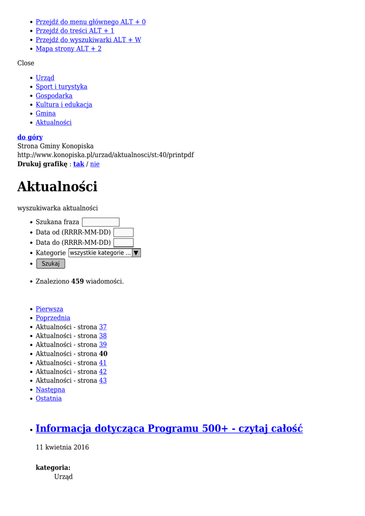 Przejdź do menu głównego ALT + 0 Przejdź do treści ALT + 1 Przejdź do wyszukiwarki ALT + W Mapa strony ALT + 2 Close Urząd Sport i turystyka Gospodarka Kultura i edukacja Gmina Aktualności do góry Strona Gminy Konopiska http://www.konopiska.pl/urzad/aktualnosci/st:40/printpdf Drukuj grafikę : tak / nie Aktualności wyszukiwarka aktualności Szukana fraza Data od (RRRR-MM-DD) Data do (RRRR-MM-DD) Kategorie wszystkie kategorie ... ▼ Szukaj Znaleziono 459 wiadomości. Pierwsza Poprzednia Aktualności - strona 37 Aktualności - strona 38 Aktualności - strona 39 Aktualności - strona 40 Aktualności - strona 41 Aktualności - strona 42 Aktualności - strona 43 Następna Ostatnia Informacja dotycząca Programu 500+ - czytaj całość 11 kwietnia 2016 kategoria: Urząd Gminny Ośrodek Pomocy Społecznej w Konopiskach informuje, że okresie od 11 kwietnia 2016 do 15 kwietnia 2016 wnioski o ustalenie prawa do świadczenia wychowawczego przyjmowane będą w Gminnym Ośrodku Pomocy Społecznej w Konopiskach ul. Lipowa 1 w godzinach 7.00-17.00. Informacja dotycząca Programu 500+ Informacja dotycząca Programu 500+ - czytaj całość „MŁODZIEŻ ZAPOBIEGA POŻAROM” - czytaj całość 06 kwietnia 2016 kategoria: Sport i Turystyka Dzisiaj zostały rozstrzygnięte Eliminacje Gminne Ogólnopolskiego Turnieju Wiedzy Pożarniczej „Młodzież zapobiega pożarom” zorganizowane przez Wójta Gminy Konopiska Jerzego Żurka, Prezesa Zarządu Oddziału Gminnego Związku Ochotniczych Straży Pożarnych druha Grzegorza Dynera i Komendanta Gminnego druha Janusza Jończyka „MŁODZIEŻ ZAPOBIEGA POŻAROM” „MŁODZIEŻ ZAPOBIEGA POŻAROM” - czytaj całość Koło Gospodyń Wiejskich w Kopalni wyróżnione w ogólnopolskim konkursie „Kobiety na Start” - czytaj całość 06 kwietnia 2016 kategoria: Kultura i Edukacja Konkurs jest wynikiem akcji „KGW na start”, którą pod koniec 2014 roku zapoczątkował "Tygodnik Poradnik Rolniczy". Dzięki niej poznajemy prężne grupy kobiet, które nie zawsze są zrzeszone i nie działają pod szyldem stowarzyszenia. Są po prostu grupą która wspólnie działa na rzecz integracji społecznej, promocji i kultywuje lokalne tradycje. Właśnie takie grupy organizator poszukuje i chce poprzez konkurs nagradzać. Koło Gospodyń Wiejskich w Kopalni wyróżnione w Koło Gospodyń Wiejskich w Kopalni wyróżnione w ogólnopolskim konkursie „Kobiety na Start” czytaj całość Program 500+ - czytaj całość 01 kwietnia 2016 kategoria: Pomoc społeczna Gminny Ośrodek Pomocy Społecznej w Konopiskach informuje, że od dnia 1 kwietnia 2016r. w Dziale Świadczeń Rodzinnych i Funduszu Alimentacyjnego przyjmowane będą wnioski o ustalenia prawa do świadczenia wychowawczego. Od dnia 22 marca 2016r. w siedzibie GOPS wydawane będą druki wniosku o ustalenie prawa do w/w. świadczenia. Program 500+ Program 500+ - czytaj całość Bezpłatne konsultacje dotyczące ulg przysługujących osobom niepełnosprawnym i ich rodzinom. - czytaj całość 25 marca 2016 kategoria: Urząd Od dnia 17 marca do 28 kwietnia we wtorki i czwartki w godzinach od 9.00 do 15.00 doradcy podatkowi ze Śląskiego Oddziału Krajowej Izby Doradców Podatkowych prowadzą bezpłatne konsultacje dotyczące ulg przysługujących osobom niepełnosprawnym i ich rodzinom. Bezpłatne konsultacje dotyczące ulg przysługuj Bezpłatne konsultacje dotyczące ulg przysługujących osobom niepełnosprawnym i ich rodzinom. czytaj całość Informacja - czytaj całość 23 marca 2016 kategoria: Urząd Informacja firmy STRABAG realizującej inwestycję budowy autostrady na terenie Gminy Konopiska Informacja Informacja - czytaj całość Informacja - czytaj całość 22 marca 2016 kategoria: Urząd W zawiązku z trwającymi pracami projektowymi przebudowy drogi wojewódzkiej nr 908 na odcinku Częstochowa - Tarnowskie Góry, przebiegającej m. in. przez miejscowości Wygoda, Wąsosz, Łaziec, Rększowice, Hutki informuję, że w ramach projektu zostaną uwzględnione i wykonane tylko zjazdy do posesji dotychczas istniejące. Informacja Informacja - czytaj całość Zawiadomienie - czytaj całość 22 marca 2016 kategoria: Urząd Na podstawie art. 20 ust. 1 ustawy o samorządzie gminnym z dnia 8 marca 1990 r. (Dz. U. z 2015 poz. 1515) zawiadamiam, że dnia: 29 marca 2016 r. (wtorek) o godz. 9.00 w sali konferencyjnej Urzędu Gminy w Konopiskach odbędzie się XX sesja Rady Gminy Konopiska Zawiadomienie Zawiadomienie - czytaj całość Zawiadomienie - czytaj całość 18 marca 2016 kategoria: Urząd Komisariat Policji w Blachowni zaprasza do udziału w debacie społecznej organizowanej w ramach konsultacji społecznych dotyczących założeń "Krajowej mapy zagrożeń w Polsce". Debata odbędzie się 26.03.2016 r. w remizie OSP Jamki o godzinie 11.00 Zawiadomienie Zawiadomienie - czytaj całość Informacja - czytaj całość 18 marca 2016 kategoria: Urząd Na działce przeznaczonej pod park w miejscowości Aleksandria Druga wzdłuż ul. Strażackiej przystąpiono do wycinki drzew stwarzających zagrożenie i utrudnienie dla użytkowników drogi i najbliższych zabudowań. Informacja Informacja - czytaj całość Pierwsza Poprzednia Aktualności - strona 37 Aktualności - strona 38 Aktualności - strona 39 Aktualności - strona 40 Aktualności - strona 41 Aktualności - strona 42 Aktualności - strona 43 Następna Ostatnia