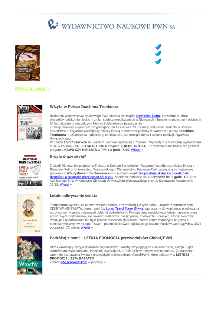 Biuletyn PWN - 16 czerwca 2011 Zamów już dziś w: księgarni internetowej mailem: [email protected] na infolinii 801 33 33 88 Niebieskie oczy czarny ląd w PRZED Przeczytaj więcej › Wizyta w Polsce Joachima Trenknera Nakładem Wydawnictwa Naukowego PWN ukazała się książka Niemieckie lustro, prezentująca obraz stosunków polsko-niemieckich i zmian społeczno-politycznych w Niemczech i Europie na przestrzeni ostatnich 50 lat, widziany z perspektywy Niemca i dziennikarza jednocześnie. Z okazji premiery książki oraz przypadającej na 17 czerwca 20. rocznicy podpisania Traktatu o Dobrym Sąsiedztwie i Przyjaznej Współpracy między Polską a Niemcami gościmy w Warszawie autora Joachima Trenknera – dziennikarza i publicystę, od kilkunastu lat korespondenta i członka redakcji Tygodnika Powszechnego. W dniach 15-17 czerwca br. Joachim Trenkner spotka się z mediami. Wywiady z nim zostaną wyemitowane m.in. w Polskim Radiu (SYGNAŁY DNIA Program 1, KLUB TRÓJKI). 17 czerwca autor będzie też gościem programu KAWA CZY HERBATA w TVP 1 o godz. 7.00. Więcej » Kropla drąży skałę? Z okazji 20. rocznicy podpisania Traktatu o Dobrym Sąsiedztwie i Przyjaznej Współpracy między Polską a Niemcami Rektor Uniwersytetu Warszawskiego i Wydawnictwo Naukowe PWN zapraszają na wyjątkowe spotkanie z Władysławem Bartoszewskim – autorem książki Kropla drąży skałę? Co mówiłem do Niemców i o Niemcach przez ponad pół wieku. Spotkanie odbędzie się 20 czerwca br. o godz. 18.00 w Auli Starego BUW w Kampusie Głównym Uniwersytetu Warszawskiego przy ul. Krakowskie Przedmieście 26/28. Więcej » Letnie odkrywanie świata Temperatura wzrasta, za oknem wreszcie słońce, a w myślach już tylko urlop... Razem z patronem serii ODKRYWANIE ŚWIATA, biurem podróży Logos Travel Marek Śliwka, zapraszamy do wspólnego przeżywania egzotycznych wypraw z dawnymi polskimi podróżnikami. Proponujemy najciekawsze teksty napisane przez prawdziwych podróżników, ale również zesłańców, pielgrzymów, myśliwych i uczonych, którzy zwiedzali świat, gdy podróżowanie nie było jeszcze masowym zjawiskiem. Zatem zanim wyruszycie na jedną z niebanalnych wypraw z Logos Travel – przemierzcie świat oglądając go oczyma Polaków wędrujących w XIX i początkach XX wieku. Więcej » Podróżuj z nami – LETNIA PROMOCJA przewodników Global/PWN Okres wakacyjny sprzyja podróżom zagranicznym: Włochy przyciągają nas lazurem nieba, Grecja i Egipt starożytnymi wykopaliskami, Hiszpania zwyczajami, a Indie i Chiny niepowtarzalną kulturą. Zapraszamy zatem do poznawania świata z niezwykłymi przewodnikami Global/PWN, które polecamy w LETNIEJ PROMOCJI z 25% RABATEM. Zobacz listę przewodników w promocji » Zmarł prof. Marek J. Siemek W dniu 30 maja br. zmarł wybitny filozof, wykładowca i nasz autor Profesor MAREK J. SIEMEK. Był prawdziwym uczonym, wielkim mówcą władającym piękną polszczyzną, wspaniałym człowiekiem, u którego pełne dystansu dostojeństwo łączyło się z dobrodusznością, ciepłym dowcipem, a przede wszystkim namiętnością do nauki, słowa i myślenia. Miał 69 lat. Więcej » XXIV Olimpiada Wiedzy Ekonomicznej 22 czerwca br. o godz. 16.00 w Ministerstwie Gospodarki odbędzie się uroczyste zakończenie XXIV Olimpiady Wiedzy Ekonomicznej. Z laureatami bieżącej edycji Olimpiady i ich opiekunami naukowymi spotka się wicepremier, minister gospodarki Waldemar Pawlak. W trakcie spotkania zostaną wręczone pamiątkowe dyplomy, a przedstawiciele mecenasów OWE przekażą ufundowane nagrody. Od wielu lat Wydawnictwo Naukowe PWN wspiera organizację Olimpiady i jest fundatorem nagród dla zwycięzców. Więcej » Obchody 350-lecia prasy polskiej Instytut Dziennikarstwa oraz Instytut Informacji Naukowej i Studiów Bibliologicznych Uniwersytetu Warszawskiego, a także Instytut Badań Literackich PAN i Fundacja Centrum Badań i Edukacji im. Ryszarda Kapuścińskiego serdecznie zapraszają wszystkich zainteresowanych do udziału w obchodach 350-lecia prasy polskiej, które odbędą się w Warszawie w dniach 16-17 czerwca br. Pierwszego dnia obrady będą odbywać się w audytorium Starej Biblioteki UW. W drugim dniu trzy równoległe sesje naukowe odbędą się w Instytucie Dziennikarstwa, Instytucie Badań Literackich PAN oraz Instytucie Informacji Naukowej i Studiów Bibliologicznych UW. Patronat nad uroczystością objęło Wydawnictwo Naukowe PWN. Więcej » Ruch, wzrok, słuch – podstawa uczenia się Wydawnictwo Naukowe PWN, Zakład Terapii Pedagogicznej Akademii Pedagogiki Specjalnej im. Marii Grzegorzewskiej w Warszawie oraz Centrum Metody Johansena JIAS zapraszają do udziału w międzynarodowej konferencji naukowej RUCH, WZROK, SŁUCH – PODSTAWA UCZENIA SIĘ, która odbędzie się 17 września w godz. 10.00-15.00 w siedzibie Akademii Pedagogiki Specjalnej im. Marii Grzegorzewskiej w Warszawie (ul. Szczęśliwicka 40, budynek C, aula C). UWAGA! Rejestracja trwa tylko do końca czerwca! Więcej » Nowości i wznowienia Extreme English. Słownik tematyczny z multimediami I. Kienzler Unia Europejska. Słownik polsko-angielsko-niemiecko-francuski Wyraźne R Dźwięczność Jąkanie Seplenienie Trening słuchu M. Melanowicz Historia literatury japońskiej M. Łozińska, J. Łoziński W przedwojennej Polsce M.J. Leszka, T. Wolińska (red.) Konstantynopol - Nowy Rzym M. Franz Bohaterowie najdłuższych dni J. Trenkner, P. Gulińska-Jurgiel Niemieckie lustro G. Althoff Potęga rytuału W. Bartoszewski Kropla drąży skałę? L.P. Słupecki Wojownicy i wilkołaki B.R. Myers Najczystsza rasa M. Chomczyńska-Rubacha Płeć i szkoła A. Kupidura, M. Łuczewski, P. Kupidura Wartość krajobrazu Ch. Drösser Fizyka. Daj się uwieść! S. Kanas Podstawy ekonomii matematycznej M. Podstawka (red.) Finanse. Instytucje, instrumenty, podmioty, rynki, regulacje D. Sankowski, W. Mosorov, K. Strzecha Przetwarzanie i analiza obrazów w systemach przemysłowych R. Strycz