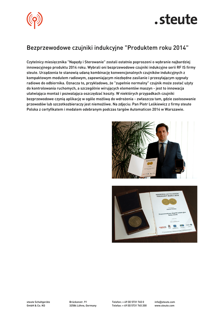 Bezprzewodowe czujniki indukcyjne "Produktem roku 2014" Czytelnicy miesięcznika "Napędy i Sterowanie" zostali ostatnio poproszeni o wybranie najbardziej innowacyjnego produktu 2014 roku. Wybrali oni bezprzewodowe czujniki indukcyjne serii RF IS firmy steute. Urządzenia te stanowią udaną kombinację konwencjonalnych czujników indukcyjnych z kompaktowym modułem radiowym, zapewniającym niezbędne zasilanie i przesyłającym sygnały radiowe do odbiornika. Oznacza to, przykładowo, że "zupełnie normalny" czujnik może zostać użyty do kontrolowania ruchomych, a szczególnie wirujących elementów maszyn - jest to innowacja ułatwiająca montaż i pozwalająca oszczędzać koszty. W niektórych przypadkach czujniki bezprzewodowe czynią aplikację w ogóle możliwą do wdrożenia - zwłaszcza tam, gdzie zastosowanie przewodów lub szczotkozbieraczy jest niemożliwe. Na zdjęciu: Pan Piotr Leśkiewicz z firmy steute Polska z certyfikatem i medalem odebranym podczas targów Automaticon 2014 w Warszawie. steute Schaltgeräte GmbH & Co. KG Brückenstr. 91 32584 Löhne, Germany Telefon: + 49 (0) 5731 745 0 Telefax: + 49 (0) 5731 745 200 [email protected] www.steute.com steute Schaltgeräte GmbH & Co. KG Brückenstr. 91 32584 Löhne, Germany Telefon: + 49 (0) 5731 745 0 Telefax: + 49 (0) 5731 745 200 [email protected] www.steute.com