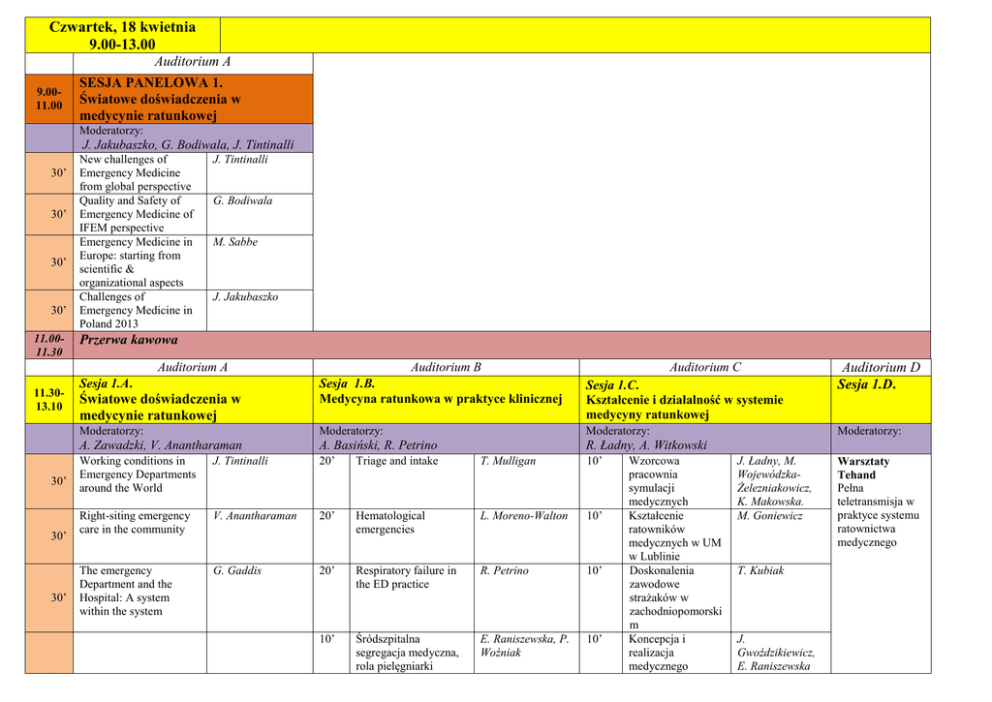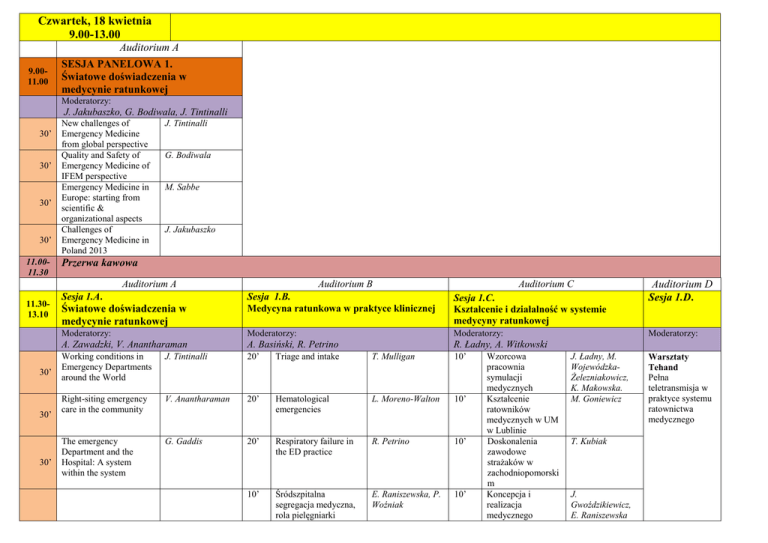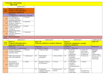Czwartek, 18 kwietnia 9.00-13.00 Auditorium A 9.0011.00 SESJA PANELOWA 1. Światowe doświadczenia w medycynie ratunkowej Moderatorzy: J. Jakubaszko, G. Bodiwala, J. Tintinalli 30’ 30’ 30’ 30’ 11.0011.30 New challenges of Emergency Medicine from global perspective Quality and Safety of Emergency Medicine of IFEM perspective Emergency Medicine in Europe: starting from scientific & organizational aspects Challenges of Emergency Medicine in Poland 2013 J. Tintinalli G. Bodiwala M. Sabbe J. Jakubaszko Przerwa kawowa Auditorium A 11.3013.10 30’ 30’ 30’ Sesja 1.A. Auditorium B Auditorium C Sesja 1.B. Medycyna ratunkowa w praktyce klinicznej Sesja 1.C. Kształcenie i działalność w systemie medycyny ratunkowej Moderatorzy: Moderatorzy: Moderatorzy: A. Zawadzki, V. Anantharaman A. Basiński, R. Petrino R. Ładny, A. Witkowski Working conditions in Emergency Departments around the World J. Tintinalli 20’ Triage and intake T. Mulligan 10’ Right-siting emergency care in the community V. Anantharaman 20’ Hematological emergencies L. Moreno-Walton 10’ The emergency Department and the Hospital: A system within the system G. Gaddis 20’ Respiratory failure in the ED practice R. Petrino 10’ 10’ Śródszpitalna segregacja medyczna, rola pielęgniarki E. Raniszewska, P. Woźniak 10’ Światowe doświadczenia w medycynie ratunkowej Wzorcowa pracownia symulacji medycznych Kształcenie ratowników medycznych w UM w Lublinie Doskonalenia zawodowe strażaków w zachodniopomorski m Koncepcja i realizacja medycznego Auditorium D Sesja 1.D. Moderatorzy: J. Ładny, M. WojewódzkaŻelezniakowicz, K. Makowska. M. Goniewicz T. Kubiak J. Gwoździkiewicz, E. Raniszewska Warsztaty Tehand Pełna teletransmisja w praktyce systemu ratownictwa medycznego ratunkowej 10’ 10’ 10’ 13.1014.00 Obiad Factor contributing to stress and burnout among the emergency medicine personel Wpływ Triage na decyzje i hospitalizację pacjentów KMR ASK Rola USG w wykrywaniu, lokalizacji i usuwaniu ciał obcych zabezpieczenia turnieju UEFA EURO 2012 w Gdańsku Analiza uprawnień pracowników EMS K. Karwacka – Vogele, A. Basiński 10’ G. Chourasia, J. Sokołowski, J. Jakubaszko A. Domanasiewicz, A. Elsaftawy, P. Szetelnicki 10’ Nocne loty HEMS R. Gałązkowski 10’ Urządzenia mobilne w ratownictwie medycznym E. Kołodziński, R. Ropiak, Ł. Tomczyk 10’ Aktywność ZRM w powiecie sanockim J. Sawka, E. Cipora, J. Bierawska at al. P. Sowizdraniuk. Czwartek, 18 kwietnia 14.00-18.00 Auditorium A 14.0016.00 SESJA PANELOWA 2. Sepsa w praktyce klinicznej oddziału ratunkowego Moderatorzy: A. Kübler, M. Sabbe, C. Frostel 30’ 30’ 30’ 30’ 16.0016.30 Surviving Sepsis Campaign Sepsis – EGDT-ED A. Kübler Emergency Department Screening for Sepsis Animal endotoxemia model G. Gaddis M. Sabbe C. Frostel Przerwa kawowa Auditorium A 16.3018.00 Auditorium B Auditorium C Sesja 2.A. Sesja 2.B. Sesja 2.C. Medycyna ratunkowa w praktyce klinicznej - A Medycyna ratunkowa w praktyce klinicznej - B Medycyna ratunkowa w praktyce klinicznej - C Moderatorzy: Moderatorzy: Moderatorzy: J. Godziński, D. O’Brien J. Karski, E. Raniszewska New technologies in emergency cardiac care V. Anantharaman 20’ Therapeutic hypothermia L. MorenoWalton 10’ R. Petrino 20’ Emergency endoscopy K. Krueger 10’ G. Gaddis 20’ 10’ A. Witkowski, J. Jakubaszko, A. Sobczyńska at al. 10’ M. Sehn , T. Sikora, M. Kwiatoń at al. 10’ 10’ Prokalcytonina jako marker infekcji w diagnostyce SOR CODE infarction versus coronary syndromes OZW w KMR ASK we Wrocławiu C. G. Rosas 20’ Appropriateness and safety in ED: how to optimize diagnostic and therapeutic pathways Clinical research with limited funds A. Baranowska, L. Styka, M. Kwiatoń 10’ Leczenie napadowego migotania przedsionków w SOR S. Pilip, A. Binkowska, D. Celińska at al. 10’ 10’ Znajomość Surviving Sepsis Campaign wśród lekarzy SOR M. Gaca, G. Gaddis 20’ 20’ Moderatorzy: Nagłe zagrożenie zdrowotne pochodzenia endokrynnego Alkohol etylowy a dolegliwości pacjentów w SOR J. Blach, J. Dobosz, M. Galan, A. Sulima Nieinwazyjna ocena nawodnienia w stanie zagrożenia życia Pozaustrojowe ogrzewanie w hipotermii M. WojewódzkaŻelezniakowicz, J. Ładny M. WojewódzkaŻelezniakowicz, S. Czaban, M. Badonski at al. M. WojewódzkaŻelezniakowicz, A. Nammous, B. Poniatowski at al. Hipotermia terapeutyczna w zawale serca Auditorium D Sesja 2.D. A. Caban, D. Zira, Z. Truszewski Warsztaty – unieruchamianie złamań miednicy 10’ OZW w strukturze wyjazdów ZRM w Pleszewie J. Nowicki, A. Witkowski, M. Pietrzyk 10’ Dostęp do żyły obwodowej u chorego z obrzękami kończyn P. Łukiewicz, R. Sienicki, M. Fraczek 10’ Mechanical CPR in hypothermia – case report Ukąszenie przez żmiję zygzakowatą R. Jalali, I. Godlewska, A. Chudzik at al. M. Łukasik – Głębocka, P. Ampel, E. Matuszkiewicz M. Pietrzyk, A. Witkowski 10’ 10’ Nagły poród pozaszpitalny Piątek, 19 kwietnia 9.00-13.00 Auditorium A 9.0011.00 SESJA PANELOWA 3. Ratunkowe leczenie urazów Moderatorzy: L. Brongel, J. Lex, L. Moreno-Walton 30’ 30’ 30’ 30’ 11.0011.30 Introduction to trauma care High-risk orthopedics training your eye to find the injury Fluid resuscitation in trauma Human factors in medical team L. Moreno-Walton J. Lex A. Bean T. Sołtysinski Przerwa kawowa Auditorium A 11.3013.00 20’ 20’ 10’ 10’ 10’ 10’ Auditorium B Auditorium C Sesja 3.A. Ratunkowe leczenie urazów Sesja 3.B. Ból i schorzenia psychiczne w praktyce oddziału ratunkowego Sesja 3.C Medycyna ratunkowa w oczach studentów i młodych lekarzy Moderatorzy: Moderatorzy: Moderatorzy: A. Nogalski, A. Bean A. Basiński, M. Wojnar M. Gaca, J. Sokołowski Evidence based rules for radiologic evaluation of brain and cervical spine injuries Evidence based rules for ultrasound imaging in trauma Rational fluid therapylooking for better solutions. The colloids review. Trauma team „yes we can” A. Bean 15’ Lecze