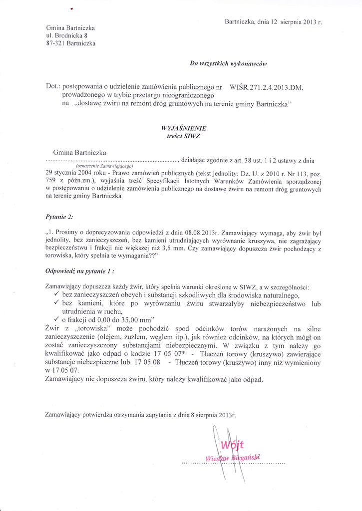 a Baftniczka, dnia 1Ż sierpnia 2013 r' Gmina Bartniczka ul. Brodnicka 8 8'7 -321 Bartniczka D o ws zy stkic h wy ko naw ców Dot.: postępowania o udzielenie zamowienia publicznego ff WISR.271 .2.4.2OI3.DM, prowadzone g o w tryb ie przetar gu nieo grani czone go na ,,dostawę zwiru na remont dróg grunto!\Ych na terenie gminy Bartniczka'' Ił/YJASNIENIE treści SIWZ Gmina Bartntczka (oznacze nie Zamaw iaj qc e go) 29 sĘcznia 2004 roku - Prawo zamówień publicznych (tekst jednolity:Dz'lJ' zŻ010 r. Nr 113,poz. '759 z poźn.zm'), wyjaśnia treśó Specyfikacji Istotnych Warunków Zamówienia sporządzonej w postępowaniu o udzielenie zamówienia publicznego na dostawę Żwiru na remont dróg gruntowych na terenie gminy Battniczka Pytanie 2: ,,1. Prosimy o doprecyzowania odpowiedzi z dnia 08.08.2013r. Zamawiający wymaga, aby żwir był jednolity, bez zanieczyszczefi, bez kamieni utrudniających wyrównanie kruszyłva, nie zagraŻający bezpieczeństwu i frakcji nie większej niż3,5 mm' Czy zamawiający dopuszczażwtr pochodzący z torowiska, który spełnia te wymagania??" odpowiedź na pytanie 1 : Zamawia1ący dopuszczakażdy zwir, który spełnia warunki określone w SIWZ, aw szczegolności: / bez Zanieczyszczeń obcych i substancji szkodliwych dla środowiskanaturalnego, / bez kamieni, które po wyfównaniu żwiru stwarzałyby niebezpieczeństwo utrudnienia w ruchu, o frakcji od 0,00 do 35,00 mm" / Żwir z ,,torowiska'' moŻe pochodzić spod odcinków torów lub naraŻonych na silne zanteczyszczenve (olejem, żuŻlem, węglem itp.), jak rownleŻ odcinków, na których mógł on zostac Zanleczyszczony substancjami niebezpiecznymi. W związku z tym naleŻy go kwalifikowaó jako odpad o kodzie 1] 05 0]* - Tłuczeń torowy (kruszywo) zawierające substancje niebezpieczne lub 17 05 08 - Tłuczeń torowy (kruszywo) inny niz wymieniony w 17 05 07. Zamawiający nie dopuszcza Żwiru,ktory naleŻy kwalifikowaó jako odpad. Zamawiający potwierdza ottzymania zapytania z dnia B sierpnia 2013r.