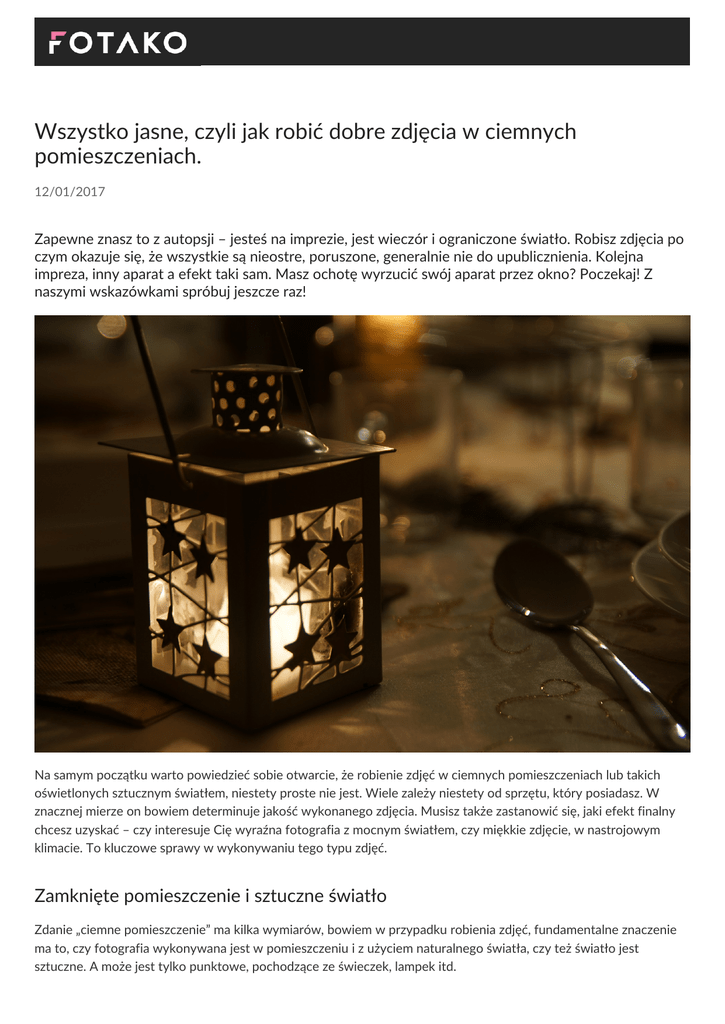 Wszystko jasne, czyli jak robić dobre zdjęcia w ciemnych pomieszczeniach. 12/01/2017 Zapewne znasz to z autopsji – jesteś na imprezie, jest wieczór i ograniczone światło. Robisz zdjęcia po czym okazuje się, że wszystkie są nieostre, poruszone, generalnie nie do upublicznienia. Kolejna impreza, inny aparat a efekt taki sam. Masz ochotę wyrzucić swój aparat przez okno? Poczekaj! Z naszymi wskazówkami spróbuj jeszcze raz! Na samym początku warto powiedzieć sobie otwarcie, że robienie zdjęć w ciemnych pomieszczeniach lub takich oświetlonych sztucznym światłem, niestety proste nie jest. Wiele zależy niestety od sprzętu, który posiadasz. W znacznej mierze on bowiem determinuje jakość wykonanego zdjęcia. Musisz także zastanowić się, jaki efekt finalny chcesz uzyskać – czy interesuje Cię wyraźna fotografia z mocnym światłem, czy miękkie zdjęcie, w nastrojowym klimacie. To kluczowe sprawy w wykonywaniu tego typu zdjęć. Zamknięte pomieszczenie i sztuczne światło Zdanie „ciemne pomieszczenie” ma kilka wymiarów, bowiem w przypadku robienia zdjęć, fundamentalne znaczenie ma to, czy fotografia wykonywana jest w pomieszczeniu i z użyciem naturalnego światła, czy też światło jest sztuczne. A może jest tylko punktowe, pochodzące ze świeczek, lampek itd. Zacznijmy zatem od przypadku pomieszczenia oświetlonego niewystarczjącym światłem dziennym. Ważne, aby Twój aparat był nieruchomy. Najlepiej do tego celu użyć statywu. Dobrze, gdy fotografowana osoba/obiekt był jak najbliżej okna (światła dziennego). Ustaw wysokie ISO, aby braki światła w pewnym sensie nadrobić. Czas naświetlania nie powinien być dłuższy niż 1/160 sekundy (wtedy obiekty na zdjęciu pozostaną nieporuszone), przysłonę natomiast dostosuj zgodnie ze swoimi potrzebami i preferencjami. Wypróbuj tryb Av (priorytet przysłony) – ustaw ISO od 400 w górę a aparat dostosuj przysłonę a aparat sam dobiera czas naświetlania. Rozwiązaniem przygotowanym na fotografowanie w ciemnych pomieszczeniach jest zastosowanie lampy błyskowej. W przypadku fotografowania ludzi czas naświetlania nie powinien być dłuższy niż 1/160 sekundy. Podobnie jak w poprzednim przypadku dostosuj przysłonę do swoich potrzeb ale, ze względu na światło flasha, możesz zdecydować się na niższe ISO. Jeśli masz dodatkową lampę, jej głowicę skieruj w kierunku sufitu. Inaczej sytuacja maluje się, gdy chcesz zrobić zdjęcie pomieszczenia. W takim wypadku potrzebny jest długi czas naświetlania, niskie ISO, i przysłona jak zwykle dostosowana do potrzeb. Absoutnie konieczne jest, aby aparat był stabilny, dlatego ustaw go na statywie. Flash skieruj w głąb pokoju. Co niezwykle istotne, w sztucznym świetle koniecznie zadbaj o poprawne dostosowanie balansu bieli. Jeśli natomiast Twoja wbudowana lampa błyskowa jest zbyt mocna, możesz ją zmiękczyć robiąc swego rodzaju dyfuzor. Dyfuzorem może być chociażby chusteczka higieniczna. Zrób zdjęcie świeczce Zrobienie zdjęcia w niedoświetlonym pomieszczeniu to jedno, natomiast zdjęcie w ciemnym pokoju oświetlonym jedyne przez delikatne, punktowe światło to zupełnie inna historia. Wbrew pozorom nie jest to aż tak trudne zadanie jak się wydaje. Standardowo już potrzebujesz tu, a więc statywu. Niestety pewna ręka to za mało i niewystarczająco, ponieważ nie pozwoli na wyeliminowanie drobnych ruchów. Przesłonę ustaw według potrzeb i swoich preferencji. Koniecznie wybierz niskie ISO np. 200. Zapal swoją świeczkę bądź też inne punktowe światło. Czas naświelania dobierz tak, aby obiekt był dobrze naświeltony. Ustaw ostroś na fotografowany obiekt i... zrób zdjęcie. Teraz masz już podstawową wiedzę z zakresu robienia zdjęć w miejscach z ograniczonym oświetleniem. Jeśli posiadasz profesjonalny sprzęt sytuacja powinna być zdecydowanie łatwiejsza, jeśli natomiast musisz posługiwać się prostym aparatem lub telefonem niestety musisz spróbować znaleźć najlepsze ustawienia metodą prób i błedów. Baw się flashem i światłem tak, by potem efektami swojej pracy ozdobić ściany swojego mieszkania. Życzymy powodzenia! Foto: pixabay.com Źródło: Serwis fotako.pl zajmujący się od 2012 roku produkcją spersonalizowanych foto dekoracji ze zdjęć, obrazów, plakatów, boardów, naklejek, tapet.