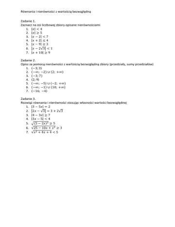 Równania i nierówności z wartością bezwzględną Zadanie 1. Zaznacz na osi liczbowej zbiory opisane nierównościami 1. 2. 3. 4. 5. 6. 7. Zadanie 2. Opisz za pomocą nierówności z wartością bezwzględną zbiory (przedziały, sumy przedziałów) 1. 2. 3. 4. 5. 6. 7. Zadanie 3. Rozwiąż równania i nierówności stosując własności wartości bezwzględnej 1. 2. 3. 4. 5. 6. 7.