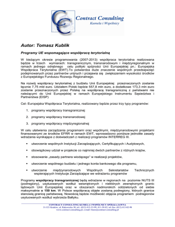 Autor: Tomasz Kublik Programy UE wspomagające współpracę terytorialną W bieŜącym okresie programowania (2007-2013) współpraca terytorialna realizowana będzie w trzech wymiarach: transgranicznym, transnarodowym i międzyregionalnym w ramach jednego odrębnego celu polityki spójności Unii Europejskiej pn.: Europejska Współpraca Terytorialna (EWT).To potwierdza duŜe znaczenie wspólnych przedsięwzięć podejmowanych przez partnerów unijnych i przejawia się zwiększeniem wysokości środków z Europejskiego Funduszu Rozwoju Regionalnego. Na rozwój współpracy terytorialnej z budŜetu Unii Europejskiej przeznaczonych zostanie łącznie 7,75 mld euro. Udziałem Polski będzie 557,8 mln euro, a dodatkowe 173,3 mln euro zostanie przeznaczonych przez Polskę na współpracę transgraniczną z państwami nie naleŜącymi do Unii Europejskiej w ramach Europejskiego Instrumentu Sąsiedztwa i Partnerstwa (EISP) Cel- Europejska Współpraca Terytorialna, realizowany będzie przez trzy typy programów: 1. programy współpracy transgranicznej 2. programy współpracy transnarodowej 3. programy współpracy międzyregionalnej W celu ułatwienia zarządzania programami oraz wspólnymi, międzynarodowymi projektami finansowanymi ze środków EFRR w ramach EWT, wprowadzono poniŜsze jednolite zasady wdraŜania wynikające z doświadczeń z realizacji programów INTERREG III. utworzenie wspólnych Instytucji Zarządzających, Certyfikujących i Audytowych, obowiązkowy udział w projekcie co najmniej dwóch partnerów z róŜnych krajów, stosowanie „zasady partnera wiodącego” w realizacji projektów, utworzenie wspólnego budŜetu i jednego konta bankowego dla programu, utworzenie międzynarodowych Wspólnych Sekretariatów wspierających Instytucje Zarządzające we wdraŜaniu programów Technicznych Programy współpracy transgranicznej będą wdraŜane w regionach na poziomie NUTS III (podregiony), usytuowanych wzdłuŜ wewnętrznych i niektórych zewnętrznych granic lądowych Unii Europejskiej oraz w obszarach nadmorskich oddzielonych od siebie maksymalnie o 150 km. W Polsce współpracą objęte zostaną podregiony, których granice stanowią granicę państwową. Nowością będzie moŜliwość objęcia programem podregionów usytuowanych wzdłuŜ wybrzeŜa Bałtyku. CONTRACT CONSULTING KUMELA I WSPÓLNICY SPÓŁKA JAWNA 31-521 Kraków, ul. Rakowicka 30, tel.: (012) 413-33-99, 411-38-82, tel./fax: (012) 413-02-98 www.contract-consulting.pl, e-mail: [email protected] Głównym celem programów współpracy transgranicznej jest - promowanie współpracy i bezpośrednich kontaktów, wspomaganie rozwoju gospodarczego i społecznego, wspieranie ochrony środowiska, co w konsekwencji przyczynia się do niwelowania róŜnic w poziomach rozwoju między obszarami przygranicznymi a resztą kraju. KaŜdy projekt finansowany w ramach programów transgranicznych powinien sprzyjać budowie wzajemnych powiązań „transgranicznych” pomiędzy samorządami , organizacjami pozarządowymi, instytucjami edukacyjnymi i kulturalnymi. Wspólne działania dotyczyć będą m.in. następujących zagadnień: wspieranie przedsiębiorczości, rozwój małych i średnich przedsiębiorstw, rozwój turystyki, kultury oraz handlu transgranicznego, ochrona dóbr naturalnych i dóbr kultury, zapobieganie zagroŜeniom naturalnym i technologicznym, wspieranie powiązań między obszarami miejskimi i wiejskimi, poprawa dostępu do sieci transportowych, informacyjnych i komunikacyjnych, gospodarka wodna gospodarowanie odpadami systemy energetyczne, rozwój i wspólne wykorzystanie infrastruktury, w szczególności w takich dziedzinach jak ochrona zdrowia, kultura i edukacja, współpraca administracyjna oraz integracja społeczności lokalnych rozwój zasobów ludzkich wspieranie sektora badawczo-rozwojowego. W wyniku dotychczasowych uzgodnień przewidziana została realizacja następujących programów współpracy transgranicznej z udziałem Polski: Polska (Województwo Zachodniopomorskie) – Niemcy (Meklemburgia/Pomorze Przednie - Brandenburgia), Polska (Województwo Lubuskie) – Niemcy (Brandenburgia), Polska (Województwo Dolnośląskie i Lubuskie)– Niemcy (Saksonia), CONTRACT CONSULTING KUMELA I WSPÓLNICY SPÓŁKA JAWNA 31-521 Kraków, ul. Rakowicka 30, tel.: (012) 413-33-99, 411-38-82, tel./fax: (012) 413-02-98 www.contract-consulting.pl, e-mail: [email protected] Polska - Republika Czeska, Polska - Republika Słowacka Polska – Republika Litewska, Południowy Bałtyk (Polska - Szwecja – Dania – Litwa – Niemcy) Polska będzie zarządzała 3 programami: Południowy Bałtyk(Polska - Szwecja – Dania – Litwa – Niemcy), Polska (Województwo Lubuskie)- Niemcy (Brandenburgia), Polska-Republika Słowacka. Potencjalni beneficjenci programów współpracy transgranicznej to przede wszystkim: jednostki samorządu terytorialnego wszystkich szczebli, podmioty i jednostki organizacyjne powoływane lub tworzone przez państwo, wojewodów lub jst w celu świadczenia usług publicznych, pozarządowe organizacje non-profit, izby: gospodarcze, handlowe i rzemieślnicze, szkoły wyŜsze, instytucje publiczne prowadzące działalność edukacyjną, badawczą, instytucje kultury, kościoły i związki wyznaniowe, euroregiony. Współpraca transnarodowa z udziałem Polski będzie realizowana w ramach dwóch programów Europejskiej Współpracy Terytorialnej: Program Regionu Morza Bałtyckiego( Polska, Dania, Estonia, Finlandia, Litwa, Łotwa, Niemcy (wybrane regiony), Szwecja oraz 3 państwa spoza UE: Norwegia,Białoruś (wybrane regiony), Rosja (wybrane regiony)); Program dla Europy Środkowej( Polska, Austria, Czechy, Niemcy (wybrane regiony), Słowacja, Słowenia, Węgry, Włochy (wybrane regiony), Ukraina (wybrane regiony)). CONTRACT CONSULTING KUMELA I WSPÓLNICY SPÓŁKA JAWNA 31-521 Kraków, ul. Rakowicka 30, tel.: (012) 413-33-99, 411-38-82, tel./fax: (012) 413-02-98 www.contract-consulting.pl, e-mai