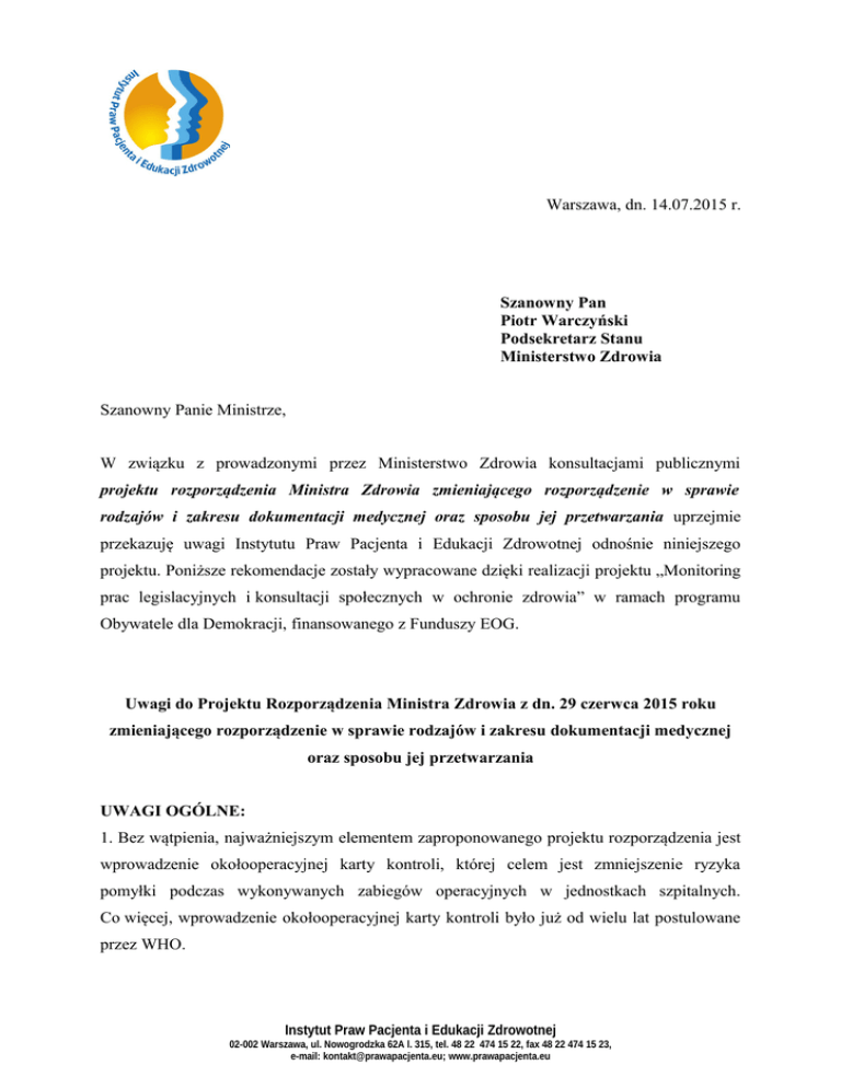 Warszawa, dn. 14.07.2015 r. Szanowny Pan Piotr Warczyński Podsekretarz Stanu Ministerstwo Zdrowia Szanowny Panie Ministrze, W związku z prowadzonymi przez Ministerstwo Zdrowia konsultacjami publicznymi projektu rozporządzenia Ministra Zdrowia zmieniającego rozporządzenie w sprawie rodzajów i zakresu dokumentacji medycznej oraz sposobu jej przetwarzania uprzejmie przekazuję uwagi Instytutu Praw Pacjenta i Edukacji Zdrowotnej odnośnie niniejszego projektu. Poniższe rekomendacje zostały wypracowane dzięki realizacji projektu „Monitoring prac legislacyjnych i konsultacji społecznych w ochronie zdrowia” w ramach programu Obywatele dla Demokracji, finansowanego z Funduszy EOG. Uwagi do Projektu Rozporządzenia Ministra Zdrowia z dn. 29 czerwca 2015 roku zmieniającego rozporządzenie w sprawie rodzajów i zakresu dokumentacji medycznej oraz sposobu jej przetwarzania UWAGI OGÓLNE: 1. Bez wątpienia, najważniejszym elementem zaproponowanego projektu rozporządzenia jest wprowadzenie okołooperacyjnej karty kontroli, której celem jest zmniejszenie ryzyka pomyłki podczas wykonywanych zabiegów operacyjnych w jednostkach szpitalnych. Co więcej, wprowadzenie okołooperacyjnej karty kontroli było już od wielu lat postulowane przez WHO. Instytut Praw Pacjenta i Edukacji Zdrowotnej 02-002 Warszawa, ul. Nowogrodzka 62A l. 315, tel. 48 22 474 15 22, fax 48 22 474 15 23, e-mail: [email protected]; www.prawapacjenta.eu 2. Z wyjątkiem gromadzonej dokumentacji medycznej przebiegu leczenia pacjenta, nie jest jednak jasną pozycja okołooperacyjnej karty kontroli w szeregu mniej lub bardziej doprecyzowanych odrębnymi przepisami (przede wszystkim wewnętrznymi przepisami jednostek szpitalnych) dokumentów: księgi bloku operacyjnego (§33 Rozporządzenia Ministra Zdrowia z dnia 21 grudnia 2010 r. w sprawie rodzajów i zakresu dokumentacji medycznej w zakładach opieki zdrowotnej oraz sposobu jej przetwarzania, Dz.U. Nr 252, poz. 1697 z późn. zm.) oraz protokołu operacyjnego (§15, p. 1, pp. 12 ww. rozporządzenia), który również nie posiada wzoru ogólnego. W wielu blokach operacyjnych Protokół pielęgniarki operacyjnej/instrumentariuszki nazwany jest protokołem operacyjnym. Z drugiej strony, rozporządzenie nie nakłada obowiązku prowadzenia protokołu pielęgniarki operacyjnej w bloku operacyjnym. Istnieje więc prawdopodobieństwo, że wprowadzana niniejszym rozporządzeniem okołooperacyjna karta kontroli zostanie potraktowana jako część protokołu operacyjnego, bez wyraźnych funkcji kontrolnych wobec braku wzorów ogólnych wspomnianych dokumentów. UWAGI SZCZEGÓŁOWE: 1. §20b w projektowanego rozporządzenia jest wadliwie określana jako "okołoperacyjna" karta kontrolna (błąd literowy). 2. §1, p. 3. pp.a) – wprowadzenie okołooperacyjnej karty kontrolnej wymagałoby określenia definicji i zakresu zawartych w rozporządzeniu „niezbędnych czynności okołooperacyjnych”. Ten brak znajduje swoje odzwierciedlenie w następnych zapisach projektu rozporządzenia np.: §20b, p. 3. – W części dotyczącej czynności wykonywanych przez wykonaniem nacięcia brak jest informacji o znieczuleniu (ogólne lub miejscowe) pacjenta i informacji potwierdzającej działania tego znieczulenia. Zakładamy, iż czynności takie jak: podanie pacjentowi znieczulenia i sprawdzenie stanu pacjenta po podaniu znieczulenia, wchodzą w zakres „niezbędnych czynności przedoperacyjnych”. 3. Z uzasadnienia projektu wynika, że zaniechano wprowadzenia zestandaryzowanego wzoru karty z uwagi na odrębności charakteryzujące różne rodzaje operacji w ramach poszczególnych dziedzin medycyny. Jednak z projektowanych przepisów wynika, że chodzi o dane nie dotyczące szczegółów medycznych realizowanego zabiegu operacyjnego (poza jego nazwą), lecz takie, które są tożsame dla każdej operacji, jak np. dane dotyczące osoby Instytut Praw Pacjenta i Edukacji Zdrowotnej 02-002 Warszawa, ul. Nowogrodzka 62A l. 315, tel. 48 22 474 15 22, fax 48 22 474 15 23, e-mail: [email protected]; www.prawapacjenta.eu pacjenta, daty zabiegu, znieczulenia, członków zespołu operacyjnego monitorowania czynności życiowych w trakcie operacji, potwierdzenia jej wykonania etc. Z samej konstrukcji danych zawartych w karcie wymienionych w projektowanym § 20b ust. 1 pkt 1-3 wynika, że dzielą się one na (1) dane dotyczące czynności wykonywanych przed znieczuleniem pacjenta, przed wykonaniem nacięcia oraz przed opuszczeniem bloku operacyjnego. Pominięte są zatem czynności wykonywane w trakcie samej operacji - po wykonaniu nacięcia a przed opatrzeniem rany operacyjnej. Zatem stanowisko, że nie można zestandaryzować karty poprzez normatywne określenie jej wzoru, z powodu odrębności poszczególnych rodzajów operacji, nie znajduje uzasadnienia w treści przepisów określających dane podlegające wpisaniu do karty, bowiem nie dotyczą one samego zabiegu lecz czynności go poprzedzających i mających miejsce po jego zakończeniu. Nic nie stoi na przeszkodzie dla wprowadzenia wzoru karty, a w każdym razie nie uzasadniają tego przyczyny wskazane w uzasadnieniu projektu. Wprowadzenie takiego wzoru ułatwiłoby prowadzenie takich kart w i ujednolicało praktykę ich stosowania. zaniechanie wprowadzenia wzoru karty spowoduje, że każdy podmiot leczniczy obowiązany do stosowania projektowanych przepisów będzie we własnym zakresie interpretował, jakie dane powinny być zawarte w karcie, co obniży jej walor informacyjny dla pacjenta. Sądząc z zakresu danych wskazanych w projektowanym § 20b ust. 2 -4, które dotyczą każdego rodzaju operacji - to rozporządzenie powinno wprowadzać wzór karty. 4. Biorąc pod uwagę w/w uwagi niezrozumiałe jest też dlaczego projektowane rozporządzenie posługuje się pojęciem "w szczególności" w § 20 b ust. 2 in princ., ust. 3 in princ. i ust. 4 in princ., które to sformułowanie - oznaczające "na przykład" - sugeruje, że są jeszcze jaki