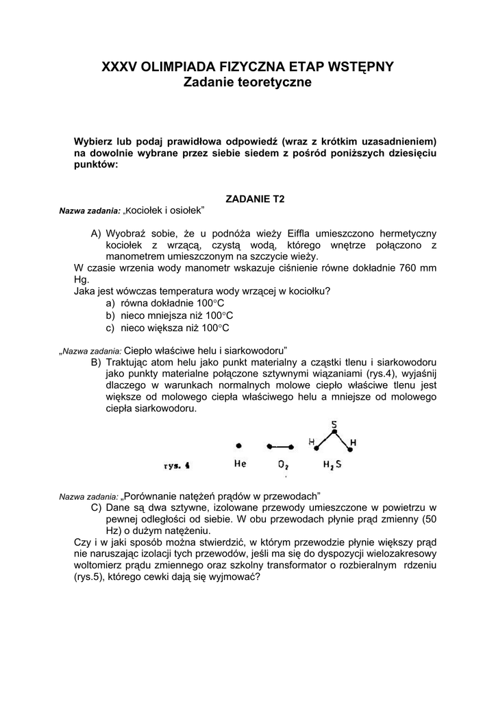 XXXV OLIMPIADA FIZYCZNA ETAP WSTĘPNY Zadanie teoretyczne Wybierz lub podaj prawidłowa odpowiedź (wraz z krótkim uzasadnieniem) na dowolnie wybrane przez siebie siedem z pośród poniższych dziesięciu punktów: ZADANIE T2 Nazwa zadania: „Kociołek i osiołek” A) Wyobraź sobie, że u podnóża wieży Eiffla umieszczono hermetyczny kociołek z wrzącą, czystą wodą, którego wnętrze połączono z manometrem umieszczonym na szczycie wieży. W czasie wrzenia wody manometr wskazuje ciśnienie równe dokładnie 760 mm Hg. Jaka jest wówczas temperatura wody wrzącej w kociołku? a) równa dokładnie 100°C b) nieco mniejsza niż 100°C c) nieco większa niż 100°C „Nazwa zadania: Ciepło właściwe helu i siarkowodoru” B) Traktując atom helu jako punkt materialny a cząstki tlenu i siarkowodoru jako punkty materialne połączone sztywnymi wiązaniami (rys.4), wyjaśnij dlaczego w warunkach normalnych molowe ciepło właściwe tlenu jest większe od molowego ciepła właściwego helu a mniejsze od molowego ciepła siarkowodoru. Nazwa zadania: „Porównanie natężeń prądów w przewodach” C) Dane są dwa sztywne, izolowane przewody umieszczone w powietrzu w pewnej odległości od siebie. W obu przewodach płynie prąd zmienny (50 Hz) o dużym natężeniu. Czy i w jaki sposób można stwierdzić, w którym przewodzie płynie większy prąd nie naruszając izolacji tych przewodów, jeśli ma się do dyspozycji wielozakresowy woltomierz prądu zmiennego oraz szkolny transformator o rozbieralnym rdzeniu (rys.5), którego cewki dają się wyjmować? Nazwa zadania: „Rosół stygnie wolniej” D) Dlaczego gorący, tłuszcz tłusty rosół stygnie w filiżance wolniej niż herbata o tej samej temperaturze początkowej? Nazwa zadania: „Tulejka miedziana na grzejniku” E) Na grzejnik do lutownicy elektrycznej nałożono wypolerowaną tulejkę miedzianą termoparą służącą do pomiaru temperatury. Po początkowym wzroście temperatury tulejki do około 400°C zaobserwowano pewien jej spadek, mimo że zarówno napięcie zasilające grzejnik jak i warunki zewnętrzne nie uległy zmianie. Wyjaśnij przyczynę tego zjawiska. Nazwa zadania: „Gorące kałuże na szosie” F) dlaczego w upalne dni odległe odcinki szosy widziane z samochodu wydają się pokryte kałużami? Nazwa zadania: „Zmiana ciśnienia w naczyniu wypełnionym helem (ciśnieniowe anomalia doniczki)” G) Wnętrze zamkniętego naczynia o porowatych ściankach (np. doniczki) połączono z manometrem cieczowym – rys.6. następnie naczynie nakryto zlewką i napełniono helem. Manometr wykazał początkowo wzrost ciśnienia a następnie jego spadek. Wytłumacz to zjawisko. Nazwa zadania: „Kuchenka elektryczna” H) Element grzejny kuchenki elektrycznej – rurka metalowa zawierająca wewnątrz izolowany przewód oporowy – po dłuższym czasie eksploatacji zaczął wykazywać nierównomierne nagrzewanie się na skutek korozji przewodu oporowego. Czy temperatura elementu grzejnego w miejscach, gdzie korozja przewodu oporowego jest najdalej posunięta, jest najniższa czy wyższa niż w miejscach pozostałych? Nazwa zadania: „Obroty lejka z piaskiem” I) Lejek wypełniony piaskiem zawieszono w sposób umożliwiający jego swobodny (praktycznie bez tarcia) obrót w okuł swej osi – rys.7 – i nadano mu pewną prędkość kontową wokół tej osi. Co będzie się działo w miarę wysypywania się piasku? Nazwa zadania: „Kapilary w wodzie” J) Dwie rurki kapilarne o różnych średnicach zanurzono w wodzie na dwa różne sposoby przedstawione na rys.8. Jakie są wzajemne relacje (jakościowo) wielkości hA, hB oraz HA, HB? ROZWIĄZANIA ZADANIA T2 A) Ciśnienie w kociołku będzie wyższe niż 760 mm Hg o ciśnienie hydrostatyczne słupa powietrza o wysokości około 300 m. Poprawna odpowiedź c. B) Ciepło właściwe jest proporcjonalne do liczby stopni swobody zawartych w 1 molu. Atom helu ma 3 stopnie swobody, cząstka tlenu 5 a cząstka siarkowodoru 6. Mol helu ma więc 3 NA stopni swobody, mol tlenu - 5 NA, a siarkowodoru – 6 NA, gdzie NA jest liczbą Avogadry; mamy 3 NA < 5NA< 6 NA C) Wyjmujemy jedną z cewek z rdzenia, drugą podłączymy do woltomierza. Następnie zamykamy obwód magnetyczny wokół przewodu z prądem (rys.) i mierzymy indukowane napięcie, które będzie tym wyższe im wyższy prąd płynie przez przewód. Tak działają tzw. amperomierze cęgowe. D) Na rosole zwykle jest warstwa tłuszczu utrudniająca parowanie i utratę ciepła wskutek tego procesu. E) W podwyższonej temperaturze powierzchnia miedzi pokrywa się cienkim nalotem tlenków. Powoduje to zwiększenie współczynnika emisji tulejki a zatem zwiększenie mocy traconej przez nią na promieniowanie, co powoduje obniżenie jej temperatury. F) W opisanej sytuacji temperatura cienkiej warstwy powietrza tuż przy asfalcie jest większa niż temperatura warstw wyższych. W związku z tym współczynnik załamania powietrza tuż przy asfalcie jest mniejszy niż w warstwach wyższych i przy patrzeniu prawie stycznym, wskutek całkowitego wewnętrznego odbicia, obserwujemy na asfalcie obrazy odbitego (w stykającym się z nim powietrzu) nieba, przypominające kałuże. G) Lekkie atomy He mają większą średnią prędkość termiczną od cząstek O2 i N2 dyfundują szybciej do wnętrza naczynia niż cząstki powietrza na zewnątrz. W rezultacie w naczyniu obserwuje się przejściowy wzrost ciśnienia. H) W miejscach zaatakowanych przez korozję przewód staje się cieńszy a tym samym w miejscach tych jego oporność (na jednostkę długości) wzrasta. Przy tym samym prądzie (a w całym przewodzie płynie prąd o tym samym natężeniu) więcej ciepła wydziela się na większym oporze: Q ~ i2R. I) W miarę zbliżania się piasku ku środkowi zmniejsza się moment bezwładności lejka z piaskiem a jego prędkość kątowa wzrasta (zasada zachowania momentu pędu). J) Wysokości hA i hB powinny być równe, gdyż obecność 