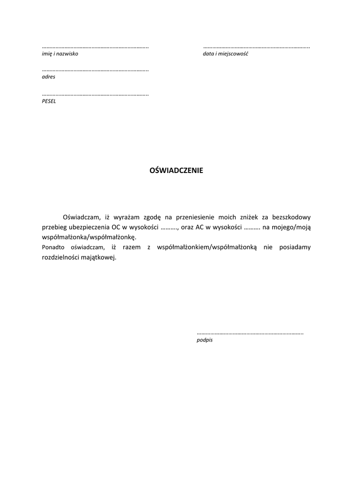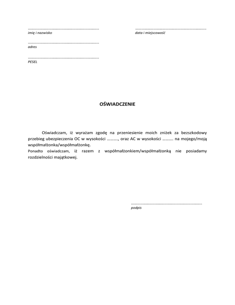 …………………………………………………………….. …………………………………………………………….. imię i nazwisko data i miejscowość …………………………………………………………….. adres …………………………………………………………….. PESEL OŚWIADCZENIE Oświadczam, iż wyrażam zgodę na przeniesienie moich zniżek za bezszkodowy przebieg ubezpieczenia OC w wysokości ………., oraz AC w wysokości ………. na mojego/moją współmałżonka/współmałżonkę. Ponadto oświadczam, iż razem z współmałżonkiem/współmałżonką nie posiadamy rozdzielności majątkowej. …………………………………………………………….. podpis