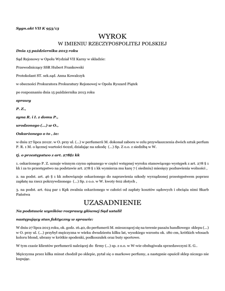 Sygn.akt VII K 953/13 WYROK W IMIENIU RZECZYPOSPOLITEJ POLSKIEJ Dnia 15 października 2013 roku Sąd Rejonowy w Opolu Wydział VII Karny w składzie: Przewodniczący SSR Hubert Frankowski Protokolant ST. sek.sąd. Anna Kowalczyk w obecności Prokuratora Prokuratury Rejonowej w Opolu Ryszard Piątek po rozpoznaniu dnia 15 października 2013 roku sprawy P. Z., syna R. i I. z domu P., urodzonego (...) w O., Oskarżonego o to , że: w dniu 27 lipca 2012r. w O. przy ul. (...) w perfumerii M. dokonał zaboru w celu przywłaszczenia dwóch sztuk perfum P. R. 1 M. o łącznej wartości 602zł, działając na szkodę (...) Sp. Z o.o. z siedzibą w W. tj. o przestępstwo z art. 278§1 kk 1. oskarżonego P. Z. uznaje winnym czynu opisanego w części wstępnej wyroku stanowiącego występek z art. 278 § 1 kk i za to przestępstwo na podstawie art. 278 § 1 kk wymierza mu karę 7 ( siedmiu) miesięcy pozbawienia wolności , 2. na podst. art. 46 § 1 kk zobowiązuje oskarżonego do naprawienia szkody wyrządzonej przestępstwem poprzez zapłatę na rzecz pokrzywdzonego (...) Sp. z o.o. w W. kwoty 602 złotych , 3. na podst. art. 624 par 1 Kpk zwalnia oskarżonego w całości od zapłaty kosztów sądowych i obciąża nimi Skarb Państwa UZASADNIENIE Na podstawie wyników rozprawy głównej Sąd ustalił następujący stan faktyczny w sprawie: W dniu 27 lipca 2013 roku, ok. godz. 16.40, do perfumerii M. mieszczącej się na terenie pasażu handlowego sklepu (...) w O. przy ul. (...) przybył mężczyzna w wieku dwudziestu kilku lat, wysokiego wzrostu ok. 180 cm, krótkich włosach koloru blond, ubrany w krótkie spodenki, podkoszulek oraz buty sportowe. W tym czasie klientów perfumerii należącej do firmy (...) sp. z o.o. w W-wie obsługiwała sprzedawczyni E. G.. Mężczyzna przez kilka minut chodził po sklepie, pytał się o markowe perfumy, a następnie opuścił sklep niczego nie kupując. Po około 10 minutach do perfumerii wbiegł ten sam mężczyzna, zabierając z półki mieszczącej się najbliżej wyjścia ze sklepu dwie sztuki perfum m-ki P. (...) M. o łącznej wartości 602,00 zł, działając na szkodę (...) sp. z o.o. w W-wie. Sprzedawczyni nie udało się zatrzymać mężczyzny, który oddalił się w nieustalonym bliżej kierunku i to pomimo niezwłocznego powiadomienia Policji, która dokonała penetracji pobliskich ulic z wynikiem negatywnym. W toku czynności wyjaśniających Policja zabezpieczyła i poddała oględzinom zapis monitoringu galerii handlowej sklepu (...) w O. przy ul. (...), z którego wynikało, że sprawcą kradzieży był dobrze znany organom ścigania z kradzieży sklepowych P. Z., który w toku dalszych czynności przyznał, że w dniu 27 lipca 2013r. dopuścił się kradzieży perfum. Dowód: • k. 2-3, 61: zeznania świadka E. G., • k. 7-9: protokół zatrzymania rzeczy, • k. 10-11: dokumentacja fotograficzna z zapisu monitoringu, • k. 6: płyta (...) z zapisem monitoringu, • k. 35-36, 61: wyjaśnienia oskarżonego P. Z., P. Z. ma 21 lat, jest stanu wolnego, ma jedno małoletnie dziecko. Posiada wykształcenie gimnazjalne, nie ma wyuczonego zawodu. Nie posiada dochodów ani majątku. Aktualnie odbywa karę pozbawienia wolności orzeczoną w innej sprawie. P. Z. był wielokrotnie sądownie karany, przede wszystkim za przestępstwa p-ko mieniu. Dowód: • k. 37: dane osobopoznawcze, • k. 20-23, 55-57: dane o karalności, • k. 27-38: odpisy wyroków, P. Z. przyznał się w toku postępowania przygotowawczego do zarzucanego mu czynu i skorzystał z przysługującego mu prawa odmowy składania wyjaśnień. Przed Sądem podtrzymał swoje stanowisko procesowe, składając zwięzłe wyjaśnienia zgodne z poczynionymi ustaleniami, a następnie, po pouczeniu o treści art. 387 Kpk, złożył wniosek o skazanie bez przeprowadzania postępowania dowodowego, któremu nie sprzeciwił się prokurator, ani pokrzywdzony zawiadomiony o terminie rozprawy i pouczony o prawie złożenia takiego wniosku przez oskarżonego. /k. 11-12, 61/ Sąd Rejonowy zważył w sprawie, co następuje : W świetle zebranego w sprawie materiału dowodowego zarówno sprawstwo jak i wina oskarżonego P. Z. w odniesieniu do zarzucanego mu czynu zabronionego nie budziły żadnych wątpliwości, w wyniku czego wniosek oskarżonego o skazanie bez przeprowadzania postępowania dowodowego, przy spełnieniu pozostałych przesłanek z art. 387 Kpk, zasługiwał na uwzględnienie. Dokonując ustaleń faktycznych Sąd oparł się na dowodach osobowych w postaci zeznań świadka – pracownika sklepu w osobie E. G., a także dowodach z dokumentów, w szczególności zaś dokumentacji z zapisu monitoringu, wreszcie zaś na wyjaśnieniach samego oskarżonego, który swego sprawstwa nie kwestionował, składając w tej mierze stosowne wyjaśnienia. Przedstawione dowody wzajemnie ze sobą korespondowały, dając podstawy do prawidłowych ustaleń faktycznych, a tym samym niewątpliwego sprawstwa oskarżonego. Tak zatem reasumując, w ocenie Sądu, przedstawiony wyżej materiał dowodowy dawał podstawy do przypisania oskarżonemu zarzucanego mu przestępstwa, wyczerpującego znamiona występku z art. 278 § 1 Kk. Przestępstwa z art. 278 § 1 Kk dopuszcza się ten, kto zabiera w celu przywłaszczenia cudzą rzecz ruchomą. Przestępstwo kradzieży mienia jest przestępstwem powszechnym, co oznacza, że może być popełnione przez każdy podmiot zdatny do ponoszenia odpowiedzialności karnej. Przedmiotem ochrony czynu zabronionego stypizowanego treścią art. 278 § 1 Kk jest własność, posiadanie oraz inne prawa rzeczowe i obligacyjne do przede wszystkim rzeczy ruchomej, a więc przedmiotów materialnych, wyodrębnionych i mogących samodzielnie występować w obrocie oraz przedstawiających wartość majątkową. Przedmiotem bezpośredniego działania sprawcy czynu zabronionego z art. 278 § 1 Kk jest przede wszystkim rzecz ruchoma, a więc przedmiot materialny, wyodrębniony, mogący samodzie