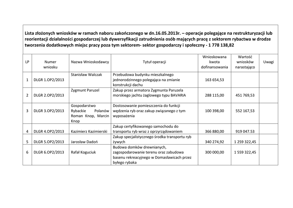 Lista złożonych wniosków w ramach naboru zakończonego w dn.16.05.2013r. – operacje polegające na restrukturyzacji lub reorientacji działalności gospodarczej lub dywersyfikacji zatrudnienia osób mających pracę z sektorem rybactwa w drodze tworzenia dodatkowych miejsc pracy poza tym sektorem- sektor gospodarczy i społeczny - 1 778 138,82 LP Numer wniosku Nazwa Wnioskodawcy Stanisław Walczak 1 DLGR 1.OP2/2013 Zygmunt Paruzel 2 DLGR 2.OP2/2013 3 DLGR 3.OP2/2013 4 DLGR 4.OP2/2013 5 DLGR 5.OP2/2013 6 DLGR 6.OP2/2013 Tytuł operacji Przebudowa budynku mieszkalnego jednorodzinnego polegająca na zmianie konstrukcji dachu Zakup przez armatora Zygmunta Paruzela morskiego jachtu żaglowego typu BAVARIA Gospodarstwo Dostosowanie pomieszczenia do funkcji Rybackie Polanów wędzenia ryb oraz zakup związanego z tym Roman Knop, Marcin wyposażenia Knop Zakup certyfikowanego samochodu do Kazimierz Kazimierski transportu ryb wraz z oprzyrządowaniem Zakup specjalistycznego środka transportu ryb Jarosław Dadoń żywych Budowa domków drewnianych, Rafał Koguciuk zagospodarowanie terenu oraz zabudowa basenu rekreacyjnego w Domasławicach przez byłego rybaka Wnioskowana kwota dofinansowania Wartość wniosków narastająco 163 654,53 288 115,00 451 769,53 100 398,00 552 167,53 366 880,00 919 047.53 340 274,92 1 259 322,45 300 000,00 1 559 322,45 Uwagi 7 8 DLGR 7.OP2/2013 DLGR 8.OP2/2013 Anna Skowrońska Krzysztof Olbryś 9 DLGR 9.OP2/2013 Zdzisław Maruszczyk 10 DLGR 10.OP2/2013 Baltic Net Sp z o.o. 11 DLGR 11.OP2/2013 Rafał Bocheński 12 DLGR 12.OP2/2013 13 DLGR 13.OP2/2013 Paweł Głodowski 14 DLGR 14.OP2/2013 Marek Sochoń Jarosław Jastrzębski Zakup samochodu dostawczego – chłodni- do przewozu ryb wędzonych z własnej wędzarni – celem promocji i sprzedaży produktów wyprodukowanych w regionie Nadbudowa istniejącego budynku o kolejne piętro z pokojami na wynajem Budowa budynku usługowo (sklep motoryzacyjny) –garażowego w miejscowości Darłowo Restrukturyzacja działalności gospodarczej Baltic Net Sp z o.o. w zakresie produkcji siatek sportowych i ochronnych Restrukturyzacja działalności gospodarczej firmy „Rafał Bocheński sprzedaż ryb morskich” Stworzenie „Leśnej Enklawy” poprzez przeprowadzenie prac budowlanych w gospodarstwie Budowa budynku usług turystycznych w miejscowości Darłowo wraz z zagospodarowaniem terenu Wyposażenie statku PILOT 55 w sprzęt trollingowy 62 076,00 1 621 398,45 84 089,53 1 705 487,98 179 097,81 1 884 585,79 64 258,12 1 948 843,91 105 364,39 2 054 208,30 300 000,00 2 354 208,30 395 724,55 2 749 932,85 11 349,76 2 761 282,61