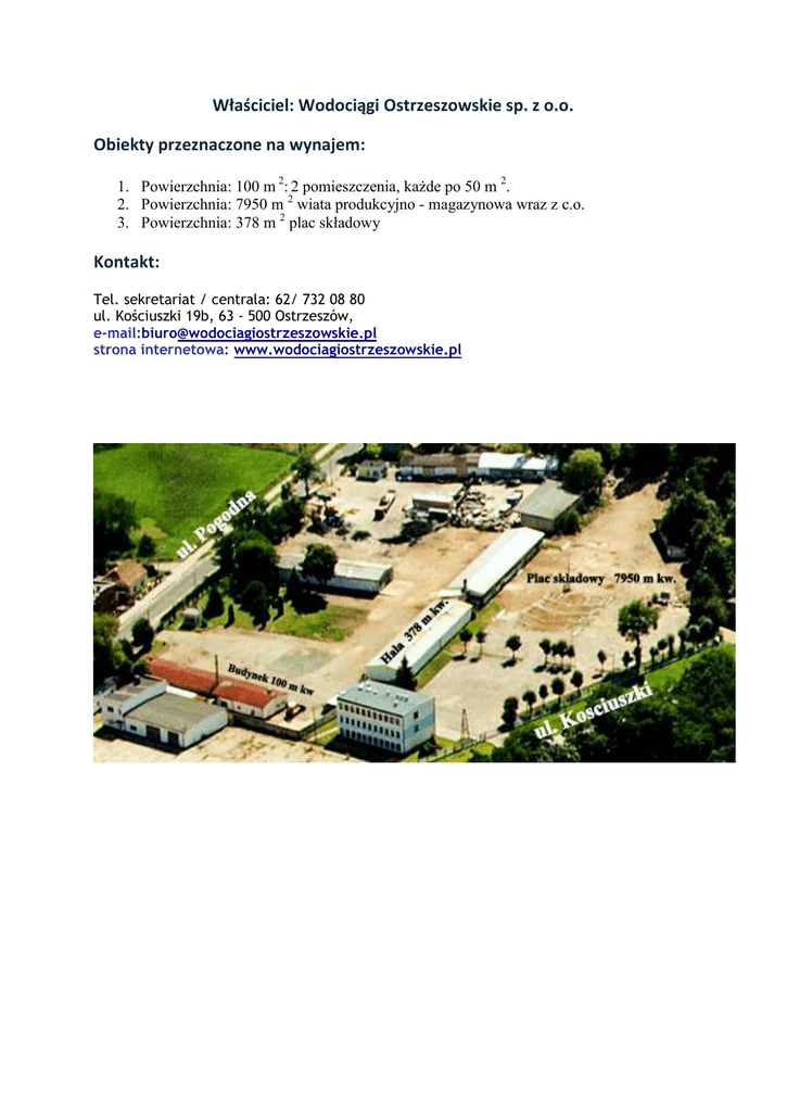 Właściciel: Wodociągi Ostrzeszowskie sp. z o.o. Obiekty przeznaczone na wynajem: 1. Powierzchnia: 100 m 2: 2 pomieszczenia, każde po 50 m 2. 2. Powierzchnia: 7950 m 2 wiata produkcyjno - magazynowa wraz z c.o. 3. Powierzchnia: 378 m 2 plac składowy Kontakt: Tel. sekretariat / centrala: 62/ 732 08 80 ul. Kościuszki 19b, 63 - 500 Ostrzeszów, e-mail:[email protected] strona internetowa: www.wodociagiostrzeszowskie.pl
