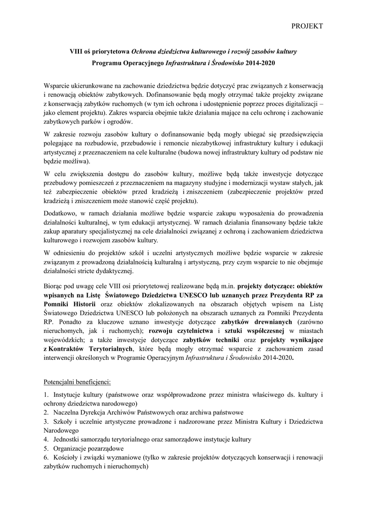 PROJEKT VIII oś priorytetowa Ochrona dziedzictwa kulturowego i rozwój zasobów kultury Programu Operacyjnego Infrastruktura i Środowisko 2014-2020 Wsparcie ukierunkowane na zachowanie dziedzictwa będzie dotyczyć prac związanych z konserwacją i renowacją obiektów zabytkowych. Dofinansowanie będą mogły otrzymać także projekty związane z konserwacją zabytków ruchomych (w tym ich ochrona i udostępnienie poprzez proces digitalizacji – jako element projektu). Zakres wsparcia obejmie także działania mające na celu ochronę i zachowanie zabytkowych parków i ogrodów. W zakresie rozwoju zasobów kultury o dofinansowanie będą mogły ubiegać się przedsięwzięcia polegające na rozbudowie, przebudowie i remoncie niezabytkowej infrastruktury kultury i edukacji artystycznej z przeznaczeniem na cele kulturalne (budowa nowej infrastruktury kultury od podstaw nie będzie możliwa). W celu zwiększenia dostępu do zasobów kultury, możliwe będą także inwestycje dotyczące przebudowy pomieszczeń z przeznaczeniem na magazyny studyjne i modernizacji wystaw stałych, jak też zabezpieczenie obiektów przed kradzieżą i zniszczeniem (zabezpieczenie projektów przed kradzieżą i zniszczeniem może stanowić część projektu). Dodatkowo, w ramach działania możliwe będzie wsparcie zakupu wyposażenia do prowadzenia działalności kulturalnej, w tym edukacji artystycznej. W ramach działania finansowany będzie także zakup aparatury specjalistycznej na cele działalności związanej z ochroną i zachowaniem dziedzictwa kulturowego i rozwojem zasobów kultury. W odniesieniu do projektów szkół i uczelni artystycznych możliwe będzie wsparcie w zakresie związanym z prowadzoną działalnością kulturalną i artystyczną, przy czym wsparcie to nie obejmuje działalności stricte dydaktycznej. Biorąc pod uwagę cele VIII osi priorytetowej realizowane będą m.in. projekty dotyczące: obiektów wpisanych na Listę Światowego Dziedzictwa UNESCO lub uznanych przez Prezydenta RP za Pomniki Historii oraz obiektów zlokalizowanych na obszarach objętych wpisem na Listę Światowego Dziedzictwa UNESCO lub położonych na obszarach uznanych za Pomniki Prezydenta RP. Ponadto za kluczowe uznano inwestycje dotyczące zabytków drewnianych (zarówno nieruchomych, jak i ruchomych); rozwoju czytelnictwa i sztuki współczesnej w miastach wojewódzkich; a także inwestycje dotyczące zabytków techniki oraz projekty wynikające z Kontraktów Terytorialnych, które będą mogły otrzymać wsparcie z zachowaniem zasad interwencji określonych w Programie Operacyjnym Infrastruktura i Środowisko 2014-2020. Potencjalni beneficjenci: 1. Instytucje kultury (państwowe oraz współprowadzone przez ministra właściwego ds. kultury i ochrony dziedzictwa narodowego) 2. Naczelna Dyrekcja Archiwów Państwowych oraz archiwa państwowe 3. Szkoły i uczelnie artystyczne prowadzone i nadzorowane przez Ministra Kultury i Dziedzictwa Narodowego 4. Jednostki samorządu terytorialnego oraz samorządowe instytucje kultury 5. Organizacje pozarządowe 6. Kościoły i związki wyznaniowe (tylko w zakresie projektów dotyczących konserwacji i renowacji zabytków ruchomych i nieruchomych) PROJEKT 7. Podmioty zarządzające obiektami indywidualnie wpisanymi na Listę Światowego Dziedzictwa UNESCO inne niż wymienione w punktach 1-6 W przypadku beneficjentów wymienionych w punkcie 4 - 7 możliwa jest realizacja wyłącznie: a. projektów dotyczących obiektów wpisanych na Listę Światowego Dziedzictwa UNESCO lub uznanych przez Prezydenta RP za Pomniki Historii lub zlokalizowanych na obszarach objętych wpisem na Listę Światowego Dziedzictwa UNESCO lub położonych na obszarach uznanych za Pomniki Prezydenta RP. b. projektów mieszczących się w zakresie niżej wymienionych obszarów tematycznych: - projektów dotyczących konserwacji, restauracji, rewaloryzacji zabytków drewnianych (zarówno nieruchomych, jak i ruchomych); - projektów dotyczących rozwoju czytelnictwa w miastach wojewódzkich; - projektów dotyczących rozwoju sztuki współczesnej w miastach wojewódzkich; - projektów dotyczących konserwacji, restauracji, rewaloryzacji, adaptacji na cele kulturalne oraz zabezpieczenia przed kradzieżą i zniszczeniem ruchomych i nieruchomych zabytków techniki; c. projektów wynikających z Kontraktów Terytorialnych.