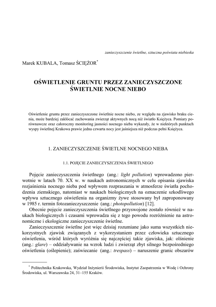 zanieczyszczenie świetlne, sztuczna poświata niebieska Marek KUBALA, Tomasz ŚCIĘŻOR* OŚWIETLENIE GRUNTU PRZEZ ZANIECZYSZCZONE ŚWIETLNIE NOCNE NIEBO Oświetlenie gruntu przez zanieczyszczone świetlnie nocne niebo, ze względu na zjawisko braku cienia, może bardziej zakłócać zachowania zwierząt aktywnych nocą niż światło Księżyca. Pomiary porównawcze oraz całoroczny monitoring jasności nocnego nieba wykazały, że w niektórych punktach wyspy świetlnej Krakowa prawie jedna czwarta nocy jest jaśniejsza niż podczas pełni Księżyca. 1. ZANIECZYSZCZENIE ŚWIETLNE NOCNEGO NIEBA 1.1. POJĘCIE ZANIECZYSZCZENIA ŚWIETLNEGO Pojęcie zanieczyszczenia świetlnego (ang.: light pollution) wprowadzono pierwotnie w latach 70. XX w. w naukach astronomicznych w celu opisania zjawiska rozjaśnienia nocnego nieba pod wpływem rozpraszania w atmosferze światła pochodzenia ziemskiego, natomiast w naukach biologicznych na oznaczenie szkodliwego wpływu sztucznego oświetlenia na organizmy żywe stosowany był zaproponowany w 1985 r. termin fotozanieczyszczenie (ang.: photopollution) [12]. Obecnie pojęcie zanieczyszczenia świetlnego przyswojone zostało również w naukach biologicznych i czasami wprowadza się z tego powodu rozróżnienie na astronomiczne i ekologiczne zanieczyszczenie świetlne. Zanieczyszczenie świetlne jest więc dzisiaj rozumiane jako suma wszystkich niekorzystnych zjawisk związanych z wykorzystaniem przez człowieka sztucznego oświetlenia, wśród których wyróżnia się najczęściej takie zjawiska, jak: olśnienie (ang.: glare) – oddziaływanie na wzrok ludzi i zwierząt zbyt silnego bezpośredniego oświetlenia (oślepienie); zaświecanie (ang.: trespass) – naruszenie granic obszarów __________ * Politechnika Krakowska, Wydział Inżynierii Środowiska, Instytut Zaopatrzenia w Wodę i Ochrony Środowiska, ul. Warszawska 24, 31–155 Kraków. 302 M. KUBALA, T. ŚCIĘŻOR sąsiednich do terenu oświetlanego (np. zaświecanie okien budynków mieszkalnych sąsiadujących z terenem oświetlanym czy zaświecanie pobliskich terenów chronionych) oraz poświatę niebieską (ang.: sky glow) – świecenie nocnego nieba poprzez rozpraszanie światła na składnikach atmosfery. Ponieważ jednak poświatę niebieską rozumie się czasami jako sumę zjawisk składających się na świecenie nocnego nieba światłem rozproszonym (także naturalnych), więc czynnik sztuczny nazywany jest sztuczną poświatą niebieską (ang.: artificial sky glow) i to zjawisko możemy utożsamiać ze skutkami zanieczyszczenia świetlnego nocnego nieba. 1.2. ODDZIAŁYWANIE ZANIECZYSZCZENIA ŚWIETLNEGO NOCNEGO NIEBA NA ORGANIZMY ŻYWE W literaturze przedmiotu [3, 6, 7, 9, 11] prawie nie spotyka się publikacji dotyczących wpływu sztucznej poświaty niebieskiej na organizmy żywe. Związane jest to prawdopodobnie z faktem, że dominuje przekonanie o mniejszym wpływie sztucznej poświaty niebieskiej na zdrowie i zachowanie organizmów żywych, w porównaniu z innymi przejawami zanieczyszczenia świetlnego, co jest słuszne, gdy mamy do czynienia z oddziaływaniem tych drugich czynników. Jednakże badania wpływu światła księżycowego na zachowanie się zwierząt [1, 2, 4, 5] pozwalają przypuszczać, że w warunkach małego natężenia światła taki wpływ może być znaczny i niektóre doniesienia to potwierdzają [8]. Zagadnienie to jest o tyle istotne, że, w odróżnieniu od pozostałych czynników zanieczyszczenia świetlnego, wpływ sztucznej poświaty niebieskiej na ekosystemy jest najtrudniejszy do wyeliminowania, gdyż często światło rozproszone w atmosferze dociera z odległych źródeł. Dodatkowym niekorzystnym czynnikiem jest fakt, iż jest to światło emitowane przez całe niebo, nie dając wyraźnego cienia. Celem badań było oszacowanie wpływu zanieczyszczenia świetlnego nocnego nieba na ekosystemy poprzez porównanie oświetlenia gruntu przez tak zanieczyszczone nocne niebo z oświetleniem przez światło Księżyca, zarówno ze względu na intensywność zjawiska, jak i ze względu na skalę czasową. 2. POMIARY 2.1. POMIARY JASNOŚCI NOCNEGO NIEBA Pomiary jasności nocnego nieba, które w niniejszej pracy wykorzystano do analizy ilościowej, prowadzone były w ramach szerszego projektu, mającego za zadanie wyznaczenie granic wyspy świetlnej aglomeracji krakowskiej i określenie zależności Oświetlenie gruntu przez zanieczyszczone świetlnie nocne niebo 303 jasności nocnego nieba od czynników atmosferycznych [10]. Pomiary wykonywano miernikiem jasności nocnego nieba (SQM – Sky Quality Meter firmy Unihedron), wyskalowanym w astronomicznych jednostkach jasności powierzchniowej Sa – magnitudo na sekundę łuku do kwadratu (mag/arcsec2). Ze względu na pochodzenie tej skali, jest ona skalą odwrotną i logarytmiczną, a jej związek z jednostkami układu SI (cd/m2) wyraża się wzorem [10]: [cd/m2] = 108000∙10^(–0,4∙[mag/arcsec2]) (1) Pomiary miernikiem SQM były prowadzone na dziesięciu stanowiskach w obrębie aglomeracji krakowskiej – sześciu w granicach miasta, dwu poza jego obrzeżami oraz dwu bardziej oddalonych. Na każdym stanowisku starano się wykonywać pomiary codziennie, w każdych warunkach pogodowych, około północy. Odnotowywany był czas pomiaru, ocena stopnia zachmurzenia i zamglenia oraz inne okoliczności mogące mieć wpływ na pomiar (np. faza i położenie Księżyca, stan pokrywy śnieżnej, rodzaj chmur itp.). Każdy pomiar składał się z serii przynajmniej pięciu odczytów, z których średnią zapisywano z dokładnością do 0,1 mag/arcsec2. Pomiar wykonywany był miernikiem skierowanym w stronę zenitu, w miejscu, gdzie sztuczne oświetlenie nie docierało bezpośrednio i gdzie obszar nieba, z którego zbierane było światło (w kącie do 20° od osi miernika), nie był przysłonięty żadnymi przeszkodami. 2.2. POMIARY OŚWIETLENIA GRUNTU PRZEZ ZANIECZYSZCZONE ŚWIETLNIE NOCNE NIEBO Pomiary oświetl