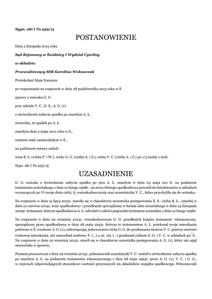 Sygn. akt I Ns 959/15 POSTANOWIENIE Dnia 2 listopada 2015 roku Sąd Rejonowy w Świdnicy I Wydział Cywilny w składzie: Przewodniczący SSR Karolina Wołoszczuk Protokolant Maja Foremny po rozpoznaniu na rozprawie w dniu 28 października 2015 roku w Ś. sprawy z wniosku G. G. przy udziale V. C., E. S., A. G. (1) o stwierdzenie nabycia spadku po zmarłym A. Ł. stwierdza, że spadek po A. Ł. zmarłym dnia 5 maja 2011 roku w S., ostatnio stale zamieszkałym w Ś., na podstawie ustawy nabyli: żona B. Ł. (córka P. i W.), córka G. G. (córka A. i Z.), córka V. C. (córka A. i Z.) po 1/3 każda z nich. Sygn. akt I Ns 959/15 UZASADNIENIE G. G. wniosła o stwierdzenie nabycia spadku po ojcu A. Ł. zmarłym w dniu 05 maja 201 lr. na podstawie testamentu notarialnego z dnia 10 lutego 1998r., na mocy którego spadkodawca powołał do dziedziczenia w udziałach wynoszących po Vi swoje dwie córki, tj. wnioskodawczynię oraz uczestniczkę V. C., która przychyliła się do wniosku. Na rozprawie w dniu 15 lipca 2015r. stawiła się w charakterze uczestnika postępowania E. S.- córka B. Ł.- zmarłej w dniu 12 czerwca 2014r. żony spadkodawcy i przedłożyła sporządzony w formie aktu notarialnego w dniu 23 listopada 2009r. testament, którym spadkodawca A. Ł. odwołał w całości poprzedni testament notarialny z dnia 10 lutego 1998r. Na rozprawie w dniu 02 września 2015r. wnioskodawczym G. G. przedłożyła kolejny testament- własnoręczny, sporządzony przez spadkodawcę w dniu 28 maja 1993r. którym to testamentem A. Ł. przekazał swoje mieszkanie położone w Ś. wnukowi A. G. (1), zobowiązując jednocześnie córkę G. G. do przekazania siostrze V. C. połowę wartości rynkowej mieszkania, zaś samochód osobowy F. (...) o nr. rej. (...) przekazał córkom G. G. i V. C. w udziałach po lA . Na rozprawie w dniu 02 września 2015r. stawił się w charakterze uczestnika postępowania A. G. (1), który nie zajął stanowiska w sprawie, Pismem procesowym z dnia 09 września 2015r. pełnomocnik uczestniczki V. C. wniósł o stwierdzenie nabycia spadku po zmarłym A. Ł. na podstawie testamentu własnoręcznego z dnia 28 maja 1993r. przez A. G. (1), V. C. i G. G., w częściach odpowiadających stosunkowi wartości przyznanych im składników majątku spadkowego. Pełnomocnik uczestniczki E. S. pismem procesowym z dnia 04 września 2015r. wniósł o stwierdzenie nabycia spadku po zmarłym A. Ł. na podstawie ustawy, tj. przez żonę B. Ł. i córki G. G. oraz V. C. w udziałach wynoszących po 1/3. Sąd ustalił następujący stan faktyczny: A. Ł. zmarł 05 maja 201 lr. roku w S., przed śmiercią stale mieszkał w Ś.. Spadkodawca w chwili zgonu był żonaty z B. Ł., z domu Z., z którą zawarł związek małżeński w dniu 12 września 2009r. Dowód: • odpis skrócony aktu zgonu- k. 9; • odpis skrócony aktu małżeństwa nr (...)k. 27; • zapewnienia spadkowe stron- k. 32, 39v. Spadkodawca pozostawił dwójkę dzieci z pierwszego małżeństwa: córki G. G. i V. C.. Innych dzieci pozamałżeńskich ani przysposobionych nie posiadał. Dowód: • odpis skrócony aktu małżeństwa wnioskodawczym nr (...)- k. 8; • odpis skrócony aktu małżeństwa uczestniczki nr (...) - k. 17; • zapewnienia spadkowe stron- k. 32, 39v. W dniu 28 maja 1993r. zmarły A. Ł. sporządził własnoręczny testament, w którym mieszkanie położone w Ś. przekazał swojemu wnukowi A. G. (1) zobowiązując jednocześnie matkę A. G. (2) G. do zapłaty połowy wartości mieszkania swojej siostrze a córce spadkodawcy V. C., natomiast samochód osobowy m- ki F. (...) przekazał swoim córkom G. G. i V. C. w udziałach wynoszących po Vz. Dowód: • zapewnienie spadkowe wnioskodawczym- k. 39v; • testament- k. 37. W dniu 10 lutego 1998r. w kancelarii notarialnej w Ś. A. Ł. sporządził testament, w którym powołał do dziedziczenia swoje córki G. G. i V. C. w udziałach wynoszących po Vz. Dowód: • testament- k. 7; • zapewnienie spadkowe wnioskodawczym i uczestniczki Y. M.- C.- k. 32, 39v. W dniu 23 listopada 2009r. w kancelarii notarialnej w Ś. A. Ł. odwołał poprzednio sporządzony w formie aktu notarialnego testament z dnia 10 lutego 1998r. Dowód: • testament- k. 28; • zapewnienie spadkowe uczestniczki E. S.- k. 32. W dniu 12 czerwca 2014r. w Ś. zmarła żona spadkodawcy B. Ł. z domu Z.. Dowód: • odpis skrócony aktu zgonu nr 425/2014- k. 25. Na dzień sporządzania testamentu własnoręcznego, tj. 28 maja 1993r. majątek spadkowy A. Ł. obejmował mieszkanie położone w Ś. o wartości 120 000 zł oraz samochód osobowy m-ki F. (...) o wartości 4 000 zł. Bezsporne. Sąd zważył, co następuje: Wniosek podlegał uwzględnieniu w zakresie stwierdzenia nabycia spadku po zmarłym A. Ł., jednakże nie na podstawie testamentu, a w oparciu o przepisy o dziedziczeniu ustawowym. Zgodnie z art. 926 § 1 kc powołanie do spadku wynika z ustawy albo z testamentu. Stosownie zaś do treści art. 926 § 2 kc dziedziczenie ustawowe co do całości spadku następuje wtedy, gdy spadkodawca nie powołał spadkobiercy albo gdy żadna z osób, które powołał, nie chce lub nie może być spadkobiercą. W niniejszej sprawie ujawniono w istocie trzy testamenty: pierwszy własnoręcznie sporządzony przez spadkodawcę, podpisany i opatrzony datą w dniu 28 maja 1993r., drugi sporządzony w formie aktu notarialnego w dniu 10 lutego 1998r., w którym do spadku A. Ł. powołał swoje dwie córki, tj. wnioskodawczynię i uczestniczkę V. C. w udziałach po 1/2 oraz trzeci, również sporządzony przed notariuszem w dniu 23 listopada 2009r., którym A. Ł. odwołał w całości poprzednio sporządzony testament notarialny z dnia 10 lutego 1998r. Jako, że wnioskodawczym i uczestnicy nie kwestionowali żadnego z trzech ujawnionych w toku przewodu sądowego testamentów, zaś ostatnie oświadczenie spadkodawcy nie zawierało innych rozrządzeń na wypadek po śmierci, poza tym, że odwołało testam
