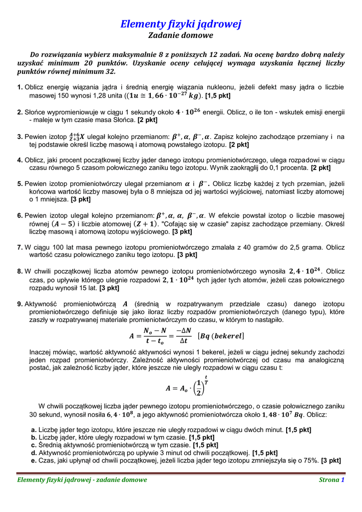 Elementy fizyki jądrowej Zadanie domowe Do rozwiązania wybierz maksymalnie 8 z poniższych 12 zadań. Na ocenę bardzo dobrą należy uzyskać minimum 20 punktów. Uzyskanie oceny celującej wymaga uzyskania łącznej liczby punktów równej minimum 32. 1. Oblicz energię wiązania jądra i średnią energię wiązania nukleonu, jeżeli defekt masy jądra o liczbie masowej 150 wynosi 1,28 unita ( . [1,5 pkt] 2. Słońce wypromieniowuje w ciągu 1 sekundy około - maleje w tym czasie masa Słońca. [2 pkt] energii. Oblicz, o ile ton - wskutek emisji energii 3. Pewien izotop ulegał kolejno przemianom: . Zapisz kolejno zachodzące przemiany i na tej podstawie określ liczbę masową i atomową powstałego izotopu. [2 pkt] 4. Oblicz, jaki procent początkowej liczby jąder danego izotopu promieniotwórczego, ulega rozpadowi w ciągu czasu równego 5 czasom połowicznego zaniku tego izotopu. Wynik zaokrąglij do 0,1 procenta. [2 pkt] 5. Pewien izotop promieniotwórczy ulegał przemianom i . Oblicz liczbę każdej z tych przemian, jeżeli końcowa wartość liczby masowej była o 8 mniejsza od jej wartości wyjściowej, natomiast liczby atomowej o 1 mniejsza. [3 pkt] 6. Pewien izotop ulegał kolejno przemianom: . W efekcie powstał izotop o liczbie masowej równej i liczbie atomowej . "Cofając się w czasie" zapisz zachodzące przemiany. Określ liczbę masową i atomową izotopu wyjściowego. [3 pkt] 7. W ciągu 100 lat masa pewnego izotopu promieniotwórczego zmalała z 40 gramów do 2,5 grama. Oblicz wartość czasu połowicznego zaniku tego izotopu. [3 pkt] 8. W chwili początkowej liczba atomów pewnego izotopu promieniotwórczego wynosiła . Oblicz czas, po upływie którego ulegnie rozpadowi tych jąder tych atomów, jeżeli czas połowicznego rozpadu wynosił 15 lat. [3 pkt] 9. Aktywność promieniotwórczą (średnią w rozpatrywanym przedziale czasu) danego izotopu promieniotwórczego definiuje się jako iloraz liczby rozpadów promieniotwórczych (danego typu), które zaszły w rozpatrywanej materiale promieniotwórczym do czasu, w którym to nastąpiło. Inaczej mówiąc, wartość aktywność aktywności wynosi 1 bekerel, jeżeli w ciągu jednej sekundy zachodzi jeden rozpad promieniotwórczy. Zależność aktywności promieniotwórczej od czasu ma analogiczną postać, jak zależność liczby jąder, które jeszcze nie uległy rozpadowi w ciągu czasu t: W chwili początkowej liczba jąder pewnego izotopu promieniotwórczego, o czasie połowicznego zaniku 30 sekund, wynosił nosiła , a jego aktywność promieniotwórcza około . Oblicz: a. Liczbę jąder tego izotopu, które jeszcze nie uległy rozpadowi w ciągu dwóch minut. [1,5 pkt] b. Liczbę jąder, które uległy rozpadowi w tym czasie. [1,5 pkt] c. Średnią aktywność promieniotwórczą w tym czasie. [1,5 pkt] d. Aktywność promieniotwórczą po upływie 3 minut od chwili początkowej. [1,5 pkt] e. Czas, jaki upłynął od chwili początkowej, jeżeli liczba jąder tego izotopu zmniejszyła się o 75%. [3 pkt] Elementy fizyki jądrowej - zadanie domowe Strona 1 10. W ciągu 3 lat aktywność promieniotwórcza pewnego izotopu zmniejszyła się 64 razy. Oblicz czas połowicznego zaniku tego izotopu. Wynik podaj w miesiącach. [3 pkt] 11. W chwili początkowej aktywność promieniotwórcza pewnego preparatu promieniotwórczego, o czasie połowicznego zaniku równego 2 godziny, wynosiła 2 MBq. Oblicz, po upływie ilu godzin aktywność ta zmniejszy się do 125 kBq? [3 pkt] 12. W organizmach żywych (rośliny, zwierzęta) stosunek zawartości izotopu węgla do izotopu węgla wynosi . Po ich śmierci, zawartość trwałego izotopu pozostaje stała, natomiast zawartość nietrwałego izotopu (o czasie połowicznego rozpadu 5730 lat) maleje. Znając stosunek zawartości obu izotopów po śmierci danego organizmu, można określić (w przybliżeniu) ile lat temu doszło do jego śmierci. Jest to metoda skuteczna o ile czas ten nie przekracza ok. 50 000 lat. Podczas pewnych wykopalisk archeologicznych znalezione zostały skamieniałe pnie drzew. Oblicz ile lat temu rósł ten las, jeżeli stosunek wynosił . [4 pkt] Zadania na ocenę celującą 13. Aktywność promieniotwórcza 1 grama izotopu wynosi . Oblicz stałą rozpadu tego izotopu. Stała rozpadu określa, jaka część danego izotopu promieniotwórczego ulega rozpadowi w ciągu jednej sekundy. Pomiędzy tą stałą a aktywnością promieniotwórczą w danej chwili czasu zachodzi zależność [5 pkt]: 14. Średni czas życia jądra atomowego jest odwrotnością stałej rozpadu promieniotwórczego. Oblicz, ile procent jąder dowolnego izotopu promieniotwórczego ulega rozpadowi w czasie równym średniemu czasowi życia tych jąder? [4 pkt] 15. Neutron o masie kg mający energię kinetyczną o wartości J uderza w nieruchome jądro uranu i zostaje przez nie pochłonięty. Wykaż, że prędkość neutronu przed uderzeniem miała wartość około m/s. Oblicz prędkość nowo powstałego jądra . Załóż, że masa protonu jest równa masie neutronu. [4 pkt] 16. Promieniotwórczy izotop bizmutu ulega rozpadowi promieniotwórczemu. Zależność masy tego izotopu od czasu został przedstawiony na poniższym wykresie. Oblicz, ile atomów rozpatrywanego pierwiastka promieniotwórczego ulegnie rozpadowi w ciągu czasu równego dwóm jego czasom połowicznego zaniku. Załóż, że masa molowa bizmutu jest równa, co do wartości jego liczbie masowej. [4 pkt] Elementy fizyki jądrowej - zadanie domowe Strona 2 Wyniki końcowe wybranych zadań: Numer zadania Wynik 1. 2. 4. 5. 7. 8. 9. 10. ę 11. 12. 13. 14. 15. 16. Elementy fizyki jądrowej - zadanie domowe Strona 3