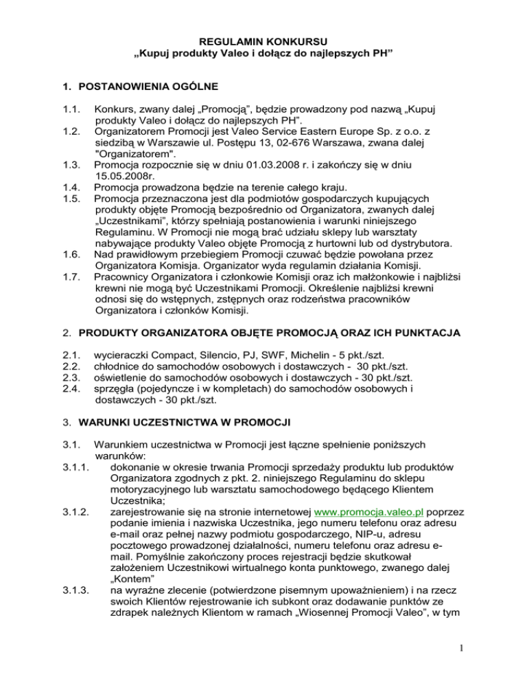 REGULAMIN KONKURSU „Kupuj produkty Valeo i dołącz do najlepszych PH” 1. POSTANOWIENIA OGÓLNE 1.1. 1.2. 1.3. 1.4. 1.5. 1.6. 1.7. Konkurs, zwany dalej „Promocją”, będzie prowadzony pod nazwą „Kupuj produkty Valeo i dołącz do najlepszych PH”. Organizatorem Promocji jest Valeo Service Eastern Europe Sp. z o.o. z siedzibą w Warszawie ul. Postępu 13, 02-676 Warszawa, zwana dalej "Organizatorem". Promocja rozpocznie się w dniu 01.03.2008 r. i zakończy się w dniu 15.05.2008r. Promocja prowadzona będzie na terenie całego kraju. Promocja przeznaczona jest dla podmiotów gospodarczych kupujących produkty objęte Promocją bezpośrednio od Organizatora, zwanych dalej „Uczestnikami”, którzy spełniają postanowienia i warunki niniejszego Regulaminu. W Promocji nie mogą brać udziału sklepy lub warsztaty nabywające produkty Valeo objęte Promocją z hurtowni lub od dystrybutora. Nad prawidłowym przebiegiem Promocji czuwać będzie powołana przez Organizatora Komisja. Organizator wyda regulamin działania Komisji. Pracownicy Organizatora i członkowie Komisji oraz ich małŜonkowie i najbliŜsi krewni nie mogą być Uczestnikami Promocji. Określenie najbliŜsi krewni odnosi się do wstępnych, zstępnych oraz rodzeństwa pracowników Organizatora i członków Komisji. 2. PRODUKTY ORGANIZATORA OBJĘTE PROMOCJĄ ORAZ ICH PUNKTACJA 2.1. 2.2. 2.3. 2.4. wycieraczki Compact, Silencio, PJ, SWF, Michelin - 5 pkt./szt. chłodnice do samochodów osobowych i dostawczych - 30 pkt./szt. oświetlenie do samochodów osobowych i dostawczych - 30 pkt./szt. sprzęgła (pojedyncze i w kompletach) do samochodów osobowych i dostawczych - 30 pkt./szt. 3. WARUNKI UCZESTNICTWA W PROMOCJI 3.1. Warunkiem uczestnictwa w Promocji jest łączne spełnienie poniŜszych warunków: 3.1.1. dokonanie w okresie trwania Promocji sprzedaŜy produktu lub produktów Organizatora zgodnych z pkt. 2. niniejszego Regulaminu do sklepu motoryzacyjnego lub warsztatu samochodowego będącego Klientem Uczestnika; 3.1.2. zarejestrowanie się na stronie internetowej www.promocja.valeo.pl poprzez podanie imienia i nazwiska Uczestnika, jego numeru telefonu oraz adresu e-mail oraz pełnej nazwy podmiotu gospodarczego, NIP-u, adresu pocztowego prowadzonej działalności, numeru telefonu oraz adresu email. Pomyślnie zakończony proces rejestracji będzie skutkował załoŜeniem Uczestnikowi wirtualnego konta punktowego, zwanego dalej „Kontem” 3.1.3. na wyraźne zlecenie (potwierdzone pisemnym upowaŜnieniem) i na rzecz swoich Klientów rejestrowanie ich subkont oraz dodawanie punktów ze zdrapek naleŜnych Klientom w ramach „Wiosennej Promocji Valeo”, w tym 1 3.2. 3.3. 3.4. 3.5. 3.6. 3.7. poprawne wprowadzenie numerów referencyjnych produktów objętych Promocją a następnie rezerwowanie uzgodnionych z Klientem nagród. KaŜdy Uczestnik moŜe wprowadzić w okresie trwania Promocji dowolną ilość kodów swoich Klientów. KaŜdy kod moŜe być zgłoszony tylko jeden raz. Kody zgłoszone przez Uczestnika nie mogą być powtórnie uŜyte przez Klienta w akcji „Wiosenna Promocja Valeo”. Kody wraz z odpowiednimi numerami referencyjnymi naleŜy wprowadzać na stronie www.promocja.valeo.pl od dnia 01.03.2008 roku do dnia 15.05.2008 roku. Organizator zastrzega sobie prawo do zweryfikowania Uczestnika Promocji pod kątem zgodności z Regulaminem Promocji, w szczególności zaś do udokumentowania przez Uczestnika sprzedaŜy Klientowi produktów Organizatora objętych Promocją oraz pisemnego upowaŜnienia od Klienta zgodnie z 3.1.3. niniejszego Regulaminu. Weryfikacji o której mowa powyŜej moŜe dokonać w imieniu Organizatora podmiot trzeci na podstawie pisemnego upowaŜnienia Organizatora. W przypadku odmowy Uczestnika na przeprowadzenie weryfikacji lub odmowy przedstawienia dokumentów niezbędnych do przeprowadzenia weryfikacji, Organizator zastrzega sobie prawo do usunięcia Konta Uczestnika i anulowania wprowadzonych punktów, a tym samym odmowy wydania nagrody. 4. NAGRODY 4.1. Nagrody dostępne w Promocji: 4.1.1. wyjazd na 24-godzinny wyścig Le Mans – 5 nagród. 4.2. Uczestnikom nie przysługują nagrody zamówione w imieniu i na rzecz Klientów, oferowane w Promocji „Wiosenna Promocja Valeo”. 4.3. W przypadku rezygnacji laureata z odbioru nagrody, nagroda ta przechodzi na kolejnego Uczestnika o największej ilości zgromadzonych punktów w okresie Promocji. 4.4. Nagród w Promocji nie moŜna wymieniać na ekwiwalent pienięŜny lub na inne nagrody rzeczowe. 5. ZASADY PRZYZNAWANIA NAGRÓD 5.1. Nagrody przyznawane są na zasadzie konkursu pięciu pierwszym Uczestnikom o największej ilości punktów zarejestrowanych na Koncie Uczestnika w okresie trwania Promocji tj. 01.03.2008r. – 15.05.2008r. Przez określenie „punkty” rozumie się punkty Klientów rejestrowane zgodnie z pkt. 3.1.3. niniejszego Regulaminu. 5.2. Wygrywa pięciu pierwszych Uczestników o największej ilości punktów, w przypadku równej ilości punktów na więcej niŜ jednym Koncie nagroda przyznawana jest Uczestnikowi, który uzbierał całą pulę punktów we wcześniejszym terminie. 5.3. Jeden Uczestnik Promocji moŜe otrzymać tylko jedną nagrodę. 5.4. Przyznawanie nagród w Promocji odbywać się będzie pod nadzorem Komisji powołanej przez Organizatora, o której mowa w punkcie 1.6. 5.5. Po zakończeniu Promocji Komisja sporządzi protokół z jej przebiegu. 5. OGŁASZANIE WYNIKÓW PRZYDZIAŁU I TERMIN ODBIORU NAGRÓD 2 6.1. 6.2. 6.3. 6.4. Lista laureatów Konkursu zawierająca nazwy Uczestników wraz z imionami i nazwiskami osób reprezentujących Uczestników, którzy otrzymali nagrody zostanie opublikowana na stronach internetowych Promocji (www.promocja.valeo.pl) oraz Organizatora (www.valeoservice.com) w okresie od 19.05.2008 do 19.06. 2008 roku. Laureaci konkursu zostaną dodatkowo poinformowani o wygranej telefonicznie. Odbiór nagród zostanie ustalony indywidualnie z laureatami. Nagrody zostaną wydane 