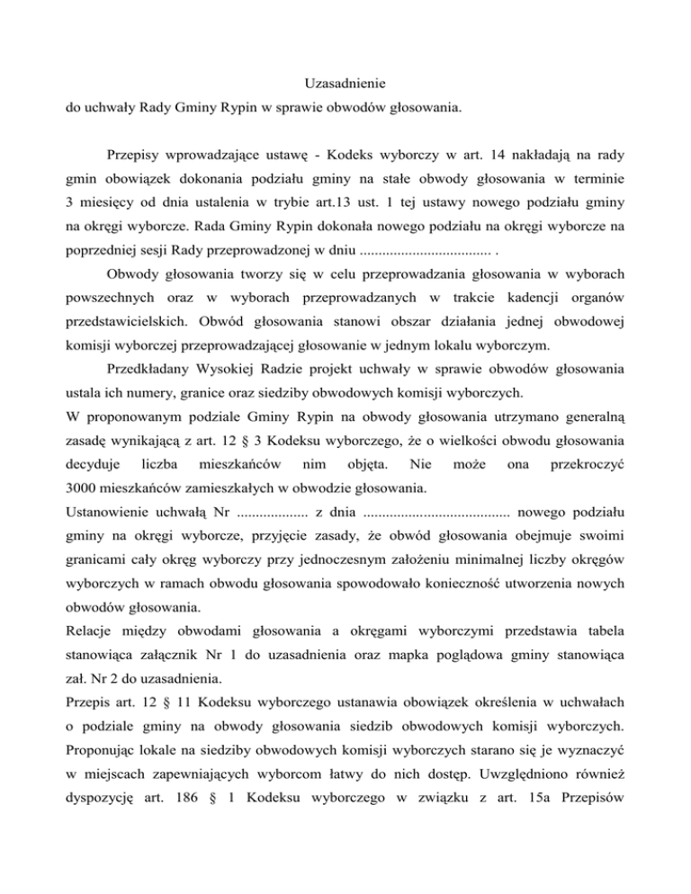 Uzasadnienie do uchwały Rady Gminy Rypin w sprawie obwodów głosowania. Przepisy wprowadzające ustawę - Kodeks wyborczy w art. 14 nakładają na rady gmin obowiązek dokonania podziału gminy na stałe obwody głosowania w terminie 3 miesięcy od dnia ustalenia w trybie art.13 ust. 1 tej ustawy nowego podziału gminy na okręgi wyborcze. Rada Gminy Rypin dokonała nowego podziału na okręgi wyborcze na poprzedniej sesji Rady przeprowadzonej w dniu ................................... . Obwody głosowania tworzy się w celu przeprowadzania głosowania w wyborach powszechnych oraz w wyborach przeprowadzanych w trakcie kadencji organów przedstawicielskich. Obwód głosowania stanowi obszar działania jednej obwodowej komisji wyborczej przeprowadzającej głosowanie w jednym lokalu wyborczym. Przedkładany Wysokiej Radzie projekt uchwały w sprawie obwodów głosowania ustala ich numery, granice oraz siedziby obwodowych komisji wyborczych. W proponowanym podziale Gminy Rypin na obwody głosowania utrzymano generalną zasadę wynikającą z art. 12 § 3 Kodeksu wyborczego, że o wielkości obwodu głosowania decyduje liczba mieszkańców nim objęta. Nie może ona przekroczyć 3000 mieszkańców zamieszkałych w obwodzie głosowania. Ustanowienie uchwałą Nr ................... z dnia ....................................... nowego podziału gminy na okręgi wyborcze, przyjęcie zasady, że obwód głosowania obejmuje swoimi granicami cały okręg wyborczy przy jednoczesnym założeniu minimalnej liczby okręgów wyborczych w ramach obwodu głosowania spowodowało konieczność utworzenia nowych obwodów głosowania. Relacje między obwodami głosowania a okręgami wyborczymi przedstawia tabela stanowiąca załącznik Nr 1 do uzasadnienia oraz mapka poglądowa gminy stanowiąca zał. Nr 2 do uzasadnienia. Przepis art. 12 § 11 Kodeksu wyborczego ustanawia obowiązek określenia w uchwałach o podziale gminy na obwody głosowania siedzib obwodowych komisji wyborczych. Proponując lokale na siedziby obwodowych komisji wyborczych starano się je wyznaczyć w miejscach zapewniających wyborcom łatwy do nich dostęp. Uwzględniono również dyspozycję art. 186 § 1 Kodeksu wyborczego w związku z art. 15a Przepisów -2wprowadzających ustawę – Kodeks wyborczy zobowiązuje w przyszłości wyznaczenie odpowiedniej liczby siedzib obwodowych komisji wyborczych w budynkach dostosowanych do potrzeb wyborców niepełnosprawnych. Lokale te powinny spełniać kryteria określone w rozporządzeniu Ministra Infrastruktury z dnia 29 lipca 2011 r. w sprawie lokali obwodowych komisji wyborczych dostosowanych do potrzeb wyborców niepełnosprawnych. Przedkładany projekt podziału gminy na obwody głosowania konsultowany był z komisjami rady, podano go do publicznej wiadomości zamieszczając jego treść z uzasadnieniem na stronie internetowej Biuletynu Informacji Publicznej oraz wywieszono informację na tablicy ogłoszeń Urzędu o możliwości zapoznania się z projektem w siedzibie Urzędu. Proponowany podział Gminy Rypin na obwody głosowania będzie miał zastosowanie do wyborów do Sejmu RP i Senatu RP, Prezydenta RP, do Parlamentu Europejskiego oraz referendów od chwili jego uchwalenia. Dla wyborów organów samorządowych, zgodnie z art. 16 Przepisy wprowadzające ustawę – Kodeks wyborczy przyjęty podział na obwody głosowania będzie miał zastosowanie od kadencji 2014 – 2018. Przewodniczący Rady Marek Paweł Śmiechewicz