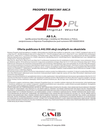 PROSPEKT EMISYJNY AKCJI AB S.A. (spółka prawa handlowego z siedzibą we Wrocławiu w Polsce, zarejestrowana w Rejestrze Przedsiębiorców pod numerem KRS 0000053834) Oferta publiczna 6.442.950 akcji zwykłych na okaziciela Niniejszy Prospekt został sporządzony w związku z ofertą publiczną 6.442.950 akcji zwykłych na okaziciela, w tym: 2.729.971 istniejących akcji serii A1 („Akcje Serii A1”), 202.000 istniejących akcji serii D („Akcje Serii D”), 1.910.979 istniejących akcji serii E („Akcje Serii E”) oraz 1.600.000 nowo emitowanych akcji Serii F („Akcje Serii F”), o wartości nominalnej 1 PLN każda (razem „Akcje Oferowane”) oraz ubieganiem się o dopuszczenie do obrotu na Giełdzie Papierów Wartościowych w Warszawie S.A. 2.729.971 Akcji Serii A1, 202.000 Akcji Serii D, 1.910.979 Akcji Serii E, 1.600.000 Akcji Serii F oraz 1.600.000 Praw do Akcji Serii F („Prawa do Akcji Serii F”). Akcje Serii A1, Akcje Serii D, Akcje Serii E oraz Akcje Serii F są oferowane inwestorom bez ich rozróżniania na akcje istniejące i nowo emitowane na etapie składania zapisów. W konsekwencji inwestorom mogą zostać przydzielone istniejące Akcje Serii A1, D i E lub nowo emitowane Akcje Serii F. Oferta Publiczna jest skierowana do Inwestorów Instytucjonalnych oraz Inwestorów Indywidualnych, przy czym przewiduje się, że liczba Akcji Oferowanych, która zostanie przydzielona Inwestorom Indywidualnym, będzie stanowić 30% wszystkich Akcji Oferowanych. Informacja na temat wyników przydziału zostanie podana do publicznej wiadomości w trybie art. 54 ust. 3 Ustawy. Szczegółowe zasady Oferty Publicznej, w tym przydziału Akcji Oferowanych, opisane są w Rozdziale 21 „Subskrypcja i sprzedaż Akcji Oferowanych” niniejszego Prospektu. Przeprowadzenie Oferty Publicznej nie nastąpi w trybie wykonania umowy o subemisję usługową. Dla potrzeb przyjmowania zapisów Inwestorów Indywidualnych ustalona została Cena Maksymalna w wysokości 12 złotych za jedną Akcję Oferowaną. Cena Akcji Oferowanych nabywanych przez Inwestorów Instytucjonalnych będzie mogła być wyższa od Ceny Akcji Oferowanych nabywanych przez Inwestorów Indywidualnych. Papiery wartościowe Emitenta nie są przedmiotem obrotu na rynku regulowanym. Intencją Emitenta jest równoczesne wprowadzenie Akcji Serii A1, D i E oraz Praw do Akcji Serii F do obrotu na GPW w jak najszybszym możliwym terminie. Wprowadzenie do obrotu Akcji Serii F powinno nastąpić w terminie dwóch miesięcy od dnia zamknięcia subskrypcji, natomiast zamiarem Emitenta jest, aby do tego czasu możliwy był na GPW obrót Prawami do Akcji Serii F. Inwestowanie w papiery wartościowe objęte niniejszym Prospektem łączy się z wysokim ryzykiem właściwym dla instrumentów rynku kapitałowego o charakterze udziałowym oraz ryzykiem związanym z działalnością Emitenta oraz z otoczeniem, w jakim Emitent prowadzi działalność. Szczegółowy opis czynników ryzyka znajduje się w Rozdziale 2 „Czynniki ryzyka”. OFERTA PUBLICZNA JEST PRZEPROWADZANA JEDYNIE NA TERYTORIUM RZECZYPOSPOLITEJ POLSKIEJ. POZA GRANICAMI POLSKI NINIEJSZY PROSPEKT NIE MOŻE BYĆ TRAKTOWANY JAKO PROPOZYCJA LUB OFERTA NABYCIA. PROSPEKT ANI PAPIERY WARTOŚCIOWE NIM OBJĘTE NIE BYŁY PRZEDMIOTEM REJESTRACJI, ZATWIERDZENIA LUB NOTYFIKACJI W JAKIMKOLWIEK PAŃSTWIE POZA RZECZYPOSPOLITĄ POLSKĄ, W SZCZEGÓLNOŚCI ZGODNIE Z PRZEPISAMI DYREKTYWY W SPRAWIE PROSPEKTU LUB AMERYKAŃSKIEJ USTAWY O PAPIERACH WARTOŚCIOWYCH. PAPIERY WARTOŚCIOWE OBJĘTE NINIEJSZYM PROSPEKTEM NIE MOGĄ BYĆ OFEROWANE LUB SPRZEDAWANE POZA GRANICAMI RZECZYPOSPOLITEJ POLSKIEJ (W TYM NA TERENIE INNYCH PAŃSTW UNII EUROPEJSKIEJ ORAZ STANÓW ZJEDNOCZONYCH AMERYKI PÓŁNOCNEJ), CHYBA ŻE W DANYM PAŃSTWIE TAKA OFERTA LUB SPRZEDAŻ MOGŁABY ZOSTAĆ DOKONANA ZGODNIE Z PRAWEM, BEZ KONIECZNOŚCI SPEŁNIENIA DODATKOWYCH WYMOGÓW PRAWNYCH W SZCZEGÓLNOŚCI NA PODSTAWIE WYŁĄCZEŃ PRZEWIDZIANYCH W ART. 4 DYREKTYWY W SPRAWIE PROSPEKTU. KAŻDY INWESTOR ZAMIESZKAŁY BĄDŹ MAJĄCY SIEDZIBĘ POZA GRANICAMI RZECZYPOSPOLITEJ POLSKIEJ POWINIEN ZAPOZNAĆ SIĘ Z PRZEPISAMI PRAWA POLSKIEGO ORAZ PRZEPISAMI PRAW INNYCH PAŃSTW, KTÓRE MOGĄ SIĘ DO NIEGO STOSOWAĆ. Oferujący CA IB Securities S.A. ul. Emilii Plater 53, 00-113 Warszawa Data Prospektu 25 sierpnia 2006 OŚWIADCZENIE STOSOWNIE DO ROZPORZĄDZENIA KOMISJI (WE) NR 809/2004 Z DNIA 29 KWIETNIA 2004 r. OŚWIADCZENIE EMITENTA Działając w imieniu AB S.A. z siedzibą we Wrocławiu, niniejszym oświadczamy, że zgodnie z naszą najlepszą wiedzą i przy dołożeniu należytej staranności, by zapewnić taki stan, informacje zawarte w Prospekcie są prawdziwe, rzetelne i zgodne ze stanem faktycznym i że w Prospekcie nie pominięto niczego, co mogłoby wpływać na jego znaczenie. Piotr Nowjalis Zbigniew Mądry Dariusz Rochman Andrzej Przybyło Prezes Zarządu Członek Zarządu Dyrektor Finansowy Członek Zarządu Dyrektor ds. Handlowych i Marketingu Członek Zarządu Dyrektor Operacyjny OŚWIADCZENIA WPROWADZAJĄCYCH Polish Enterprise Fund L.P. Działając w imieniu Enterprise Investors Sp. z o.o. z siedzibą w Warszawie, która występuje jako pełnomocnik Polish Enterprise Fund L.P. z siedzibą w Wilmington Delaware (USA), niniejszym oświadczamy, że zgodnie z naszą najlepszą wiedzą i przy dołożeniu należytej staranności, by zapewnić taki stan, informacje zawarte w Prospekcie są prawdziwe, rzetelne i zgodne ze stanem faktycznym i że w Prospekcie nie pominięto niczego, co mogłoby wpływać na jego znaczenie. Jacek Siwicki Tadeusz Galkowski Członek Zarządu Enterprise Investors Sp. z o.o. pełnomocnika Polish Enterprise Fund L.P. Członek Zarządu Enterprise Investors Sp. z o.o. pełnomocnika Polish Enterprise Fund L.P. OŚWIADCZENIA WPROWADZAJĄCYCH Iwona Przybyło Niniejszym oświadczam, że zgodnie z moją najlepszą wiedzą i przy dołożeniu należytej staranności, by zapewnić taki stan, informacje zawarte w Prospekcie są prawdziwe,