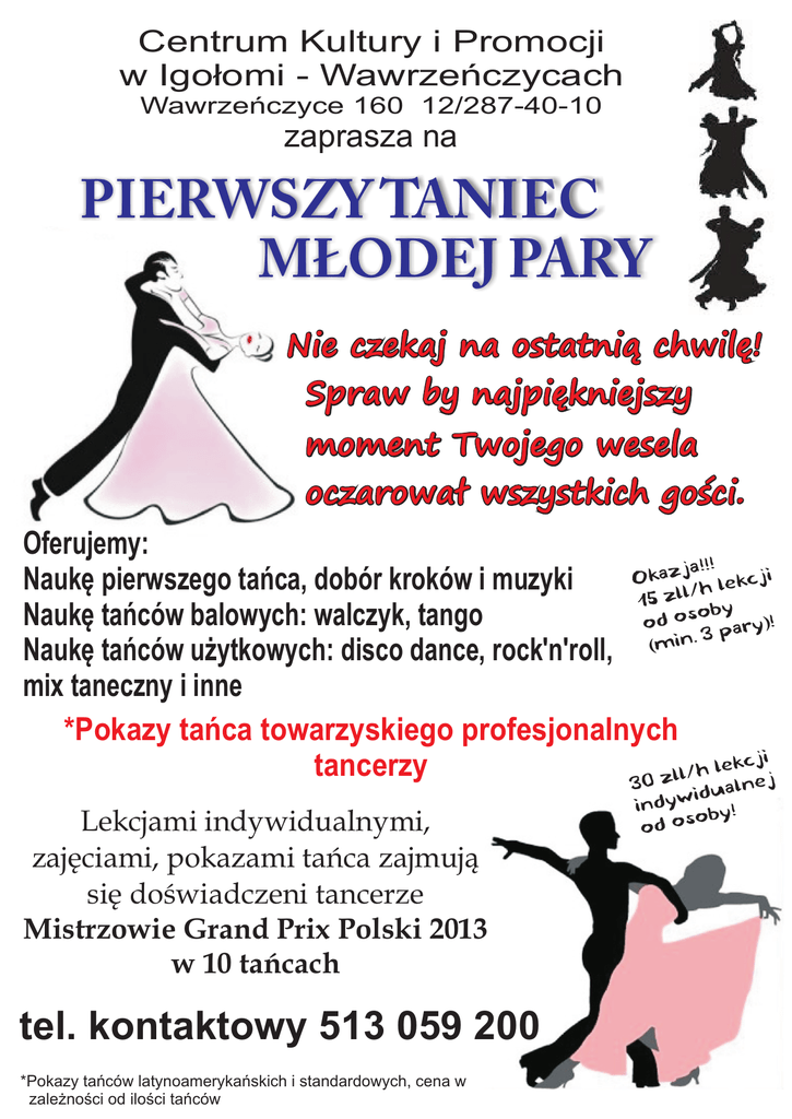 Centrum Kultury i Promocji w Igo³omi - Wawrzeñczycach Wawrzeñczyce 160 12/287-40-10 zaprasza na PIERWSZY TANIEC M£ODEJ PARY Nie czekaj na ostatni¹ chwilê! Spraw by najpiêkniejszy moment Twojego wesela oczarowa³ wszystkich goœci. Oferujemy: ja!!! i Okaz Naukê pierwszego tañca, dobór kroków i muzyki lekcj h / l l 15 z soby Naukê tañców balowych: walczyk, tango od o ary)! p 3 . Naukê tañców u¿ytkowych: disco dance, rock'n'roll, (min mix taneczny i inne *Pokazy tañca towarzyskiego profesjonalnych i lekcj tancerzy h / l l 30 z nej Lekcjami indywidualnymi, zajêciami, pokazami tañca zajmuj¹ siê doœwiadczeni tancerze Mistrzowie Grand Prix Polski 2013 w 10 tañcach tel. kontaktowy 513 059 200 *Pokazy tañców latynoamerykañskich i standardowych, cena w zale¿noœci od iloœci tañców l idua w y ind ! soby od o