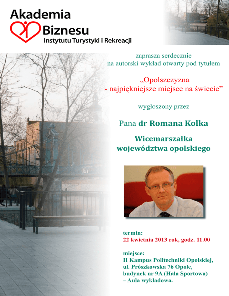 Akademia Biznesu Instytutu Turystyki i Rekreacji zaprasza serdecznie na autorski wykład otwarty pod tytułem „Opolszczyzna - najpiękniejsze miejsce na świecie” wygłoszony przez Pana dr Romana Kolka Wicemarszałka województwa opolskiego termin: 22 kwietnia 2013 rok, godz. 11.00 miejsce: II Kampus Politechniki Opolskiej, ul. Prószkowska 76 Opole, budynek nr 9A (Hala Sportowa) – Aula wykładowa.
