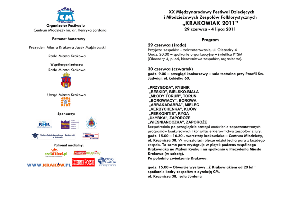 XX Patronat Międzynarodowy medialny Festiwal Dziecięcych i Młodzieżowych Zespołów Folklorystycznych Organizator Festiwalu Centrum Młodzieży im. dr. Henryka Jordana Patronat medialny: „KRAKOWIAK 29 czerwca - 4 lipca 2011 Patronat honorowy Prezydent Miasta Krakowa Jacek Majchrowski Rada Miasta Krakowa Współorganizatorzy: Rada Miasta Krakowa Urząd Miasta Krakowa Sponsorzy: Patronat medialny: 2011” Program 29Rada czerwca (środa) Miasta Krakowa Przyjazd zespołów – zakwaterowanie, ul. Oleandry 4 Godz. 20.00 – spotkanie organizacyjne – świetlica PTSM (Oleandry 4, piloci, kierownictwo zespołów, organizator). Rada Miasta Krakowa 30 czerwca (czwartek) Współorganizatorzy: godz. 9.00 – przegląd konkursowy – sala teatralna przy Parafii Św. Przy finansowym wsparciu Jadwigi, ul. Łokietka 60. Urzędu Marszałkowskiego Ministerstwa Edukacji Narodowej „PRZYGODA”, RYBNIK Urząd Miasta Krakowa „BESKID”, BIELSKO-BIAŁA „MŁODY TORUŃ”, TORUŃ „BOROWIACY”, BOROWA Patronat medialny „ABRAKADABRA”, MIELEC „VERBYCHENKA”, KIJÓW „PERKONITIS”, RYGA „UŁYBKA”, ZAPOROŻE „WIESNIANOCZKA”, ZAPOROŻE Bezpośrednio po przeglądzie nastąpi omówienie zaprezentowanych programów konkursowych i konsultacje kierownictwa zespołów z jury. godz. 15.00 – 16.30 - warsztaty krakowiaka – Centrum Młodzieży, ul. Krupnicza 38. W warsztatach bierze udział jedna para z każdego zespołu. Ta sama para występuje w piątek podczas wspólnego Krakowiaka na Małym Rynku i na spotkaniu u Prezydenta Miasta Krakowa (w sobotę). Po południu zwiedzanie Krakowa. godz. 15.00 – Otwarcie wystawy „Z Krakowiakiem od 20 lat” spotkanie kadry zespołów z dyrekcją CM, ul. Krupnicza 38, sala Jordana 1 lipca (piątek) godz. 10.00-13.00 – koncert – Mały Rynek (czas występu: 12 min.) Zespół „JELIEWIEJS”, CHERSOŃ, UKRAINA (20 min. ) Zespół „PRZYGODA”, RYBNIK Zespół „MŁODY TORUŃ”, TORUŃ Zespół „PERKONITIS”, RYGA, ŁOTWA Zespół „BOROWIACY”, BOROWA Zespół „ABRAKADABRA”, MIELEC Zespół „GRACJA”, RÓWNE, UKRAINA Zespoły z Rosji (90 min.) Godz. 14.30 Parada Zespołów na trasie Wawel (Smocza Jama) - Rynek Główny Godz. 15.30 – ROZŚPIEWANY, ROZTAŃCZONY RYNEK – koncert na płycie Rynku Głównego (wg rozkładu z mapek) 16.00 – koncert na estradzie - Mały Rynek ,Wspólny Krakowiak z Panią Prezydent, Przewodniczącym Rady Miasta i publicznością. Czas występu: 10 min. Zespół „PRZYGODA”, RYBNIK Zespół „VERBYCHENKA”, KIJÓW, UKRAINA Zespół „BESKID”, BIELSKO-BIAŁA Zespół „WIESNIANOCZKA”, ZAPOROŻE, UKRAINA Zespół „ABRAKADABRA”, MIELEC Zespół „UŁYBKA”, ZAPOROŻE, UKRAINA Zespół „BOROWIACY”, BOROWA Zespół „DERINCE CENESUYU ILKOGRETIM OKULU” TURCJA 2 lipca (sobota) godz. 9.00 – spotkanie w Urzędzie Miasta Krakowa, Pl. Wszystkich Św. 3/4 (jedna para w stroju regionalnym wraz z kierownictwem zespołu). godz. 10.00-13.00 – koncert – Mały Rynek (czas występu: 12 min.) Zespół „GRACJA”, RÓWNE, UKRAINA Zespół „PRZYGODA”, RYBNIK Zespół „WIESNIANOCZKA”, ZAPOROŻE, UKRAINA Zespół „BESKID”, BIELSKO-BIAŁA Zespół „UŁYBKA”, ZAPOROŻE, UKRAINA Zespół „BOROWIACY”, BOROWA Zespół „DERINCE CENESUYU ILKOGRETIM OKULU” TURCJA Zespół „ABRAKADABRA”, MIELEC Zespoły z Rosji-90 min godz. 15.00 – KONCERT GALOWY – Mały Rynek (czas występu: ok.15 min.) Zespół „GRACJA”, RÓWNE, UKRAINA Zespół „MŁODY TORUŃ”, TORUŃ Zespół „PERKONITIS”, RYGA, ŁOTWA Zespół „BOROWIACY”, BOROWA Zespół „DERINCE CENESUYU ILKOGRETIM OKULU” TURCJA Zespół „PRZYGODA”, RYBNIK Zespół „VERBYCHENKA”, KIJÓW, UKRAINA Zespół „BESKID”, BIELSKO-BIAŁA Zespół „UŁYBKA”, ZAPOROŻE, UKRAINA Zespół „ABRAKADABRA”, MIELEC Zespół „WIESNIANOCZKA”, ZAPOROŻE, UKRAINA 3 lipca (niedziela) godz. 11.30 – koncert w Auli Jana Pawła II Sanktuarium Bożego Miłosierdzia w Łagiewnikach (czas występu: 10 min.) Zespół „BOROWIACY”, BOROWA Zespół „ABRAKADABRA”, MIELEC Zespół „MŁODY TORUŃ”, TORUŃ Zespół „BESKID”, BIELSKO-BIAŁA Zespół „PRZYGODA”, RYBNIK godz. 17.00 – koncert w Nowej Hucie (czas występu: 12 min.) Zespół „PERKONITIS”, RYGA, ŁOTWA Zespół „PRZYGODA”, RYBNIK Zespół „VERBYCHENKA”, KIJÓW, UKRAINA Zespół „GRACJA”, RÓWNE, UKRAINA Zespół „ABRAKADABRA”, MIELEC Zespół „DERINCE CENESUYU ILKOGRETIM OKULU” TURCJA Zespół „BOROWIACY”, BOROWA Zespół „WIESNIANOCZKA”, ZAPOROŻE, UKRAINA Zespół „UŁYBKA”, ZAPOROŻE, UKRAINA 4 lipca (poniedziałek) Wyjazd zespołów.