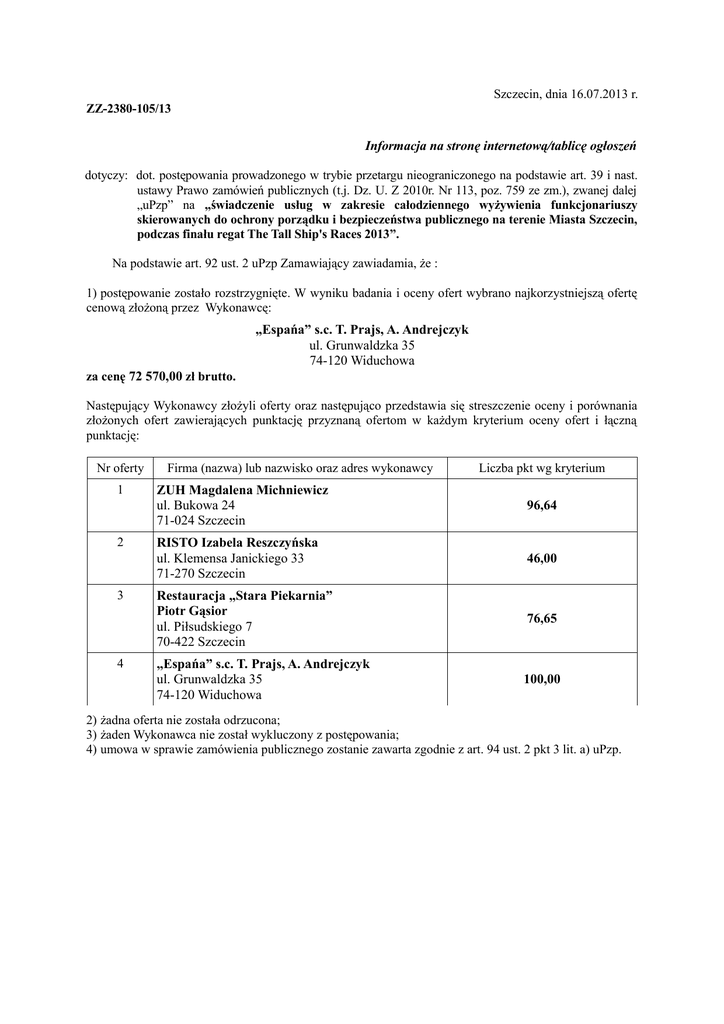 Szczecin, dnia 16.07.2013 r. ZZ-2380-105/13 Informacja na stronę internetową/tablicę ogłoszeń dotyczy: dot. postępowania prowadzonego w trybie przetargu nieograniczonego na podstawie art. 39 i nast. ustawy Prawo zamówień publicznych (t.j. Dz. U. Z 2010r. Nr 113, poz. 759 ze zm.), zwanej dalej „uPzp” na „świadczenie usług w zakresie całodziennego wyżywienia funkcjonariuszy skierowanych do ochrony porządku i bezpieczeństwa publicznego na terenie Miasta Szczecin, podczas finału regat The Tall Ship's Races 2013”. Na podstawie art. 92 ust. 2 uPzp Zamawiający zawiadamia, że : 1) postępowanie zostało rozstrzygnięte. W wyniku badania i oceny ofert wybrano najkorzystniejszą ofertę cenową złożoną przez Wykonawcę: „Espańa” s.c. T. Prajs, A. Andrejczyk ul. Grunwaldzka 35 74-120 Widuchowa za cenę 72 570,00 zł brutto. Następujący Wykonawcy złożyli oferty oraz następująco przedstawia się streszczenie oceny i porównania złożonych ofert zawierających punktację przyznaną ofertom w każdym kryterium oceny ofert i łączną punktację: Nr oferty 1 2 3 4 Firma (nazwa) lub nazwisko oraz adres wykonawcy Liczba pkt wg kryterium ZUH Magdalena Michniewicz ul. Bukowa 24 71-024 Szczecin 96,64 RISTO Izabela Reszczyńska ul. Klemensa Janickiego 33 71-270 Szczecin 46,00 Restauracja „Stara Piekarnia” Piotr Gąsior ul. Piłsudskiego 7 70-422 Szczecin 76,65 „Espańa” s.c. T. Prajs, A. Andrejczyk ul. Grunwaldzka 35 74-120 Widuchowa 100,00 2) żadna oferta nie została odrzucona; 3) żaden Wykonawca nie został wykluczony z postępowania; 4) umowa w sprawie zamówienia publicznego zostanie zawarta zgodnie z art. 94 ust. 2 pkt 3 lit. a) uPzp.