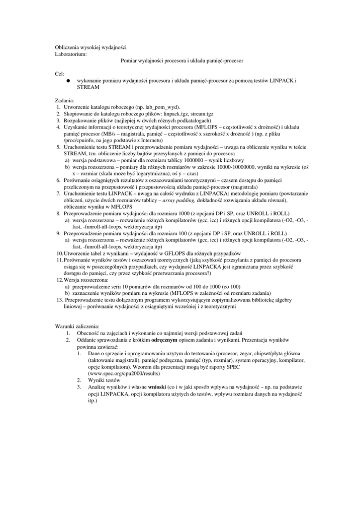 Obliczenia wysokiej wydajności Laboratorium: Pomiar wydajności procesora i układu pamięćprocesor Cel: ● wykonanie pomiaru wydajności procesora i układu pamięćprocesor za pomocą testów LINPACK i STREAM Zadania: 1. Utworzenie katalogu roboczego (np. lab_pom_wyd). 2. Skopiowanie do katalogu roboczego plików: linpack.tgz, stream.tgz 3. Rozpakowanie plików (najlepiej w dwóch różnych podkatalogach) 4. Uzyskanie informacji o teoretycznej wydajności procesora (MFLOPS – częstotliwość x drożność) i układu pamięć procesor (MB/s – magistrala, pamięć – częstotliwość x szerokość x drożność ) (np. z pliku /proc/cpuinfo, na jego podstawie z Internetu) 5. Uruchomienie testu STREAM i przeprowadzenie pomiaru wydajności – uwaga na obliczenie wyniku w teście STREAM, tzn. obliczenie liczby bajtów przesyłanych z pamięci do procesora a) wersja podstawowa – pomiar dla rozmiaru tablicy 1000000 – wynik liczbowy b) wersja rozszerzona – pomiary dla różnych rozmiarów w zakresie 1000010000000, wyniki na wykresie (oś x – rozmiar (skala może być logarytmiczna), oś y – czas) 6. Porównanie osiągniętych rezultatów z oszacowaniami teoretycznymi – czasem dostępu do pamięci przeliczonym na przepustowość i przepustowością układu pamięćprocesor (magistrala) 7. Uruchomienie testu LINPACK – uwaga na całość wydruku z LINPACKA: metodologię pomiaru (powtarzanie obliczeń, użycie dwóch rozmiarów tablicy – array padding, dokładność rozwiązania układu równań), obliczanie wyniku w MFLOPS 8. Przeprowadzenie pomiaru wydajności dla rozmiaru 1000 (z opcjami DP i SP, oraz UNROLL i ROLL) a) wersja rozszerzona – rozważenie różnych kompilatorów (gcc, icc) i różnych opcji kompilatora (O2, O3, fast, funrollallloops, wektoryzacja itp) 9. Przeprowadzenie pomiaru wydajności dla rozmiaru 100 (z opcjami DP i SP, oraz UNROLL i ROLL) a) wersja rozszerzona – rozważenie różnych kompilatorów (gcc, icc) i różnych opcji kompilatora (O2, O3, fast, funrollallloops, wektoryzacja itp) 10.Utworzenie tabel z wynikami – wydajność w GFLOPS dla różnych przypadków 11.Porównanie wyników testów i oszacowań teoretycznych (jaką szybkość przesyłania z pamięci do procesora osiąga się w poszczególnych przypadkach, czy wydajność LINPACKA jest ograniczana przez szybkość dostępu do pamięci, czy przez szybkość przetwarzania procesora?) 12.Wersja rozszerzona: a) przeprowadzenie serii 10 pomiarów dla rozmiarów od 100 do 1000 (co 100) b) zaznaczenie wyników pomiaru na wykresie (MFLOPS w zależności od rozmiaru zadania) 13. Przeprowadzenie testu dołączonym programem wykorzystującym zoptymalizowana bibliotekę algebry liniowej – porównanie wydajności z osiągniętymi wcześniej i z teoretycznymi Warunki zaliczenia: 1. Obecność na zajęciach i wykonanie co najmniej wersji podstawowej zadań 2. Oddanie sprawozdania z krótkim odręcznym opisem zadania i wynikami. Prezentacja wyników powinna zawierać: 1. Dane o sprzęcie i oprogramowaniu użytym do testowania (procesor, zegar, chipset/płyta główna (taktowanie magistrali), pamięć podręczna, pamięć (typ, rozmiar), system operacyjny, kompilator, opcje kompilatora). Wzorem dla prezentacji mogą być raporty SPEC (www.spec.org/cpu2000/results) 2. Wyniki testów 3. Analizę wyników i własne wnioski (co i w jaki sposób wpływa na wydajność – np. na podstawie opcji LINPACKA, opcji kompilatora użytych do testów, wpływu rozmiaru danych na wydajność itp.)