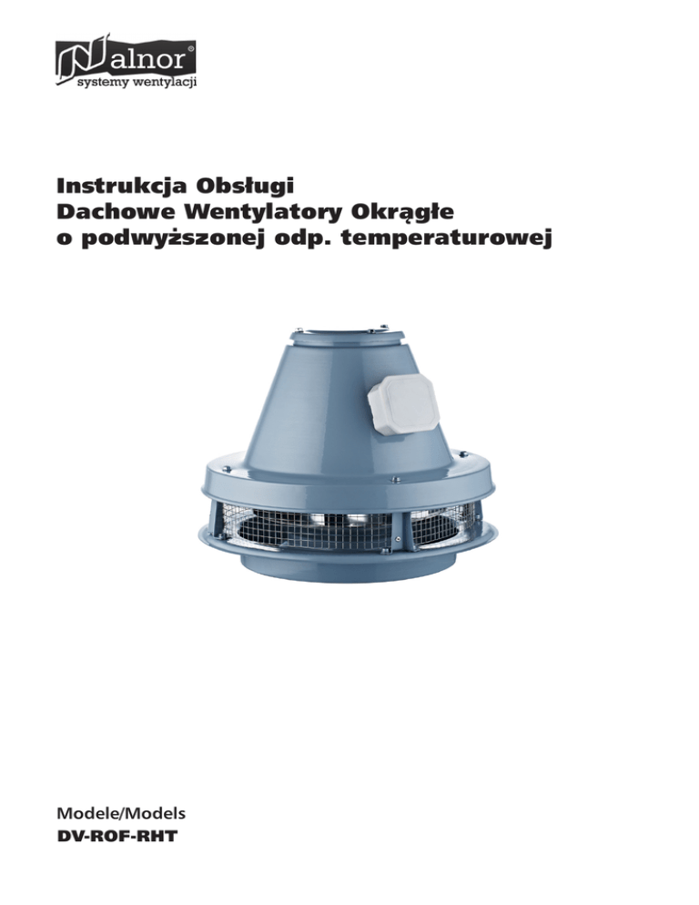 Instrukcja Obsługi Dachowe Wentylatory Okrągłe o podwyższonej odp. temperaturowej Modele/Models DV-ROF-RHT Instrukcja obsługi - wentylatory DV-ROF-R www.alnor.com.pl Ostrzeżenia • • • • • • • • • • Wentylatory zawierają elementy obracające się oraz połączenia elektryczne. Należy stosować się do treści ostrzeżeń podczas ich montażu, konserwacji oraz użytkowania. Montaż oraz wykonanie połączeń elektrycznych należy zlecić osobom właściwie przeszkolonym i uprawnionym. Należy uważać, aby nie uszkodzić połączeń elektrycznych wentylatora przy wierceniu lub wyburzaniu ścian. Produkt wymaga dedykowanego kanału wentylacyjnego. Podczas transportu, użytkowania lub konserwacji, należy zakładać rękawice chroniące przez rozcięciem. Nie wolno dotykać wentylatora podczas pracy. Produkt należy czyścić okresowo, w przeciwnym wypadku istnieje ryzyko jego uszkodzenia. Wentylator należy trzymać z dala od dzieci oraz osób nieupoważnionych do jego używania. Nie wolno używać w temperaturze powyżej 40 °C Niniejszym oświadczamy, że w produkcji naszych produktów firma nie stosuje elementów szkodliwych dla zdrowia ludzkiego takich jak azbest, rtęć czy polichlorowane bifenyle. Wymiary Typ A B C D E H DV-ROF-RHT-315 410 310 180 30 156 391 Moc Kondensator Prędkość Przepływ powietrza/ Poziom dźwięku Waga DV-ROF-RHT-315 Częstotliwość Typ/Type Napięcie Dane techniczne V Hz W (uf) d/d m3/h dB(A) kg 220 50 250 8 2900 1800 60 11,3 Oznaczenia na produktach lub deklarowane wartości prezentowane na innych drukowanych dokumentach uzyskano w warunkach laboratoryjnych. Wartości te mogą się różnić w zależności od użytkowania i warunków środowiskowych 2 ALNOR® systemy wentylacji jest prawnie chronionym znakiem i technicznym patentem. Prawo do zmian zastrzeżone. Instrukcja obsługi - wentylatory DV-ROF-R DV-ROF-RHT-315 ZACISK KANAŁ MONTAŻOWY PODSTAWA DACHOWA www.alnor.com.pl Montaż 1. 2. 3. 4. W celu instalacji na dachu, użyć odpowiedniej podstawy dachowej, dla zapewnienia prawidłowej odległości od dachu. Należy użyć zacisku jak wskazano na RYS. Zgodnie z rysunkiem, do produktu podłączony jest kanał montażowy. Należy zabezpieczyć wentylator przed ekstremalnymi warunkami pogodowymi, używając do tego celu lin stalowych, które mają uniemożliwić jego upadek. 5. Połączyć prawidłowo przewód zasilający, upewnić się, że podłączenie jest zgodne ze schematem elektrycznym. Wszystkie bieguny zamontowanego urządzenia podłączyć przez wyłącznik instalacyjny (nadmiarowo-prądowy). 6. Upewnić się, że montaż jest zgodny z kierunkiem przepływu powietrza. 7. Prosimy spróbować uruchomić wentylator po zainstalowaniu, sprawdzić drganie i ewentualne występowanie błędów. Schemat podłączenia ALNOR® systemy wentylacji jest prawnie chronionym znakiem i technicznym patentem. Prawo do zmian zastrzeżone. 3 Instrukcja obsługi - wentylatory DV-ROF-R www.alnor.com.pl • • • • • • • • • • • • • • • Produkty powinny być instalowane wyłącznie przez upoważnione do tego osoby. Należy określić w projekcie czy produkt ma być zainstalowany na ścianie czy na posadzce oraz dokonać montażu w sposób bezpieczny. W przypadku montażu naściennego, należy użyć dodatkowo wspornika lub klamr. Łopatki wentylatora powinny być zainstalowane na wysokości 2,3 m od posadzki w przypadku montażu naściennego. Wentylatora nie można instalować za oknem lub ścianą. Niezbędne jest podjęcie środków zapobiegawczych aby uniknąć wycieku gazu do pomieszczenia z zewnętrznej rury gazowej lub innego urządzenia spalającego paliwo. Zaleca się noszenie rękawic ochronnych podczas montażu produktów. Produkt należy podłączyć do kanałów wejściowych i wyjściowych. Należy bezwzględnie wyłączyć zasilanie przed podłączeniem przewodów elektrycznych. Gdy wsporniki i połączenia zostaną zainstalowane w sposób prawidłowy, należy upewnić się, że są one odpowiednio wytrzymałe by utrzymać ciężar produktu. Nawet jeżeli produkt jest odłączony od zasilania sieciowego, należy upewnić się, że jest on wyłączony przy podłączaniu urządzeń. Przed montażem należy sprawdzić czy miejsce instalacji jest zgodne z informacjami o przyłączach elektrycznych (napięcie, moc, częstotliwość, itd.), które znajdują się na tabliczkach znamionowych/etykiecie produktu. Nie ma przeszkód utrudniających przepływ powietrza. Ze względów bezpieczeństwa zacisk uziemiający na produkcie należy połączyć z uziemieniem budynku. Należy upewnić się, że przekaźniki termiczne i przeciążeniowe silnika są podłączone w sposób właściwy. Okablowanie produktu, połączenia elektryczne muszą być zgodnie ze schematem. Oddzielenie zestyków we wszystkich biegunach wraz z przełącznikiem, który należy podłączyć do stałej instalacji kablowej zgodnie z przepisami. Użytkowanie DV-ROF-RHT jest wentylatorem wyciągowym dymu mającym zastosowanie w obszarach przemysłowych oraz mieszkalnych, przeznaczony do transportu gorących gazów przez komin. Max. temperatura wyciąganego powietrza to 1200C. Wentylatory DV-ROF-RHT znajdują szerokie zastosowanie w obiektach mieszkalnych, handlowych i przemysłowych, szczególnie tam, gdzie jest ciepłe powietrze i dym, który należy wyciągnąć, na przykład kawiarnie, restauracje, centra handlowe, szpitale, fabryki, biura itp Przed zastosowaniem wentylatorów dachowych użytkownicy są zobowiązani zapoznać się dokładnie z ich instrukcją obsługi i konserwacji. Oczekiwany okres trwałości produktów wynosi 10 lat. Przy pierwszym uruchomieniu urządzenia należy zastosować następujące środki ostrożności: • Przed podłączeniem przewodów elektrycznych należy odłączyć zasilanie. • Należy upewnić się, że wszelkie połączenia elektryczne zostały wykonane bezpiecznie i właściwie. • Należy upewnić się