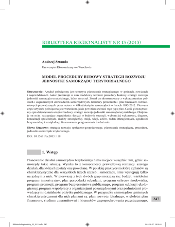 BIBLIOTEKA REGIONALISTY NR 13 (2013) Andrzej Sztando Uniwersytet Ekonomiczny we Wrocławiu MODEL PROCEDURY BUDOWY STRATEGII ROZWOJU JEDNOSTKI SAMORZĄDU TERYTORIALNEGO Streszczenie: Artykuł poświęcony jest tematyce planowania strategicznego w gminach, powiatach i województwach. Autor prezentuje w nim modelowy wzorzec procedury budowy strategii rozwoju jednostki samorządu terytorialnego, który stworzył. Został on skonstruowany z wykorzystaniem polskich i zagranicznych doświadczeń samorządowych, literatury przedmiotu i prac badawczo-wdrożeniowych prowadzonych przez autora w kilkudziesięciu samorządach w latach 1995-2013. Pierwsza część artykułu poświęcona jest warunkom, jakie powinien spełniać tego typu plan. Część główną tworzy opis dziewiętnastu etapów budowy strategii rozwoju jednostki samorządu terytorialnego. Obejmuje on m.in. następujące zagadnienia: decyzji o budowie strategii, wyboru jej wykonawcy, diagnoz, konsultacji społecznych, analizy strategicznej, misji, wizji, celów, zadań strategicznych, zgodności horyzontalnej i wertykalnej, finansowania, przyjmowania i wdrażania. Słowa kluczowe: strategia rozwoju społeczno-gospodarczego, planowanie strategiczne, procedura, jednostka samorządu terytorialnego. DOI: 10.15611/br.2013.1.18 1. Wstęp Planowanie działań samorządów terytorialnych ma miejsce wszędzie tam, gdzie samorządy takie istnieją. Wynika to z konieczności prawidłowej realizacji szeregu działań, dla których zostały one powołane. W polskiej praktyce niektóre z planów są charakterystyczne dla wszystkich trzech szczebli samorządu, inne występują tylko na jednym z nich. W pierwszej z tych dwóch grup mieszczą się: budżet, wieloletni program inwestycyjny, plan gospodarki odpadami, program ochrony środowiska, program promocji, program bezpieczeństwa publicznego, program edukacji ekologicznej, program współpracy z organizacjami pozarządowymi oraz podmiotami prowadzącymi działalność pożytku publicznego. W przypadku samorządów gminnych charakterystycznymi dla nich planami są: plan rozwoju lokalnego, wieloletni plan finansowy, studium uwarunkowań i kierunków zagospodarowania przestrzennego, Biblioteka Regionalisty_13_2013.indb 247 247 2014-10-07 10:30:54 Andrzej Sztando miejscowy plan zagospodarowania przestrzennego, program profilaktyki i rozwiązywania problemów alkoholowych, program przeciwdziałania narkomanii, program rewitalizacji (zwykle fragmentu miasta), plan urządzeniowo-rolny, program rozwoju oświaty, program lokalnej polityki gospodarczej, projekt założeń do planu zaopatrzenia w ciepło, energię elektryczną i paliwa gazowe, plany rozwoju poszczególnych wsi. Samorządy powiatowe sporządzają plany rozwoju lokalnego, programy rozwoju przedsiębiorczości, programy przeciwdziałania bezrobociu oraz programy działań na rzecz osób niepełnosprawnych. W przypadku województw charakterystycznymi dla nich dokumentami planistycznymi są: strategia innowacji, strategia integracji społecznej, plan zdrowotny, program wyrównywania szans osób niepełnosprawnych i przeciwdziałania ich wykluczeniu społecznemu, plan zagospodarowania przestrzennego województwa, program małej retencji wodnej, program rozwoju sektora rolno-spożywczego, strategia rozwoju obszarów wiejskich, regionalny program operacyjny, regionalny plan działań na rzecz zatrudnienia, a także strategia energetyczna województwa. Powyższe listy nie prezentują całego zbioru procesów planistycznych realizowanych przez samorządy. W praktyce jest ich więcej, gdyż sporządzenie danego planu w danej jednostce może być nie tylko wynikiem dyspozycji ustawowej1, ale również działaniem fakultatywnym2 wynikającym z jej uwarunkowań oraz potrzeb i zamiarów jej społeczności oraz władz. Celem prezentacji owych list jest bowiem jedynie wykazanie, jak szeroki zakres działalności samorządowej objęty jest przez realizowane praktycznie procesy planistyczne. Co za tym idzie – jak bardzo brzemienne w społeczne, gospodarcze i środowiskowe skutki są ich szeroko rozumiana jakość, a także skuteczność i efektywność ich wdrażania. Jeden z takich planów wspólnych dla wszystkich samorządów celowo został pominięty w powyższych specyfikacjach. Jemu bowiem zostało poświęcone niniejsze opracowanie. Ma on znaczenie szczególne, ponieważ obejmuje najszersze spektrum działań, jego przedział czasowy jest zwykle najdłuższy, a rola w stosunku do wszystkich pozostałych – nadrzędna. Chodzi tu o strategię rozwoju społeczno-gospodarczego, zwaną dalej w skrócie strategią. 2. Cel i metoda czynności badawczo-wdrożeniowych Nie istnieje jedna uniwersalna procedura samorządowego planowania strategicznego. W opracowaniach teoretycznych można napotkać wiele zaleceń i szczegółowych wzorców w tym zakresie3. Niemniej w praktyce rekomendowane procedury są nie Procesem planowania wynikającego z dyspozycji ustawowej jest np. budowa programu ochrony środowiska danej gminy. 2 Procesem planowania o charakterze fakultatywnym jest np. sporządzanie programu rozwoju funkcji turystycznych gminy. 3 Jako przykłady można wskazać: E. Nowińska, Strategia rozwoju gmin na przykładzie gmin przygranicznych, Wydawnictwo Akademii Ekonomicznej w Poznaniu, Poznań 1997; N. Berman, Strategiczne planowanie rozwoju gospodarczego – budowanie lepszej przyszłości gospodarczej w polskich 1 248 Biblioteka Regionalisty_13_2013.indb 248 2014-10-07 10:30:54 Model procedury budowy strategii rozwoju jednostki samorządu terytorialnego mal zawsze modyfikowane, uzupełniane o dodatkowe etapy albo wykorzystywane tylko w części. Wciąż poszukuje się rozwiązań z jednej strony mających wysoki potencjał kreacyjny, a z drugiej dostosowanych do zmiennych zadań, potrzeb i możliwości samorządowych jednostek. W obszarze tym mieści się kilkunastoletnia działalność badawczo-wdrożeniowa autora. Jednym z celów, jakie postawił on sob