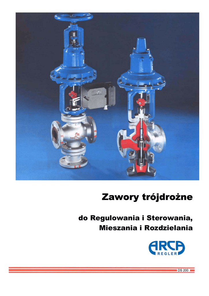 Zawory trójdrożne do Regulowania i Sterowania, Mieszania i Rozdzielania DS 200 Zaleta pierwsza: Napędy pneumatyczno-elektryczne Zawory Trójdrożne Do DN 500 W obudowach odlewanych Zawory trójdrożne ARCA używane są w całej technice cieplnej. Przykład 1: Obiegi chłodzące w statkach motorowych. Przykład 2: Systemy chłodzące i grzewcze dla pras z płytami dociskowymi, wulkanizacyjnych i innych. Przykład 3: Wysokociśnieniowe zawory trójdrożne dla stacji przesyłowych, sprężania i podgrzewania wstępnego w systemach rurociągów gazowych. Zawór regulujący ciśnienie i mieszający do gorącej wody w elektrowni zdalnej DN 50, PN 100, z napędem elektrycznym, rząd budowy 853. Zawór trójdrożny DN 200, PN 40, z uszczelnieniem mieszkiem sprężystym. Aż do 1 000 000 przełączeń rocznie. Dla ekstremalnie krótkich czasów przełączeń zawory trójdrożne stosowane są od lat do sterowania wodą w walcowniach drutu. Ta konstrukcja sprawdziła się bardzo bobrze w tych szczególnie trudnych warunkach. 2 DS 200 Rząd budowy 200 Wykonania standardowe Wrzeciono Nakrętka dławnicy Dławnica Kpl. uszczelnień Nakrętka okrąg. rowkowa Pierścień podst. Zaślepka Śruba/śruba z gwintem dwustronnym Uszczelka Nakrętka Tuleja rozprężna Tuleja prowadząca Grzyb Gniazdo Obudowa Nakrętka Gniazdo Uszczelka Uszczelka Śruba/śruba z gwintem dwustronnym Kołnierz trójdrożny Trójdrożny zawór regulacyjny Rząd budowy 201 (regulator przepływu) Trójdrożny zawór regulacyjny Rząd budowy 201 (regulator przepływu) Zaślepka w wykonaniu standardowym Zaślepka z żeberkami chłodzącymi Wariacje garnituru wewnętrznego A Grzybek regulacyjny – B Grzybek O/Z 4.1 Gniazdo góra 4.2 Gniazdo dół 5.1 Trzpień grzyba 5.2 Grzybek szklankowy 5.3 Grzybek szklankowy 5.4 Tuleja rozprężna 4.1 Gniazdo góra 4.2 Gniazdo dół 5.1 Mieszacz 5.2 Talerz, część górna 5.3 Talerz, część dolna 5.4 Tuleja rozprężna Mieszacz przepływu 3 C Grzybek O/Z z uszczelnieniem miękkim 4.1 Gniazdo góra 5.5 Płytka grzyba 4.2 Gniazdo dół 5.6 Cz. dolna grzyba 5.1 Cz. górna grzyba5.7 Cz. górna grzyba 5.2 Płytka grzyba 5.8 Płytka grzyba 5.3 O-ring 5.9 Cz. dolna grzyba 5.4 Trzpień grzyba 5.10 Tuleja rozprężna DS 200 Zaleta druga: optymalne stosunki przepływu przy mieszaczach i rozdzielaczach Rozdzielacz strumienia Mieszacz strumienia Strumień AB rozdzielany jest na dwa Strumienie wejściowe A i B strumienie wyjściowe A i B. mieszane są do AB. Typowe zastosowanie: regulacja Przepływ skierowany jest w temperatury. obydwu rodzajach budowy naprzeciwko grzyba. Unika się Obie formy budowy, mieszacz i „efektu zatkania wanny” oraz rozdzielacz składane są z związanych z nim uderzeń wody. identycznych części modułowego Standardowe napędy membranowe systemu budowy. Jako obudowa mogą zostać zastosowane bez używane są standardowe zawory szczególnych środków, jak np. przepływowe rzędu budowy 140, co hamulce hydrauliczne. Najlepsze zapewnia Państwu szybką dostawę. prowadzanie grzyba dzięki Dzięki kilku dodatkowym częściom prowadzeniu płaszczowemu w (wrzeciono, tuleja dystansująca) dolnym i górnym gnieździe. możliwa jest przebudowa. Gniazda pozostają nie zmienione. 4 Z odciążeniem, gdy to potrzebne Jeżeli przy dużych zaworach dopuszczone są wyższe ciśnienia niż w naszych tabelach dp (patrz strona 6 i 7), możliwe są odciążenia ciśnieniowe grzyba. Przykład 1: (BSK 1709) Zawór mieszający DN 250 do wody gorącej dp = 6 bar. Przykład 2: (1220/137) Rozdzielacz przepływu DN 200 do emulsji dp = 15 bar w biegu powrotnym. Przykład 3: (1220/129) Rozdzielacz przepływu DN 350 do wody gorącej dp max = 10 bar. DS 200 Rząd budowy 200 i 220 Pomiary zaworów i napędów Membranowy napęd nastawczy 811 Wielkość/skok Elektryczny napęd nastawczy wewnątrz wewn. Wielkość/skok wewn. Rząd budowy 200 Górna pozycja Rząd budowy 220 Wysokość budowy F: F..1 kołnierz standard F..2 zaślepka z przyłączem zaporowym F..3 zaślepka z częścią górną z żebrami chłodzącymi F..4 zaślepka z uszczelnieniem mieszkiem i dławnicą bezpieczeństwa Przyporządkowanie zawór-napęd nastawczy zaczerpnąć z tabeli ciśnień różnicowych. 5 DS 200 Rząd budowy 200 i 220 Pomiary zaworów i napędów Membranowy napęd nastawczy 812 Napęd Skok 812 – 22 20 ØD Ød S A H M 48 20 120 376 M10 56 25 142 270 812 – 22 420 30 812 – 33 M14 482 400 812 - 34 Górna pozycja Górna pozycja 60 72 30 192 618 M20X1,5 Przyporządkowanie napęd-zawór proszę zaczerpnąć z tabeli ciśnień różnicowych. Rząd budowy 200 Rząd budowy 220 Wysokość budowy F: 6 Kołnierz standard Zaślepka z górną częścią z żeberkami chłodzącymi Kołnierz z przyłączem zaporowym Zaślepka z uszczelnieniem mieszkiem i dławnicą bezpieczeństwa DS 200 Maksymalne dopuszczalne ciśnienia różnicowe ∆ p [bar] dla napędów membranowych 812 Maksymalne ciśnienia różnicowe ∆p [bar], mieszacz lub rozdzielacz strumienia. Dopuszczalne ciśnienie różnicowe dla zaworu nie może zostać przekroczone Napęd Ciśnienie nastawcze [bar] Liczba sprężyn Wartości Kv i przyporządkowanie wielkości nominalnych Funkcja otwierania lub funkcja zamykania do do do do 7 DS 200 Maksymalne dopuszczalne ciśnienia różnicowe ∆ p [bar] dla napędów membranowych 811 Maksymalne ciśnienia różnicowe ∆p [bar], mieszacz lub rozdzielacz strumienia. Dopuszczalne ciśnienie różnicowe dla zaworu nie może zostać przekroczone Wielkość napędu i numer ciśnienie nastawcze sprężyna napędu i numer [bar] Wartości Kv i przyporządkowanie wielkości nominalnych wzmocnione Funkcja otwierania lub funkcja zamykania wzmocnione wzmocnione wzmocnione wzmocnione wzmocnione wzmocnione wzmocnione * * DN 400 na zapytanie 8 DS 200 Maksymalne dopuszczalne ciśnienia różnicowe ∆ p [bar] dla napędów membranowych 811 Maksymalne ciśnienia różnicowe ∆p [bar], mieszacz lub rozdzielacz strumienia. Dopuszczalne ciśnien