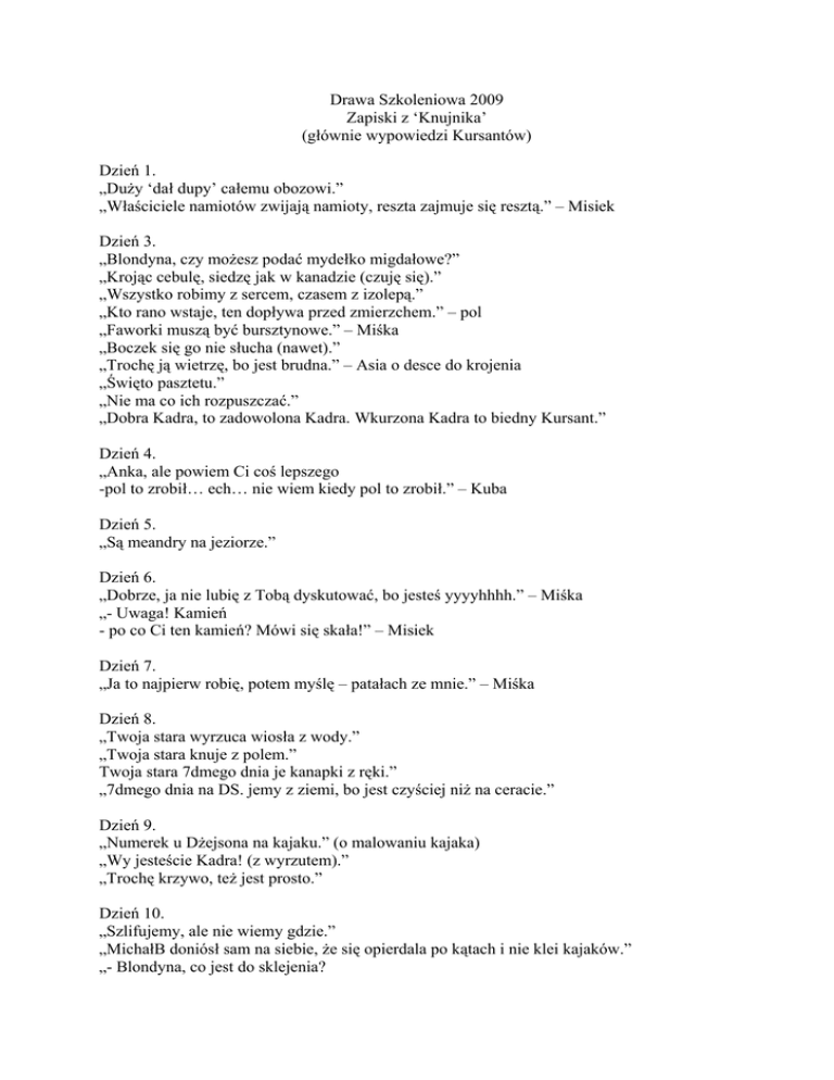 Drawa Szkoleniowa 2009 Zapiski z ‘Knujnika’ (głównie wypowiedzi Kursantów) Dzień 1. „Duży ‘dał dupy’ całemu obozowi.” „Właściciele namiotów zwijają namioty, reszta zajmuje się resztą.” – Misiek Dzień 3. „Blondyna, czy możesz podać mydełko migdałowe?” „Krojąc cebulę, siedzę jak w kanadzie (czuję się).” „Wszystko robimy z sercem, czasem z izolepą.” „Kto rano wstaje, ten dopływa przed zmierzchem.” – pol „Faworki muszą być bursztynowe.” – Miśka „Boczek się go nie słucha (nawet).” „Trochę ją wietrzę, bo jest brudna.” – Asia o desce do krojenia „Święto pasztetu.” „Nie ma co ich rozpuszczać.” „Dobra Kadra, to zadowolona Kadra. Wkurzona Kadra to biedny Kursant.” Dzień 4. „Anka, ale powiem Ci coś lepszego -pol to zrobił… ech… nie wiem kiedy pol to zrobił.” – Kuba Dzień 5. „Są meandry na jeziorze.” Dzień 6. „Dobrze, ja nie lubię z Tobą dyskutować, bo jesteś yyyyhhhh.” – Miśka „- Uwaga! Kamień - po co Ci ten kamień? Mówi się skała!” – Misiek Dzień 7. „Ja to najpierw robię, potem myślę – patałach ze mnie.” – Miśka Dzień 8. „Twoja stara wyrzuca wiosła z wody.” „Twoja stara knuje z polem.” Twoja stara 7dmego dnia je kanapki z ręki.” „7dmego dnia na DS. jemy z ziemi, bo jest czyściej niż na ceracie.” Dzień 9. „Numerek u Dżejsona na kajaku.” (o malowaniu kajaka) „Wy jesteście Kadra! (z wyrzutem).” „Trochę krzywo, też jest prosto.” Dzień 10. „Szlifujemy, ale nie wiemy gdzie.” „MichałB doniósł sam na siebie, że się opierdala po kątach i nie klei kajaków.” „- Blondyna, co jest do sklejenia? - Kanada. - Już sklejona. - To weź następną!” „- Kuba, ile Ci potrzeba czasu na rozbicie obozu? - sekundkę.” „Kursant po 10 dniach nosi na głowie śmieci, bo są czystsze od jego rzeczy.” „Jesteś z Morzkulca! Napierdalasz!” „Leży w rowie, brudna, śmierdzi alkoholem. – to nie musi być kadra.” „- Chcesz donieść na siebie? - Nie… w zasadzie tak…” Dzień 11. „11 dnia Kursanci sami wrzucają wiosła leżące na ziemi do wody.” Dzień 12. „- W którą stronę płyniemy? W dół rzeki? - to wcale nie jest takie pewne.” „Kursanty nauczyły się zwijać wachciaka, bez wyjmowania z niego jajek.” „Jaja dzisiaj cienko przędą.” „- Jesteś z jajami na ‘Ty’? – Tak.” „Dzień gotowania na gazie.” Dzień 13. „Ja nie wiem ilu osób mu brakuje, kiedy są wszyscy.” „- Gdzie jest majonez? - Szukałem w wachciaku i nie ma.” (po czym Duży znajduje go na górze skrzynki) „- Kuba po co suszysz ten worek od zewnątrz? - bo jest w środku wilgotny.” (o wyblince) „Do czego możemy wykorzystać blondynkę?” „Tylko myslisz, że wszyscy knują! My jesteśmy za głupi, żeby knuć.” – średnio rozwinięty szympans Praxa (o zupie pomidorowej) „Zupa jest gotowa, wyszła nie taka jak chcieliśmy (owocowa?), rosół?” „Gacie sięga rzutką dalej niż długość liny.” „Największy namiot pierwszy, aby się najdłużej rozwijał.” (podczas egzaminu z węzełków) „A czy kolor liny ma znaczenie?”