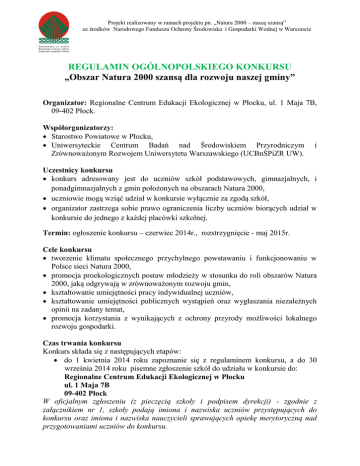 Projekt realizowany w ramach projektu pn. „Natura 2000 – naszą szansą” ze środków Narodowego Funduszu Ochrony Środowiska i Gospodarki Wodnej w Warszawie REGULAMIN OGÓLNOPOLSKIEGO KONKURSU „Obszar Natura 2000 szansą dla rozwoju naszej gminy” Organizator: Regionalne Centrum Edukacji Ekologicznej w Płocku, ul. 1 Maja 7B, 09-402 Płock. Współorganizatorzy: Starostwo Powiatowe w Płocku, Uniwersyteckie Centrum Badań nad Środowiskiem Przyrodniczym Zrównoważonym Rozwojem Uniwersytetu Warszawskiego (UCBnŚPiZR UW). i Uczestnicy konkursu konkurs adresowany jest do uczniów szkół podstawowych, gimnazjalnych, i ponadgimnazjalnych z gmin położonych na obszarach Natura 2000, uczniowie mogą wziąć udział w konkursie wyłącznie za zgodą szkół, organizator zastrzega sobie prawo ograniczenia liczby uczniów biorących udział w konkursie do jednego z każdej placówki szkolnej. Termin: ogłoszenie konkursu – czerwiec 2014r., rozstrzygnięcie - maj 2015r. Cele konkursu tworzenie klimatu społecznego przychylnego powstawaniu i funkcjonowaniu w Polsce sieci Natura 2000, promocja proekologicznych postaw młodzieży w stosunku do roli obszarów Natura 2000, jaką odgrywają w zrównoważonym rozwoju gmin, kształtowanie umiejętności pracy indywidualnej uczniów, kształtowanie umiejętności publicznych wystąpień oraz wygłaszania niezależnych opinii na zadany temat, promocja korzystania z wynikających z ochrony przyrody możliwości lokalnego rozwoju gospodarki. Czas trwania konkursu Konkurs składa się z następujących etapów: do 1 kwietnia 2014 roku zapoznanie się z regulaminem konkursu, a do 30 września 2014 roku pisemne zgłoszenie szkół do udziału w konkursie do: Regionalne Centrum Edukacji Ekologicznej w Płocku ul. 1 Maja 7B 09-402 Płock W oficjalnym zgłoszeniu (z pieczęcią szkoły i podpisem dyrekcji) - zgodnie z załącznikiem nr 1, szkoły podają imiona i nazwiska uczniów przystępujących do konkursu oraz imiona i nazwiska nauczycieli sprawujących opiekę merytoryczną nad przygotowaniami uczniów do konkursu. Projekt realizowany w ramach projektu pn. „Natura 2000 – naszą szansą” ze środków Narodowego Funduszu Ochrony Środowiska i Gospodarki Wodnej w Warszawie do 20 stycznia 2015 roku - przygotowanie wystąpień zgłoszonych przez szkoły uczniów, kwiecień/maj 2015 rok - prezentacja wystąpień podczas konferencji sumującej projekt pt.: „Co dalej z nami – pytają obszary Natura 2000”; ocena wystąpień i ogłoszenie wyników konkursu (o godzinie rozpoczęcia konferencji szkoły biorące udział w konkursie zostaną powiadomione listownie). Typ nagród i sposób ich wykorzystania w dalszym procesie edukacyjnym: Nagrodami w konkursie będą: dla szkół: Mapa Polski - ochrona przyrody i sieć ECONET – sztuk 3 Ścienna mapa szkolna przedstawiająca najważniejsze formy ochrony przyrody w Polsce na tle sieci ECONET. Umieszczone są na niej parki narodowe, parki krajobrazowe, ostoje wodno - błotne objęte konwencją Ramsarską oraz rezerwaty biosfery wpisane na światową listę UNESCO. Mapa wykonana jest najnowocześniejszą techniką pozwalającą na uzyskanie unikalnego efektu trójwymiarowego. dla uczniów: Lornetki – sztuk 3 Lornetki będą wykorzystywane do monitorowania oraz identyfikacji populacji gatunków zwierząt, ptaków w tym chronionych. Sprzęt umożliwia poznanie gatunków w naturalnym środowisku przyrodniczym, siedlisk, zrozumienie przyczyn i związków zachodzących między gatunkiem i siedliskiem oraz działalnością człowieka. Zasady i tryb konkursu 1. W konkursie biorą udział szkoły, które w wyznaczonym terminie zgłoszą udział w konkursie poprzez złożenie pisemnej deklaracji w RCEE w Płocku. 2. Do udziału w konkursie każda szkoła typuje jednego ucznia. 3. Uczniowie wytypowani przez szkoły przygotowują wystąpienia pod opieką nauczycieli. 4. Podczas wystąpień uczniowie przedstawiają swoją opinię na zadany temat. 5. Uczniowie występują podczas konferencji sumującej projekt. 6. Wystąpienia będą odbywać się na żywo. Podczas wystąpień uczniowie nie mogą korzystać z pomocy nauczycieli ani używać prezentacji multimedialnych lub scenografii wymagających uprzedniego montażu. 7. Czas jednego wystąpienia nie może przekroczyć 5 minut. 8. Po każdym wystąpieniu następuje krótka (kilkuminutowa) sesja pytań od eksperta. 9. Wystąpienia są oceniane przez Jury. 10. Wyniki konkursu zostaną ogłoszone podczas konferencji po prezentacji wszystkich konkursowych wystąpień. Ocena wystąpień i nagrody 1. Nad przebiegiem konkursu i oceną wystąpień będzie czuwać Jury powołane przez organizatora. 2. Przedstawiciele szkół biorących udział konkursie nie mogą być powołani do Jury. 3. Jury dokonuje oceny poszczególnych wystąpień na podstawie następujących kryteriów: Projekt realizowany w ramach projektu pn. „Natura 2000 – naszą szansą” ze środków Narodowego Funduszu Ochrony Środowiska i Gospodarki Wodnej w Warszawie 4. 5. 6. 7. wartość merytoryczna prezentacji (1-10 punktów), kreatywność (1-10 punktów), oryginalność pomysłów (1-10 punktów), waga argumentów (1-10 punktów). Decyzja Jury jest ostateczna i nie przysługuje od niej odwołanie. Na podstawie łącznej sumy punktów uzyskanych przez uczniów, Jury przyznaje szkołom i uczniom trzy równorzędne miejsca (w każdej grupie wiekowej): nagroda dla szkoły. nagroda dla ucznia. Komisja może dokonać innego podziału nagród. Ogłoszenie wyników, rozdanie nagród i dyplomów nastąpi podczas konferencji. Postanowienia końcowe: 1. Poprzez przystąpienie do konkursu uczestnicy wyrażają zgodę na warunki zawarte w regulaminie. 2. Koszty przygotowania prezentacji, dojazdu na konferencję pokrywają uczestnicy konkursu. 3. Szkoła zapewnia opiekę uczniom biorącym udział w konkursie. 4. Przygotowanie uczniów do konkursu będzie przedmiotem warsztatów dla nauczycieli. Regulamin Kon