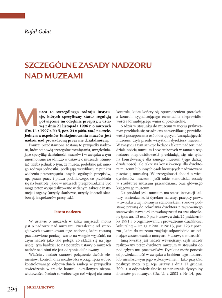 Rafał Golat SZCZEGÓLNE ZASADY NADZORU NAD MUZEAMI uzea to szczególnego rodzaju instytucje, których specyficzny status regulują poświęcone im odrębnie przepisy, z ustawą z dnia 21 listopada 1996 r. o muzeach (Dz. U. z 1997 r. Nr 5, poz. 24 z późn. zm.) na czele. Jednym z aspektów funkcjonowania muzeów jest nadzór nad prowadzoną przez nie działalnością. Poniżej przedstawione zostaną te przypadki nadzoru, które stanowią szczególne rozwiązania, uwzględniające specyfikę działalności muzeów i w związku z tym unormowane zasadniczo w ustawie o muzeach. Pamiętać trzeba jednak o tym, że muzea, podobnie jak innego rodzaju jednostki, podlegają weryfikacji z punktu widzenia przestrzegania innych, ogólnych przepisów, np. prawa pracy i prawa podatkowego, co przekłada się na kontrole, jakie w muzeach przeprowadzane być mogą przez wyspecjalizowane w danym zakresie instytucje i organy (urzędy skarbowe, urzędy kontroli skarbowej, inspektorów pracy itd.). Istota nadzoru W ustawie o muzeach w kilku miejscach mowa jest o nadzorze nad muzeami. Niezależnie od szczegółowych uwarunkowań tego nadzoru, które zostaną przedstawione poniżej, warto na wstępie wyjaśnić, na czym nadzór jako taki polega, co składa się na jego istotę, tym bardziej że na potrzeby ustawy o muzeach nadzór nad nimi nie jest odrębnie definiowany. Właściwy nadzór stanowi połączenie dwóch elementów: kontroli oraz możliwości wyciągnięcia wobec kontrolowanego odpowiednich sankcji w przypadku stwierdzenia w trakcie kontroli określonych nieprawidłowości. Nadzór to wobec tego coś więcej niż sama 294 MUZEALNICTWO kontrola, która kończy się sporządzeniem protokołu z kontroli, sygnalizującego ewentualne nieprawidłowości i formułującego wnioski pokontrolne. Nadzór w stosunku do muzeum w ujęciu praktycznym przekłada się zasadniczo na weryfikację prawidłowości postępowania osób kierujących (zarządzających) muzeum, czyli przede wszystkim dyrektora muzeum. W związku z tym sankcje będące efektem nadzoru nad działalnością muzeum i stwierdzonych w ramach tego nadzoru nieprawidłowości przekładają się nie tylko na konsekwencje dla samego muzeum (jego dalszej działalności), ale także na konsekwencje dla dyrektora muzeum lub innych osób kierujących nadzorowaną placówką muzealną. W szczególności chodzi o wicedyrektorów muzeum, jeśli takie stanowiska zostały w strukturze muzeum przewidziane, oraz głównego księgowego muzeum. Na przykład jeśli muzeum ma status instytucji kultury, stwierdzenie, iż dyrektor naruszył przepisy prawa w związku z zajmowanym stanowiskiem stanowi podstawę prawną do odwołania dyrektora z zajmowanego stanowiska, nawet jeśli powołany został na czas określony (por. art. 15 ust. 5 pkt 3 ustawy z dnia 25 października 1991 r. o organizowaniu i prowadzeniu działalności kulturalnej – Dz. U. z 2001 r. Nr 13, poz. 123 z późn. zm., która do muzeum znajduje odpowiednio uzupełniające zastosowanie z mocy art. 4 ustawy o muzeach). Inną kwestią jest nadzór wewnętrzny, czyli nadzór realizowany przez dyrektora muzeum w stosunku do podległych mu pracowników. Dyrektor może ponosić odpowiedzialność w związku z brakiem tego nadzoru lub niewłaściwym jego wykonywaniem. Jako przykład posłużyć może regulacja ustawy z dnia 17 grudnia 2004 r. o odpowiedzialności za naruszenie dyscypliny finansów publicznych (Dz. U. z 2005 r. Nr 14, poz. Prawo w muzeach 114 z późn. zm.). Na przykład zgodnie z art. 16 ust. 2 tej ustawy naruszeniem dyscypliny finansów publicznych jest dopuszczenie przez kierownika jednostki sektora finansów publicznych do niewykonania zobowiązania jednostki, którego termin płatności upłynął, wskutek zaniedbania lub niewypełnienia obowiązków w zakresie kontroli finansowej. Stanowiące odrębne jednostki organizacyjne muzea publiczne, samorządowe i państwowe mają status jednostek sektora finansów publicznych. Skutkiem nadzoru może być także sygnalizacja o stwierdzonych w jego trakcie nieprawidłowościach, jeśli sankcjonowanie ich wykracza poza kompetencje organu (podmiotu) nadzorującego. Na przykład zgodnie z art. 41 ustawy z dnia 23 lipca 2003 r. o ochronie zabytków i opiece nad zabytkami (Dz. U. Nr 162, poz. 1568 z późn. zm.) w razie stwierdzenia, że działanie lub zaniechanie kierownika kontrolowanej jednostki organizacyjnej lub jej pracownika narusza przepisy art. 108-118 ustawy, wojewódzki konserwator zabytków kieruje odpowiednio do policji, prokuratury albo sądu zawiadomienie o popełnieniu przestępstwa lub wykroczenia. Biorąc pod uwagę szczególne aspekty nadzoru nad muzeami, na uwagę zasługują zasadniczo cztery zakresy tego nadzoru: 1) nadzór organizatora muzeum, 2) nadzór Ministra Kultury i Dziedzictwa Narodowego, 3) „nadzór” rady muzeum oraz 4) nadzór wojewódzkiego konserwatora zabytków. Nadzór organizatora muzeum Zgodnie z art. 5 ust. 4 ustawy o muzeach podmioty tworzące muzea, czyli ministrowie i kierownicy urzędów centralnych, jednostki samorządu terytorialnego, osoby fizyczne, osoby prawne lub jednostki organizacyjne nie posiadające osobowości prawnej, są obowiązane: 1) zapewnić środki potrzebne do utrzymania i rozwoju muzeum, 2) zapewnić bezpieczeństwo zgromadzonym zbiorom, 3) sprawować nadzór nad muzeum. Przepisy ustawowe nie precyzują obowiązków organizatora muzeum w zakresie sprawowanego nad muzeum nadzoru. Formalnie nadzór ten jest sprawowany przez odpowiedni organ podmiotu tworzącego muzeum, czyli np. przez wójta (burmistrza, prezydenta) w przypadku muzeum gminnego, względnie właściciela muzeum, jeśli jest nim osoba fizyczna, w praktyce natomiast (faktycznie) przez odpowiednio upoważnionych przedstawicieli tego organu (właściciela), np. pracowników urzędu gminy, którzy powinni przedłożyć dyrektorowi muzeum swoje upoważnienie w tym zakresie. Oczywiście przeprowadzone w trakcie nadzoru organ