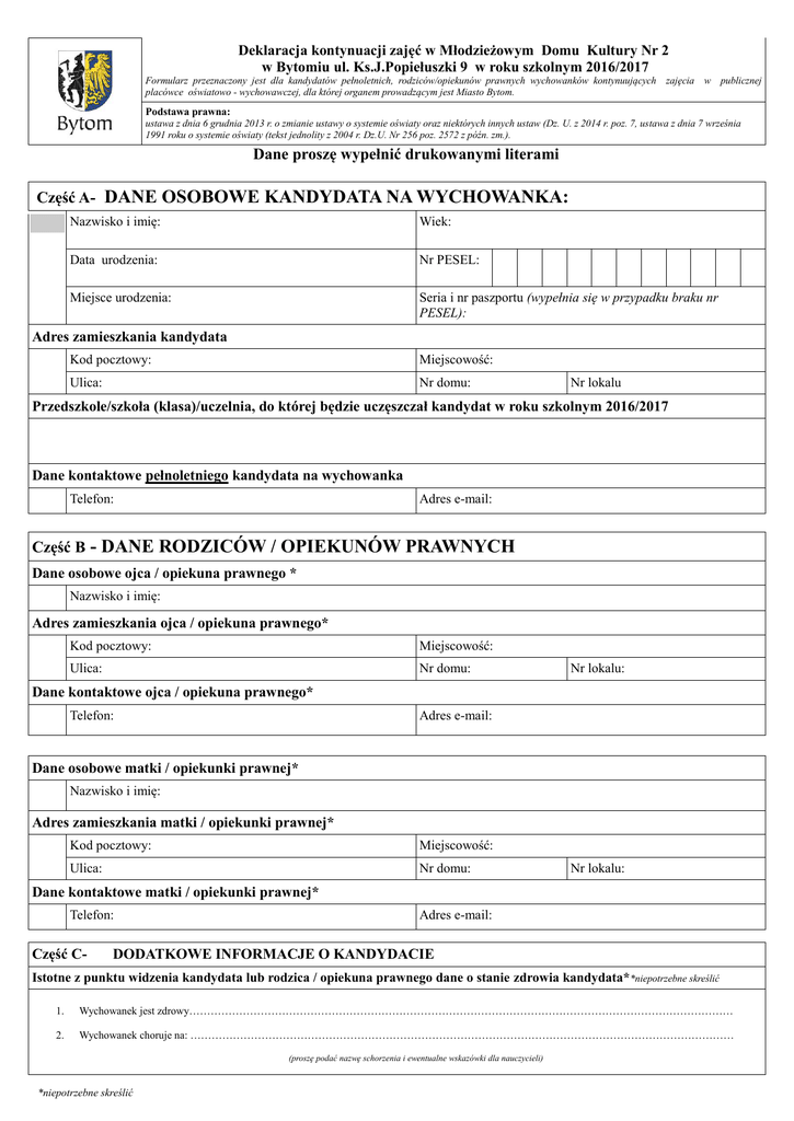 Deklaracja kontynuacji zajęć w Młodzieżowym Domu Kultury Nr 2 w Bytomiu ul. Ks.J.Popiełuszki 9 w roku szkolnym 2016/2017 Formularz przeznaczony jest dla kandydatów pełnoletnich, rodziców/opiekunów prawnych wychowanków kontynuujących zajęcia w publicznej placówce oświatowo - wychowawczej, dla której organem prowadzącym jest Miasto Bytom. Podstawa prawna: ustawa z dnia 6 grudnia 2013 r. o zmianie ustawy o systemie oświaty oraz niektórych innych ustaw (Dz. U. z 2014 r. poz. 7, ustawa z dnia 7 września 1991 roku o systemie oświaty (tekst jednolity z 2004 r. Dz.U. Nr 256 poz. 2572 z późn. zm.). Dane proszę wypełnić drukowanymi literami Część A- DANE OSOBOWE KANDYDATA NA WYCHOWANKA: Nazwisko i imię: Wiek: Data urodzenia: Nr PESEL: Miejsce urodzenia: Seria i nr paszportu (wypełnia się w przypadku braku nr PESEL): Adres zamieszkania kandydata Kod pocztowy: Miejscowość: Ulica: Nr domu: Nr lokalu Przedszkole/szkoła (klasa)/uczelnia, do której będzie uczęszczał kandydat w roku szkolnym 2016/2017 Dane kontaktowe pełnoletniego kandydata na wychowanka Telefon: Adres e-mail: Część B - DANE RODZICÓW / OPIEKUNÓW PRAWNYCH Dane osobowe ojca / opiekuna prawnego * Nazwisko i imię: Adres zamieszkania ojca / opiekuna prawnego* Kod pocztowy: Miejscowość: Ulica: Nr domu: Nr lokalu: Dane kontaktowe ojca / opiekuna prawnego* Telefon: Adres e-mail: Dane osobowe matki / opiekunki prawnej* Nazwisko i imię: Adres zamieszkania matki / opiekunki prawnej* Kod pocztowy: Miejscowość: Ulica: Nr domu: Nr lokalu: Dane kontaktowe matki / opiekunki prawnej* Telefon: Część C- Adres e-mail: DODATKOWE INFORMACJE O KANDYDACIE Istotne z punktu widzenia kandydata lub rodzica / opiekuna prawnego dane o stanie zdrowia kandydata**niepotrzebne skreślić 1. Wychowanek jest zdrowy……………………………………………………………………………………………………………………………………… 2. Wychowanek choruje na: ……………………………………………………………………………………………………………………………………… (proszę podać nazwę schorzenia i ewentualne wskazówki dla nauczycieli) *niepotrzebne skreślić Część D- INFORMACJA JAKIE ZAJĘCIA BĘDĄ KONTYNUOWANE proszę postawić krzyżyk przy zajęciach , które będą kontynuowane przez kandydata Rodzaje zajęć Progi wiekowe dla kandydatów Miejsce odbywania się zajęć Imię i nazwisko nauczyciela Język angielski 9 – 19 lat MDK2/ SP33 /SP54 W. Witkowski Matematyka 10 – 18 lat MDK2 E.Ogonowska Polonistyczne 13-20 lat MDK2 J.Hałgas Teatralne 6-15 lat MDK2 J.Hałgas Polonistyczne 7-13 lat MDK2 M.Bogacka Klub z wyobraźnią Karb 6-18 lat MDK2 R.Korytkowska Klub z wyobraźnią Miechowice 7-18 lat SM Muza Miechowice R.Korytkowska Komputerowe – szkoły podstawowe 7 - 12 lat G-nr 8 / MDK2 Z.Reich Komputerowe – gimnazja 13-16 lat G-nr 8 / MDK2 Z.Reich Audio – Video 7-16 lat G- nr 8 / MDK2 Z.Reich Języka angielskiego dla przedszkolaków – Karb 3-6 lat MDK2/Muza/Ochronka Chlapik Dariusz Języka angielskiego dla klas I-III- Karb 7-9 lat MDK2 Chlapik Dariusz Języka angielskiego dla przedszkolaków Miechowice 3-6 lat SM Muza Miechowice Chlapik Dariusz Języka angielskiego dla klas I-IIIMiechowice 7-9 lat SM Muza Miechowice Chlapik Dariusz Języka niemieckiego 7-18 lat MDK2 A.Wilczek/K.Giertyczka Zajęcia Techniczne –projektowania i budowy pojazdów 6 – 26 lat MDK2/BOE R .Kownacki Sekcja gier i zabaw dla przedszkolaków 4-6 lat SP 21 P. Niżnik Sekcja gier i zabaw dla klas I-III 7-9 lat SP21 P. Niżnik Sekcja gier zespołowych dziewcząt i chłopców 7-12 lat SP 21 P.Niżnik Siatkówka 9-12 lat Gimnazjum nr 8 Wacław Rydzyński Rekreacja sportowa 13-17 lat Gimnazjum nr 8 M.Rydzyński Karate – ekspresji ruchowej 4-18 lat MDK 2 M.Szukalski Sekcja rekreacji sportowej chłopców (Holl) 6 – 12 lat MDK 2 G.Mączka 6 – 12 lat MDK 2 P.Niżnik 13– 24 lat MDK 2 M.Rydzyński Szachy 6-18 lat MDK 2 G.Mączka Modelarstwo gr.I 8-26 lat MDK 2 K.Moskwa Modelarstwo gr.II 10 -26 lat MDK 2 A.Zielony Taneczne Smyk- Karb Taneczne New art. Karb Taneczne New art. Miechowice 4-8 lat 9-11 9-11 MDK 2 MDK2 SM Muza Miechowice Anna Wantuch Anna Wantuch Anna Wantuch Taneczne Smyk gr. Początkująca – Miechowice Taneczne Smyk gr.Zaawansowana – 4-5 lat SM Muza Miechowice Anna Wantuch 6-8 lat SM Muza Miechowice Anna Wantuch Bilard, tenis stołowy ,dart , pilkarzyki Sekcja rekreacji sportowej dziewcząt (Holl) Bilard, tenis stołowy ,dart , pilkarzyki Sekcja rekreacji sportowej chłopców i dziewcząt grupy starsze (Holl) Bilard, tenis stołowy ,dart , pilkarzyki Tak X Miechowice Rytmika dla MP 36 i Ochronki 2,5- 6 lat MDK 2/Ochronka J.Prus-Kaczkowska Rytmika dla MP 36 Taniec breakdance Śpiew i emisja głosu – grupa Karb Śpiew i emisja głosu –Miechowice Zespoły wokalne Gitara-Miechowice Gitara – Karb Zespoły muzyczne Instrumenty klawiszowe- gr. początkująca Instrumenty klawiszowe- gr. Zaawansowana Keyboard –Miechowice/ Karb 3-6 lat 5-18 lat 5-25 lat 5- 25 lat 7-25 lat 7-19 lat 7-19 lat 10-26 4 - 24 lat 8- 24 lat MDK 2/SP21 MDK2 MDK 2 SM Muza Miechowice MDK2 SM Muza Miechowice MDK2 MDK2 MDK 2 MDK 2 K.Leciej-Kawalec W.Woźniczko A.Akram A.Akram A.Akram J.Hadryś J.Reclik J.Reclik J.Prus-Kaczkowska J.Prus-Kaczkowska 6-18 lat W.Kaczkowski Keyboard –Karb Krawieckie, haft, koraliki, 6-24 lat 8-16 lat SM Muza Miechowice MDK2 MDK 2 MDK 2 Plastyczne- Plastuś Plastyczne- Pinokio –Miechowice Plastyczne – Akwarela Plastyczne Tempera Plastyczne – pop art.- Miechowice Ceramiczne Dekoratorskie Koło twórczości niezależnej integracyjne 4- 7 lat 3-9 lat 8-14 lat 12-26 lat 9-17 lat 7-26 lat 10-18lat Niepełnosprawni bez ograniczeń wiekowych MDK 2 ZSO 5 MDK2 MDK2 ZSO5 MDK 2 MDK2 MDK 2 A.Muschalik A.Muschalik A.Muschalik A.Muschalik A.Muschalik R.Grzybek R.Grzybek R.Grzybek K.Leciej-Kawalec Renata Kuciak Oświadczenia: 1. Oświadczam, że ws