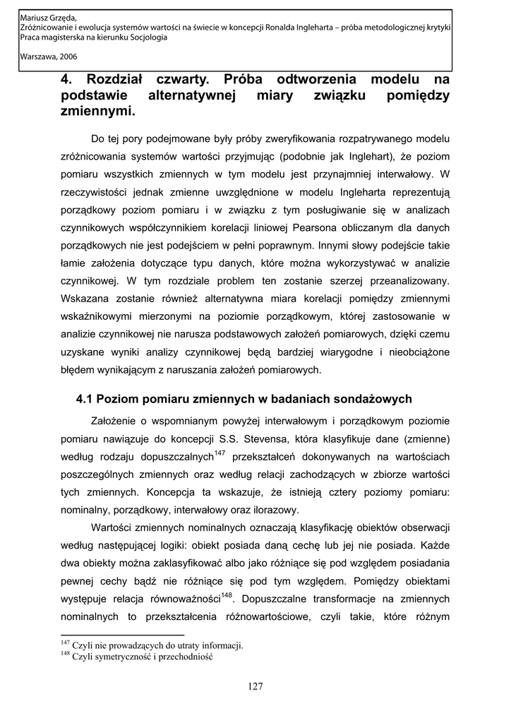 Mariusz Grzęda, Zróżnicowanie i ewolucja systemów wartości na świecie w koncepcji Ronalda Ingleharta – próba metodologicznej krytyki Praca magisterska na kierunku Socjologia Warszawa, 2006 4. Rozdział czwarty. Próba odtworzenia modelu na podstawie alternatywnej miary związku pomiędzy zmiennymi. Do tej pory podejmowane były próby zweryfikowania rozpatrywanego modelu zróżnicowania systemów wartości przyjmując (podobnie jak Inglehart), że poziom pomiaru wszystkich zmiennych w tym modelu jest przynajmniej interwałowy. W rzeczywistości jednak zmienne uwzględnione w modelu Ingleharta reprezentują porządkowy poziom pomiaru i w związku z tym posługiwanie się w analizach czynnikowych współczynnikiem korelacji liniowej Pearsona obliczanym dla danych porządkowych nie jest podejściem w pełni poprawnym. Innymi słowy podejście takie łamie założenia dotyczące typu danych, które można wykorzystywać w analizie czynnikowej. W tym rozdziale problem ten zostanie szerzej przeanalizowany. Wskazana zostanie również alternatywna miara korelacji pomiędzy zmiennymi wskaźnikowymi mierzonymi na poziomie porządkowym, której zastosowanie w analizie czynnikowej nie narusza podstawowych założeń pomiarowych, dzięki czemu uzyskane wyniki analizy czynnikowej będą bardziej wiarygodne i nieobciążone błędem wynikającym z naruszania założeń pomiarowych. 4.1 Poziom pomiaru zmiennych w badaniach sondażowych Założenie o wspomnianym powyżej interwałowym i porządkowym poziomie pomiaru nawiązuje do koncepcji S.S. Stevensa, która klasyfikuje dane (zmienne) według rodzaju dopuszczalnych147 przekształceń dokonywanych na wartościach poszczególnych zmiennych oraz według relacji zachodzących w zbiorze wartości tych zmiennych. Koncepcja ta wskazuje, że istnieją cztery poziomy pomiaru: nominalny, porządkowy, interwałowy oraz ilorazowy. Wartości zmiennych nominalnych oznaczają klasyfikację obiektów obserwacji według następującej logiki: obiekt posiada daną cechę lub jej nie posiada. Każde dwa obiekty można zaklasyfikować albo jako różniące się pod względem posiadania pewnej cechy bądź nie różniące się pod tym względem. Pomiędzy obiektami występuje relacja równoważności148. Dopuszczalne transformacje na zmiennych nominalnych to przekształcenia różnowartościowe, czyli takie, które różnym 147 148 Czyli nie prowadzących do utraty informacji. Czyli symetryczność i przechodniość 127 argumentom przypisują różne wartości. Innymi słowy wszystkie takie przekształcenia, które zachowują wyjściowe relacje równości i różności pomiędzy obiektami są tu dozwolone. Kolejny poziom pomiaru stanowią zmienne porządkowe. Dane reprezentowane na porządkowym poziomie pomiaru są uporządkowane ze względu na stopień posiadania danej cechy. Podobnie jak w przypadku skali nominalnej i w tym przypadku o każdych dwóch obiektach można powiedzieć czy są od siebie różne czy takie same pod względem mierzonej cechy. Jednak nie tylko. Można bowiem również określić porządek kategorii reprezentujących mierzoną cechę, to znaczy wskazać relację większości (bądź mniejszości) łączącą dwie różne kategorie. A zatem w tym przypadku obiekty są pogrupowane w poszczególne kategorie, które oznaczają pewien porządek. Zmienne mierzone na poziomie porządkowym można przekształcać tylko w taki sposób, który zachowuje ten porządek. Należy tu podkreślić, że wartości skali porządkowej nie mówią nic o odległości pomiędzy poszczególnymi kategoriami. Są bowiem tylko liczbami porządkowymi, określającymi dla każdej kategorii jej rangę (miejsce w porządku). Nie wolno zatem wartości zmiennych porządkowych do siebie dodawać, odejmować ani mnożyć. Jedynym dopuszczalnym przekształceniem149 danych porządkowych jest dodawanie do każdej wartości zmiennej pewnej stałej (X+s). Kolejny poziom pomiaru zmiennych stanowi poziom interwałowy (przedziałowy). O obiektach, którym przypisywane są wartości na skalach interwałowych, można mówić nie tylko w kategoriach równości-różności, a także „jest większy niż” lub „mniejszy niż” (pod względem danej cechy), lecz także można formułować twierdzenia na temat wielkości zaobserwowanych różnic. Tego rodzaju zmienne umożliwiają dokładne określenie jaka jest różnica pomiędzy obiektami pod względem pewnej cechy. Przykładowo można określić, że wartość przypisana obiektowi A jest pod względem danej cechy mniejsza (albo większa) o x od wartości obiektu B. Nie wolno natomiast stwierdzić, że wartość A jest y-razy mniejsza (albo większa) od wartości obiektu B. Wynika to z braku istnienia zera absolutnego150 w skalach interwałowych. W przypadku skal interwałowych na wartościach zmiennych dopuszczalne są przekształcenia typu liniowego (tX+s). 149 przekształcenie ściśle monotoniczne rosnące. przykładem skali interwałowej może być temperatura Celsjusza. Punkt zerowy na tej skali nie oznacza braku temperatury – czyli nie ma charakteru naturalnego (bezwzględnego, absolutnego). 150 - 128 - Następny poziom pomiaru zmiennych stanowi poziom ilorazowy (stosunkowy). Zakłada się, że skale tego rodzaju mają naturalny punkt zerowy. Ponadto o wartościach tego typu zmiennych można formułować twierdzenia o tym, że obiekt A ma wartości pewnej zmiennej mierzonej na poziomie ilorazowym x razy większe/mniejsze od B. Oprócz tego można o obiektach klasyfikowanych za pomocą tego rodzaju skal formułować twierdzenia na temat równości (różności), większości (mniejszości), oraz różnicach o pewną wartość. Wartości skal ilorazowych podlegają przekształceniu podobieństwa (tX).151 W przypadku badań sondażowych (w tym również badań WVS) badacze mają do czynienia ze zmiennymi, które najczęściej są mierzone na skalach nominalnych lub porządkowych. Znacznie rzadziej natomiast poziom pomiaru je