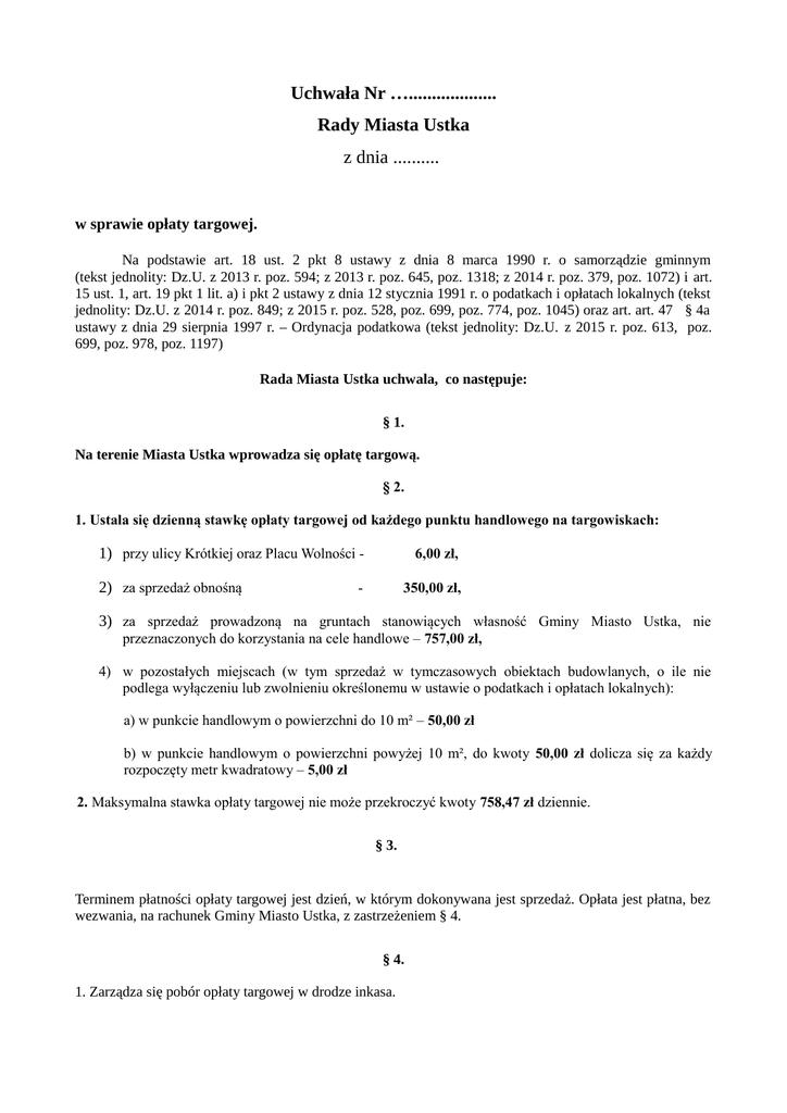 Uchwała Nr …................... Rady Miasta Ustka z dnia .......... w sprawie opłaty targowej. Na podstawie art. 18 ust. 2 pkt 8 ustawy z dnia 8 marca 1990 r. o samorządzie gminnym (tekst jednolity: Dz.U. z 2013 r. poz. 594; z 2013 r. poz. 645, poz. 1318; z 2014 r. poz. 379, poz. 1072) i art. 15 ust. 1, art. 19 pkt 1 lit. a) i pkt 2 ustawy z dnia 12 stycznia 1991 r. o podatkach i opłatach lokalnych (tekst jednolity: Dz.U. z 2014 r. poz. 849; z 2015 r. poz. 528, poz. 699, poz. 774, poz. 1045) oraz art. art. 47 § 4a ustawy z dnia 29 sierpnia 1997 r. – Ordynacja podatkowa (tekst jednolity: Dz.U. z 2015 r. poz. 613, poz. 699, poz. 978, poz. 1197) Rada Miasta Ustka uchwala, co następuje: § 1. Na terenie Miasta Ustka wprowadza się opłatę targową. § 2. 1. Ustala się dzienną stawkę opłaty targowej od każdego punktu handlowego na targowiskach: 1) przy ulicy Krótkiej oraz Placu Wolności 2) za sprzedaż obnośną 6,00 zł, - 350,00 zł, 3) za sprzedaż prowadzoną na gruntach stanowiących własność Gminy Miasto Ustka, nie przeznaczonych do korzystania na cele handlowe – 757,00 zł, 4) w pozostałych miejscach (w tym sprzedaż w tymczasowych obiektach budowlanych, o ile nie podlega wyłączeniu lub zwolnieniu określonemu w ustawie o podatkach i opłatach lokalnych): a) w punkcie handlowym o powierzchni do 10 m² – 50,00 zł b) w punkcie handlowym o powierzchni powyżej 10 m², do kwoty 50,00 zł dolicza się za każdy rozpoczęty metr kwadratowy – 5,00 zł 2. Maksymalna stawka opłaty targowej nie może przekroczyć kwoty 758,47 zł dziennie. § 3. Terminem płatności opłaty targowej jest dzień, w którym dokonywana jest sprzedaż. Opłata jest płatna, bez wezwania, na rachunek Gminy Miasto Ustka, z zastrzeżeniem § 4. § 4. 1. Zarządza się pobór opłaty targowej w drodze inkasa. 2. Do poboru opłaty targowej na targowisku przy ul. Krótkiej wyznacza się Ośrodek Sportu i Rekreacji w Ustce. 3. Do poboru opłaty na pozostałych targowiskach wyznacza się osoby wskazane w Załączniku Nr 1. 4. Ustala się wynagrodzenie inkasentom, o których mowa w ust. 2 i ust. 3, za pobór opłaty targowej w wysokości 12% pobranych i terminowo odprowadzanych kwot. 5. Inkasenci pobraną opłatę targową odprowadzają: a) do dnia 14-go każdego miesiąca – opłaty pobrane w okresie od 1-go do 10-go dnia każdego miesiąca, b) do dnia 24-go każdego miesiąca – opłaty pobrane w okresie od 11-go do 20-go dnia każdego miesiąca, c) do dnia 4-go każdego miesiąca miesiąca. - opłaty pobrane w okresie od 21-go do końca poprzedniego 6. Wypłata wynagrodzenia nastąpi w terminie do 7 dni od dnia ostatniej wpłaty w danym miesiącu. § 5. Z dniem wejścia w życie niniejszej uchwały, traci moc Uchwała Nr XXVII/230/2012 Rady Miasta Ustka z dnia 25 października 2012 r. w sprawie opłaty targowej na 2013 r. § 6. Uchwała wchodzi w życie po upływie 14 dni od dnia ogłoszenia w Dzienniku Urzędowym Województwa Pomorskiego, nie wcześniej jednak niż z dniem 1 stycznia 2016 r. Wnioskodawca: Burmistrz Miasta Uzasadnienie do projektu uchwały w sprawie opłaty targowej. Na podstawie Obwieszczenia Ministra Finansów z dnia 5 sierpnia 2015 r. w sprawie górnych granic stawek kwotowych podatków i opłat lokalnych w 2016 r. obniżona została górna stawka o 1,2 % ( spadek cen towarów i usług w I -szym półroczu 2015 r. do I-szego półrocza 2014 r. ). Dotychczasowe ( w 2015 roku) stawki opłaty targowej stanowiły jedynie od 0,79 % do 99,9 % maksymalnej stawki określonej przez Ministra Finansów. Stawka maks. wg Min. Fin. Stawka obowiązujące w 2015 roku Stawka proponowana na 2016 rok % wzrost a) na targowiskach ul. Krótka i Plac Wolności: 758,47 zł 6,00 zł 6,00 zł - 45,00 zł 350,00 zł 678 % 757,00 zł 757,00 zł - 30,00 zł 50,00 zł 67 % 5,00 zł 5,00 zł b) sprzedaż obnośna: 758,47 zł c) grunty Gminy Miasto nie przeznaczone do handlu: 758,47 zł d) w pozostałych miejscach: 1/ do 10 m² - 758,47 zł 2/ powyżej 10 m² – za każdy rozpoczęty m2 - Przyjęcie starych stawek opłaty targowej nie zwiększy dochodów budżetu miasta w 2016 r.,natomiast przyjęcie zmienionych stawek zwiększy dochody budżetu miasta w 2016 r. o ok. 10.000,00 zł. Załącznik Nr 1 do uchwały Nr …../......./2015 z dnia …... października 2015 r. Wykaz osób wyznaczonych na inkasentów opłaty targowej. 1. Adamczewski Przemysław 2. Jarząbkowski Mariusz 3. Leśniewski Tomasz 4. Przymorski Waldemar 5. Stodoła Krzysztof 6. Szczepaniak Włodzimierz