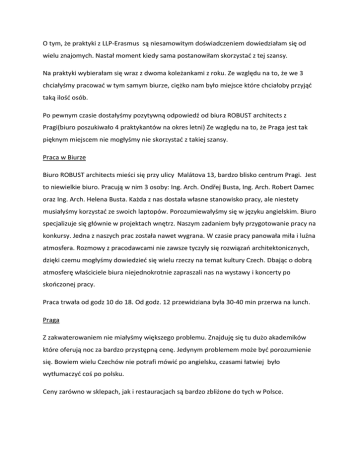 O tym, że praktyki z LLP-Erasmus są niesamowitym doświadczeniem dowiedziałam się od wielu znajomych. Nastał moment kiedy sama postanowiłam skorzystad z tej szansy. Na praktyki wybierałam się wraz z dwoma koleżankami z roku. Ze względu na to, że we 3 chciałyśmy pracowad w tym samym biurze, ciężko nam było miejsce które chciałoby przyjąd taką ilośd osób. Po pewnym czasie dostałyśmy pozytywną odpowiedź od biura ROBUST architects z Pragi(biuro poszukiwało 4 praktykantów na okres letni) Ze względu na to, że Praga jest tak pięknym miejscem nie mogłyśmy nie skorzystad z takiej szansy. Praca w Biurze Biuro ROBUST architects mieści się przy ulicy Malátova 13, bardzo blisko centrum Pragi. Jest to niewielkie biuro. Pracują w nim 3 osoby: Ing. Arch. Ondřej Busta, Ing. Arch. Robert Damec oraz Ing. Arch. Helena Busta. Każda z nas dostała własne stanowisko pracy, ale niestety musiałyśmy korzystad ze swoich laptopów. Porozumiewałyśmy się w języku angielskim. Biuro specjalizuje się głównie w projektach wnętrz. Naszym zadaniem były przygotowanie pracy na konkursy. Jedna z naszych prac została nawet wygrana. W czasie pracy panowała miła i luźna atmosfera. Rozmowy z pracodawcami nie zawsze tyczyły się rozwiązao architektonicznych, dzięki czemu mogłyśmy dowiedzied się wielu rzeczy na temat kultury Czech. Dbając o dobrą atmosferę właściciele biura niejednokrotnie zapraszali nas na wystawy i koncerty po skooczonej pracy. Praca trwała od godz 10 do 18. Od godz. 12 przewidziana była 30-40 min przerwa na lunch. Praga Z zakwaterowaniem nie miałyśmy większego problemu. Znajduję się tu dużo akademików które oferują noc za bardzo przystępną cenę. Jedynym problemem może byd porozumienie się. Bowiem wielu Czechów nie potrafi mówid po angielsku, czasami łatwiej było wytłumaczyd coś po polsku. Ceny zarówno w sklepach, jak i restauracjach są bardzo zbliżone do tych w Polsce. Komunikacja w Pradze jest bardzo dobrze rozwinięta. Za pomocą metra, autobusów lub tramwajów, które jeźdźą bardzo często bez problemu dojedziemy do centrum, lub na obrzeża miasta. Praga jest jednym z najpiękniejszych miast jakie widziałam. Zabudowa z pewnością zachwyci każdego przyszłego architekta. Jest uważana za jedno z najbardziej atrakcyjnych miast Europy, z tego względu corocznie odwiedzają ją liczne rzesze turystów. Podsumowanie Praktyki to niesamowita okazją na poznanie obcej kultury, zdobycia doświadczenia zawodowego, jak i są ogromną możliwością nauki języka. Serdecznie namawiam do skorzystania.