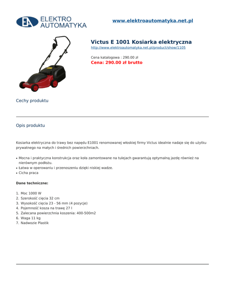 www.elektroautomatyka.net.pl Victus E 1001 Kosiarka elektryczna http://www.elektroautomatyka.net.pl/product/show/1105 Cena katalogowa : 290.00 zł Cena: 290.00 zł brutto Cechy produktu Opis produktu Kosiarka elektryczna do trawy bez napędu E1001 renomowanej włoskiej firmy Victus idealnie nadaje się do użytku prywatnego na małych i średnich powierzchniach. ● ● ● Mocna i praktyczna konstrukcja oraz koła zamontowane na tulejach gwarantują optymalną jazdę również na nierównym podłożu. Łatwa w operowaniu i przenoszeniu dzięki niskiej wadze. Cicha praca Dane techniczne: 1. 2. 3. 4. 5. 6. 7. Moc 1000 W Szerokość cięcia 32 cm Wysokość cięcia 23 - 56 mm (4 pozycje) Pojemność kosza na trawę 27 l Zalecana powierzchnia koszenia: 400-500m2 Waga 11 kg Nadwozie Plastik ELEKTRO-AUTOMATYKA Sprzedaż elektronarzędzi, urządzeń spawalniczych, maszyn budowlanych, pneumatyki, narzędzi warsztatowych, firmowych ubrań roboczych oraz maszyn ogrodowo leśnych. Sklep Bochnia ul. Brzeska 50 32-700 Bochnia Sklep Brzesko ul. Szarych Szeregów 23 32-800 Brzesko Serwis, Magazyn ul. Św. Brata Alberta 4 32-800 Brzesko tel. 691 572 333 e-mail: [email protected] tel. 609 523 230 e-mail: [email protected] tel. 609 523 645 e-mail: [email protected]