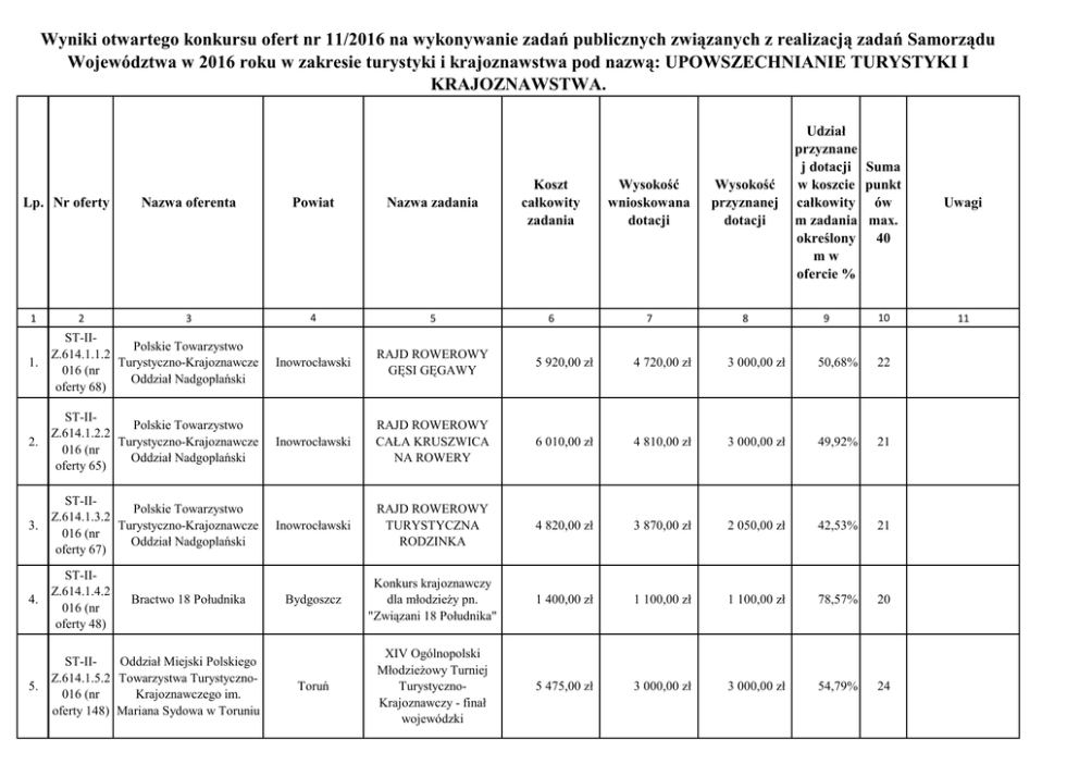 Wyniki otwartego konkursu ofert nr 11/2016 na wykonywanie zadań publicznych związanych z realizacją zadań Samorządu Województwa w 2016 roku w zakresie turystyki i krajoznawstwa pod nazwą: UPOWSZECHNIANIE TURYSTYKI I KRAJOZNAWSTWA. Wysokość wnioskowana dotacji Wysokość przyznanej dotacji 7 8 Udział przyznane j dotacji Suma w koszcie punkt całkowity ów m zadania max. określony 40 mw ofercie % Nazwa oferenta Powiat Nazwa zadania Koszt całkowity zadania 3 4 5 6 1. ST-IIPolskie Towarzystwo Z.614.1.1.2 Turystyczno-Krajoznawcze 016 (nr Oddział Nadgoplański oferty 68) Inowrocławski RAJD ROWEROWY GĘSI GĘGAWY 5 920,00 zł 4 720,00 zł 3 000,00 zł 50,68% 22 2. ST-IIPolskie Towarzystwo Z.614.1.2.2 Turystyczno-Krajoznawcze 016 (nr Oddział Nadgoplański oferty 65) Inowrocławski RAJD ROWEROWY CAŁA KRUSZWICA NA ROWERY 6 010,00 zł 4 810,00 zł 3 000,00 zł 49,92% 21 3. ST-IIPolskie Towarzystwo Z.614.1.3.2 Turystyczno-Krajoznawcze 016 (nr Oddział Nadgoplański oferty 67) Inowrocławski RAJD ROWEROWY TURYSTYCZNA RODZINKA 4 820,00 zł 3 870,00 zł 2 050,00 zł 42,53% 21 4. ST-IIZ.614.1.4.2 016 (nr oferty 48) Bydgoszcz Konkurs krajoznawczy dla młodzieży pn. "Związani 18 Południka" 1 400,00 zł 1 100,00 zł 1 100,00 zł 78,57% 20 5. ST-IIOddział Miejski Polskiego Z.614.1.5.2 Towarzystwa Turystyczno016 (nr Krajoznawczego im. oferty 148) Mariana Sydowa w Toruniu Toruń XIV Ogólnopolski Młodzieżowy Turniej TurystycznoKrajoznawczy - finał wojewódzki 5 475,00 zł 3 000,00 zł 3 000,00 zł 54,79% 24 Lp. Nr oferty 1 2 Bractwo 18 Południka 9 10 Uwagi 11 6. ST-IIOddział Miejski Polskiego Z.614.1.6.2 Towarzystwa Turystyczno016 ( nr Krajoznawczego im. oferty 145) Mariana Sydowa w Toruniu 7. ST-IIOddział Miejski Polskiego Z.614.1.7.2 Towarzystwa Turystyczno016 (nr Krajoznawczego im. oferty 147) Mariana Sydowa w Toruniu 8. ST-IIWiejskie Stowarzyszenie Z.614.1.8.2 Kulturalno-Oświatowe 016 ( nr "Edukacja i Przyszłość" w oferty 218) Brąchnówku 9. ST-IIZ.614.1.9.2 016 (nr oferty 50) Toruń Odnawianie szlaków turystycznych pieszych na terenie województwa kujawsko-pomorskiego 4 900,00 zł 6 280,00 zł 4 000,00 zł 81,63% 22 Toruń X Zlot Miłośników Pojezierza Brodnickiego szlakiem wrześniowej linii obrony z 1939 roku 10 738,00 zł 6 000,00 zł 2 500,00 zł 23,28% 25 Toruński Przez Kujawy i Pomorze 5 950,00 zł 3 700,00 zł - zł 0,00% 0 Towarzystwo Inicjatyw Kulturalnych Bydgoszcz Konkurs literacki dla młodych krajoznawców pn. "W drodze" 1 300,00 zł 1 000,00 zł 1 000,00 zł 76,92% 20 ST-IIZ.614.1.10. 10. 2016 (nr oferty 348) Oddział Kujawski Polskiego Towarzystwa TurystycznoKrajoznawczego Włocławek X Wojewódzki Zlot Aktywnych Krajoznawców 6 600,00 zł 3 950,00 zł 1 500,00 zł 22,73% 23 ST-IIZ.614.1.11. 11. 2016 (nr oferty 346) Oddział Kujawski Polskiego Towarzystwa TurystycznoKrajoznawczego Włocławek Ogólnopolski Młodzieżowy Konkurs Krajoznawczy "Poznajemy Ojcowiznę" Etap Wojewódzki 3 900,00 zł 2 700,00 zł 2 700,00 zł 69,23% 27 ST-IIZ.614.1.12. 12. 2016 (nr oferty 613) Bydgoska Lokalna Organizacja Turystyczna "ByLOT" Bydgoszcz Bydgoskie Forum Turystyki 5 678,00 zł 5 000,00 zł 3 000,00 zł 52,84% 20 błąd formalny oferta nie stanowi odpowiedzi na przedmiotowy konkurs ST-IIPolskie Towarzystwo Z.614.1.13. Turystyczno-Krajoznawcze 13. 2016 (nr Oddział im. Antoniego oferty 184) Słowińskiego w Strzelnie Mogileński "POZNAJEMY SKARBY KUJAW NA ROWERZE I NIE TYLKO Z OKAZJI 1050LECIA CHRZTU POLSKI" 5 750,00 zł 4 950,00 zł 2 950,00 zł 51,30% 22 5 350,00 zł 4 761,00 zł 4 000,00 zł 74,77% 23 ST-IIZ.614.1.14. 14. 2016 (nr oferty 655) Lokalna Organizacja Turystyczna Toruń Toruń Organizacja Lokalnego Forum Turystyki w Toruniu ST-IIZ.614.1.15. 15. 2016 (nr oferty 661) Lokalna Organizacja Turystyczna Toruń Toruń Toruńskie szkolenie dla branży turystycznej 2 490,00 zł 2 206,00 zł 2 000,00 zł 80,32% 20 ST-IIZ.614.1.16. 16. 2016 (nr oferty 671) Lokalna Organizacja Turystyczna Toruń Toruń Toruńskie szkolenie "Promocja i marketing w turystyce" 2 350,00 zł 2 100,00 zł - zł 0,00% 18 ST-IIZ.614.1.17. 17. 2016 (nr oferty 851) Automobilklub Toruński ST-IIFundacja Zrównoważonego Z.614.1.18. 18. Rozwoju Lokalnego 2016 (nr "Cisowy Fyrtel" oferty 361) ST-IIZ.614.1.19. 19. 2016 (nr oferty 564) Międzyszkolny Klub Sportowy "SKARMAT" ST-IIZ.614.1.20. 20. 2016 (nr oferty 636) Inowrocławska Lokalna Organizacja Turystyczna Toruń XX Jubileuszowy Rajd Citroena i XXII Afrodyty 16 164,00 zł 6 000,00 zł - zł 0,00% 0 Tucholski III Borowiacki Rajd Rowerowy 4 920,00 zł 2 290,00 zł 1 100,00 zł 22,36% 20 Toruń Ogólnopolskie Marsze na Orietację TOTAL'2016 9 950,00 zł 4 850,00 zł 1 000,00 zł 10,05% 20 Inowrocławski I Lokalne Forum Turystyki w Inowrocławiu 5 515,00 zł 4 955,00 zł 4 000,00 zł 72,53% 26 błąd formalny oferta nie stanowi odpowiedzi na przedmiotowy konkurs ST-IIZ.614.1.21. 21. 2016 (nr oferty 495) Fundacja Chopin w Ogrodzie Sztuk GolubskoDobrzyński Camino, Chopin i nasze skarby 5 000,00 zł 4 000,00 zł - zł 0,00% 0 ST-IIPolskie Towarzystwo Z.614.1.22. 22. Turystyczno-Krajoznawcze 2016 (nr Oddział w Inowrocławiu oferty 434) Inowrocławski VI Rajd Sapera 3 320,00 zł 2 820,00 zł 2 820,00 zł 84,94% 28 ST-IIPolskie Towarzystwo Z.614.1.23. 23. Turystyczno-Krajoznawcze 2016 (nr Oddział w Inowrocławiu oferty 459) Inowrocławski VIII Rajd im. kpt Pawła Cymsa 3 190,00 zł 2 640,00 zł 2 640,00 zł 82,76% 31 Inowrocławski Odnowa szlaków KP3601-n 20,2 km oraz KP4153-z dł. 12 km 2 576,00 zł 2 318,00 zł 2 318,00 zł 89,98% 26 Bydgoszcz GeoCaching - Gry terenowe sposobem na propagowanie wiedzy krajoznawczej o regionie 15 440,00 zł 10 000,00 zł 2 000,00 zł 12,95% 22 Toruń IV Wojewódzki Konkurs Katarzynkowy dla dzieci szkół podstawowych 2 680,00 zł 2 280,00 zł 2 280,00 zł 85,07% 26 Tucholski Regionalne Forum Turystyki - Bory Tucholskie dla turystyki 5 900,00 zł 5 000,00 zł 4 000,00 zł 67,80% 22 Grudziądzki "Lampion Ekotona 2016" 6