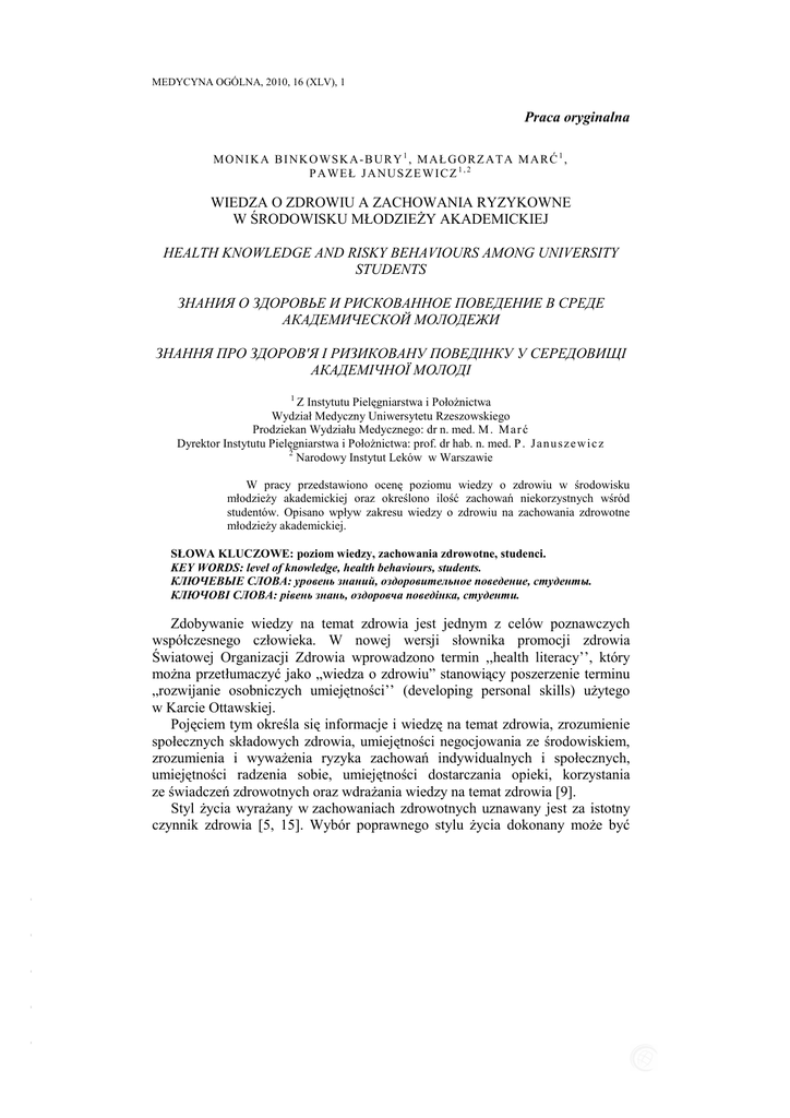 MEDYCYNA OGÓLNA, 2010, 16 (XLV), 1 Praca oryginalna M O N I K A B I N K O WS K A - B U R Y 1 , M A Ł G O R Z A T A M A R Ć 1 , P A WE Ł J A N U S Z E W I C Z 1 , 2 WIEDZA O ZDROWIU A ZACHOWANIA RYZYKOWNE W ŚRODOWISKU MŁODZIEśY AKADEMICKIEJ HEALTH KNOWLEDGE AND RISKY BEHAVIOURS AMONG UNIVERSITY STUDENTS ЗНАНИЯ О ЗДОРОВЬЕ И РИСКОВАННОЕ ПОВЕДЕНИЕ В СРЕДЕ АКАДЕМИЧЕСКОЙ МОЛОДЕЖИ ЗНАННЯ ПРО ЗДОРОВ'Я І РИЗИКОВАНУ ПОВЕДІНКУ У СЕРЕДОВИЩІ АКАДЕМІЧНОЇ МОЛОДІ 1 Z Instytutu Pielęgniarstwa i PołoŜnictwa Wydział Medyczny Uniwersytetu Rzeszowskiego Prodziekan Wydziału Medycznego: dr n. med. M . M a r ć Dyrektor Instytutu Pielęgniarstwa i PołoŜnictwa: prof. dr hab. n. med. P . J a n u s z e w i c z 2 Narodowy Instytut Leków w Warszawie W pracy przedstawiono ocenę poziomu wiedzy o zdrowiu w środowisku młodzieŜy akademickiej oraz określono ilość zachowań niekorzystnych wśród studentów. Opisano wpływ zakresu wiedzy o zdrowiu na zachowania zdrowotne młodzieŜy akademickiej. SŁOWA KLUCZOWE: poziom wiedzy, zachowania zdrowotne, studenci. KEY WORDS: level of knowledge, health behaviours, students. КЛЮЧЕВЫЕ СЛОВА: уровень знаний, оздоровительное поведение, студенты. КЛЮЧОВІ СЛОВА: рівень знань, оздоровча поведінка, студенти. - - - - - Zdobywanie wiedzy na temat zdrowia jest jednym z celów poznawczych współczesnego człowieka. W nowej wersji słownika promocji zdrowia Światowej Organizacji Zdrowia wprowadzono termin ,,health literacy’’, który moŜna przetłumaczyć jako „wiedza o zdrowiu” stanowiący poszerzenie terminu „rozwijanie osobniczych umiejętności’’ (developing personal skills) uŜytego w Karcie Ottawskiej. Pojęciem tym określa się informacje i wiedzę na temat zdrowia, zrozumienie społecznych składowych zdrowia, umiejętności negocjowania ze środowiskiem, zrozumienia i wywaŜenia ryzyka zachowań indywidualnych i społecznych, umiejętności radzenia sobie, umiejętności dostarczania opieki, korzystania ze świadczeń zdrowotnych oraz wdraŜania wiedzy na temat zdrowia [9]. Styl Ŝycia wyraŜany w zachowaniach zdrowotnych uznawany jest za istotny czynnik zdrowia [5, 15]. Wybór poprawnego stylu Ŝycia dokonany moŜe być Wiedza o zdrowiu a zachowania ryzykowne … 101 wtedy, kiedy człowiek dysponuje odpowiednim poziomem wiedzy o jego zakresie i znaczeniu [8]. Docierające do człowieka z róŜnych źródeł informacje o zdrowiu i chorobie są przewaŜnie chętnie przez niego przyswajane, a w połączeniu z wiedzą otrzymaną w wyniku oddziaływań wychowawczych w rodzinie i planowanego procesu dydaktycznego wpływają na kształtowanie się jego indywidualnej postawy wobec zdrowia. W zaleŜności od fazy cyklu Ŝyciowego człowieka, uwarunkowań społeczno– kulturowych, doświadczeń zdrowotnych oraz aktualnej sytuacji zdrowotnej kształtowanie się komponentu poznawczego postawy wobec zdrowia podlega wciąŜ modyfikacjom [10]. CEL BADANIA Celem podjętego badania była ocena związku pomiędzy poziomem wiedzy o zdrowiu a zachowaniami ryzykownymi występującymi w środowisku młodzieŜy akademickiej. MATERIAŁ I METODA - - - - - Badania prowadzone były w 2006 roku. Uczestniczyło w nich 555 studentów uczelni wyŜszych w Rzeszowie, studiujących na kierunkach: filologia polska, filologia angielska, pielęgniarstwo, połoŜnictwo, matematyka i fizyka. Dobór do próby badawczej był celowy. W doborze próby uwzględniono studentów kierunków dziennych drugiego i trzeciego roku studiów, kierunków o charakterze ścisłym, humanistycznym oraz medycznym. Pozwoliło to na ujednolicenie badanej grupy pod względem wieku i staŜu studenckiego, a jednocześnie umoŜliwiło zróŜnicowanie tej populacji ze względu na kierunek studiów. Udział w badaniach był dobrowolny anonimowy. Wytypowano próbę badawczą liczącą 555 osób, wśród których rozprowadzono komplety kwestionariuszy. Uzyskano 536 zwrotów. Do dalszej analizy zakwalifikowano 521 prawidłowo wypełnionych kwestionariuszy, co stanowi 93,8% załoŜonej próby badawczej. Wśród badanych osób było: • 183 (35,0%) studentów Politechniki Rzeszowskiej, przedstawicieli kierunków ścisłych - matematyka i fizyka; • 338 (65,0%) studentów Uniwersytetu Rzeszowskiego, przedstawicieli kierunków humanistycznych - filologia polska, filologia angielska oraz przedstawicieli kierunków medycznych - pielęgniarstwo, połoŜnictwo. W pracy wykorzystano Autorski Kwestionariusz Ankiety. Na podstawie liczby poprawnych odpowiedzi określono poziom wiedzy u kaŜdego ankietowanego. Wyniki zostały przedstawione w postaci skali oceny poziomu wiedzy. W tym celu przedstawiono studentom 20 stwierdzeń zawierających treści z zakresu zasad racjonalnego odŜywiania się, związki między określonymi elementami diety, badaniami a niektórymi chorobami cywilizacyjnymi (uwzględniono choroby nowotworowe i choroby układu krąŜenia), wpływ uŜywek na zdrowie, rolę aktywności fizycznej oraz profilaktyki. Zgodnie z opracowaną skalą oceny poziomu wiedzy na podstawie liczby poprawnych odpowiedzi określono poziom wiedzy u kaŜdego ankietowanego. Przyjęto 102 M. Binkowska-Bury, M. Marć, P. Januszewicz następujące kryteria: - Udzielenie poprawnych odpowiedzi na minimum 18 z 20 pytań (90 – 100% odpowiedzi poprawnych) świadczyło o wysokim poziomie wiedzy. - Udzielenie poprawnych odpowiedzi na 17 do 15 pytań (od 85–75%) kwalifikowało badanych do grupy o dobrym poziomie wiedzy. - Udzielenie poprawnych odpowiedzi na 14 do 10 pytań (od 70-50% odpowiedzi) świadczyło o niskim poziomie wiedzy. - Udzielenie odpowiedzi tylko na 9 pytań (poniŜej 50%) wskazywało na bardzo duŜe niedostatki w posiadanej wiedzy i było podstawą do wystawienia oceny zakresu jej posiada