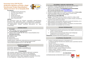 W programie: Przegląd piosenki patriotycznej Nove Kino Niepodległości Pokemon GO Ścieżka historyczna Uroczystości patriotyczne Akcja „Marcelinki 2016” UWAGA! Dla wyłonionych przez jury festiwalu zwycięskich zastępów/patroli Komenda Hufca zaplanowała udział w kilkugodzinnych warsztatach muzycznych, których celem będzie nagranie pieśni Hufca ZHP PŁOCK – „W Nadwiślańskim Grodzie” autorstwa płocczanina hm. Jana Chojnackiego. ZGŁOSZENIA I WARUNKI UCZESTNICTWA do udziału w biwaku mogą zgłaszać się: harcerze, harcerze starsi, wędrownicy w zastępach/patrolach od 5 do 15 osób. zgłoszenia należy dokonać do 6 listopada za pomocą formularza internetowego dostępnego >>>TUTAJ-KLIKNIJ<<< lub na stronie internetowej Hufca: www.plock.zhp.pl dodatkowa składka zadaniowa za udział w biwaku wynosi: 8 zł za osobę dodatkową składkę zadaniową należy wpłacić na konto Hufca: Hufiec ZHP PŁOCK ul. Krótka 3a 09-402 Płock 90 1240 3174 1111 0000 2889 9736 Tytułem: „DSCZ Raduje się serce NAZWA_DRUŻYNY LICZBA_OSÓB” Z opłaty dodatkowej składki zadaniowej za udział w biwaku zwolnieni są drużynowi oraz opiekunowie patroli. Każdy uczestnik musi posiadać odpowiedni ekwipunek biwakowy, za co odpowiedzialny jest drużynowy i opiekun patrolu. Każdy uczestnik musi posiadać kompletne, nienaganne umundurowanie. Każdy uczestnik musi posiadać buty na zmianę. ZADANIA PRZEDBIWAKOWE KOMENDA BIWAKU Komendant: phm. Igor Ciepielak | email: [email protected] Z-ca Komendanta ds. organizacyjnych: pwd. Maciej Tarka | tel.:696-786-593 | email: [email protected] Członkowie komendy: pwd Magdalena Baranowska pwd. Adrianna Łuksa dh. Oliwia Kania dh. Katarzyna Sztubecka Wszelkie pytania i wątpliwości należy kierować do komendanta biwaku lub komendanta hufca hm. Mariusza Fabiszewskiego (email: [email protected], tel.: 502-596-956) RAMOWY PLAN BIWAKU 10 listopada 2016 17:30-18:00: rejestracja drużyn w Gimnazjum nr 5 18:30-22:00: festiwal piosenki (w przerwie kolacja) 22:00: zajęcia wieczorne 11 listopada 2016 6:00: pobudka, toaleta poranna, śniadanie, pakowanie i sprzątanie 8:00: przemarsz do Stanicy Harcerskiej im. Geni Majdeckiej 9:00: uroczystości państwowe z okazji Święta Niepodległości. 12:30: zakończenie biwaku, odbiór uczestników ze Stanicy Harcerskiej im. Geni Majdeckiej - siedziby Hufca PŁOCK ul. Krótka 3a. Przygotowanie piosenki patriotycznej, która będzie wykonywana na scenie w ramach festiwalu. Przygotowanie 30 sekundowego filmiku zapowiadającego zastęp/patrol przed występem na scenie. Wskazówka: piosenkę oraz filmik przygotujcie na zbiórce CO ZAPEWNIA ORGANIZATOR? nocleg w warunkach polowych w Gimnazjum nr 5, ul. Królowej Jadwigi 4 (konieczność zabrania przez uczestników karimat oraz śpiworów), ciekawy i niecodzienny program, nagrody dla zwycięskiego zastępu/patrolu, ubezpieczenie NNW dla każdego uczestnika, dostęp do wrzątku i gorącą herbatę do posiłków, kolację w piątek i śniadanie w sobotę, możliwość spotkania się we wspólnym harcerskim gronie, wiele radości i uśmiechu :-) DO ZOBACZENIA!