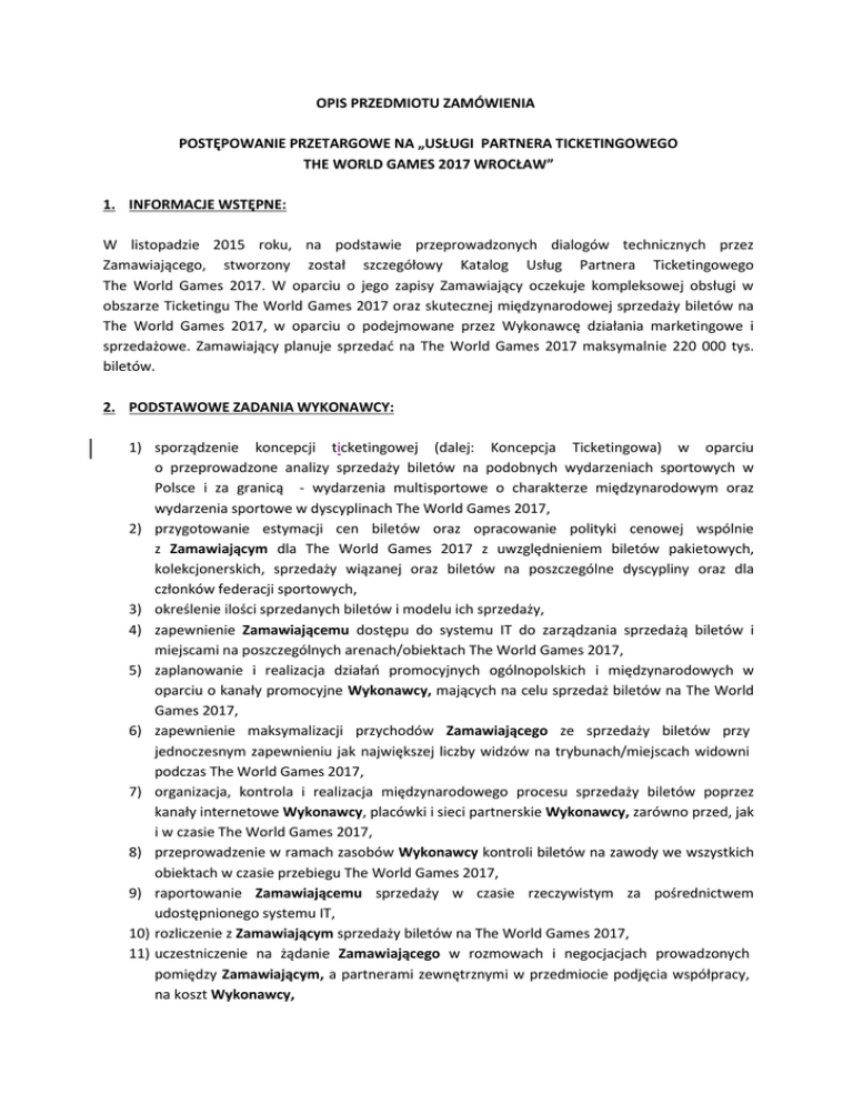 OPIS PRZEDMIOTU ZAMÓWIENIA POSTĘPOWANIE PRZETARGOWE NA „USŁUGI PARTNERA TICKETINGOWEGO THE WORLD GAMES 2017 WROCŁAW” 1. INFORMACJE WSTĘPNE: W listopadzie 2015 roku, na podstawie przeprowadzonych dialogów technicznych przez Zamawiającego, stworzony został szczegółowy Katalog Usług Partnera Ticketingowego The World Games 2017. W oparciu o jego zapisy Zamawiający oczekuje kompleksowej obsługi w obszarze Ticketingu The World Games 2017 oraz skutecznej międzynarodowej sprzedaży biletów na The World Games 2017, w oparciu o podejmowane przez Wykonawcę działania marketingowe i sprzedażowe. Zamawiający planuje sprzedać na The World Games 2017 maksymalnie 220 000 tys. biletów. 2. PODSTAWOWE ZADANIA WYKONAWCY: 1) sporządzenie koncepcji ticketingowej (dalej: Koncepcja Ticketingowa) w oparciu o przeprowadzone analizy sprzedaży biletów na podobnych wydarzeniach sportowych w Polsce i za granicą - wydarzenia multisportowe o charakterze międzynarodowym oraz wydarzenia sportowe w dyscyplinach The World Games 2017, 2) przygotowanie estymacji cen biletów oraz opracowanie polityki cenowej wspólnie z Zamawiającym dla The World Games 2017 z uwzględnieniem biletów pakietowych, kolekcjonerskich, sprzedaży wiązanej oraz biletów na poszczególne dyscypliny oraz dla członków federacji sportowych, 3) określenie ilości sprzedanych biletów i modelu ich sprzedaży, 4) zapewnienie Zamawiającemu dostępu do systemu IT do zarządzania sprzedażą biletów i miejscami na poszczególnych arenach/obiektach The World Games 2017, 5) zaplanowanie i realizacja działań promocyjnych ogólnopolskich i międzynarodowych w oparciu o kanały promocyjne Wykonawcy, mających na celu sprzedaż biletów na The World Games 2017, 6) zapewnienie maksymalizacji przychodów Zamawiającego ze sprzedaży biletów przy jednoczesnym zapewnieniu jak największej liczby widzów na trybunach/miejscach widowni podczas The World Games 2017, 7) organizacja, kontrola i realizacja międzynarodowego procesu sprzedaży biletów poprzez kanały internetowe Wykonawcy, placówki i sieci partnerskie Wykonawcy, zarówno przed, jak i w czasie The World Games 2017, 8) przeprowadzenie w ramach zasobów Wykonawcy kontroli biletów na zawody we wszystkich obiektach w czasie przebiegu The World Games 2017, 9) raportowanie Zamawiającemu sprzedaży w czasie rzeczywistym za pośrednictwem udostępnionego systemu IT, 10) rozliczenie z Zamawiającym sprzedaży biletów na The World Games 2017, 11) uczestniczenie na żądanie Zamawiającego w rozmowach i negocjacjach prowadzonych pomiędzy Zamawiającym, a partnerami zewnętrznymi w przedmiocie podjęcia współpracy, na koszt Wykonawcy, 12) doradzanie na rzecz Zamawiającego w zakresie objętym niniejszym Opisem Przedmiotu Zamówienia, a w szczególności współpracy, podejmowanej pomiędzy Zamawiającym i partnerami promocyjnymi Zamawiającego, 13) przeznaczenie na potrzeby współpracy z Zamawiającym dedykowanego zespołu składającego się z nie mniej niż 2 osób, 14) dokonywanie na rzecz Zamawiającego innych czynności o charakterze doradczo – informacyjnym. 3. ZAKRES ŚWIADCZEŃ WYKONAWCY: 1) opracowanie we współpracy z ZAMAWIAJĄCYM Koncepcji Ticketingowej zawierającej: a) analizę sprzedaży biletów na poprzednich 3 edycjach The World Games na postawie dostępnych danych dostarczonych przez IWGA, Wrocławski Komitet Organizacyjny oraz poprzednich organizatorów The World Games, b) analizę sprzedaży biletów na największe imprezy sportowe w Polsce z ostatnich dwóch lat, c) analizę sprzedaży biletów i ilości widzów na wydarzeniach sportowych w dyscyplinach The World Games 2017 w ciągu ostatnich dwóch lat w Polsce i w krajach ościennych, d) estymację odpowiednich cen biletów na The World Games 2017, e) określenie ostatecznej ilości biletów przeznaczonych do sprzedaży nie większej niż 220 tys. biletów do sprzedaży i nie mniejszej niż 120 tys. biletów, f) politykę sprzedaży biletów na The World Games 2017, g) analizę każdego obiektu pod względem: - ilości miejsc, - aranżacji miejsc/trybun pod sprzedaż biletów, - określenie zasad sprzedaży biletów na wszystkie obiekty (określenie sektorów i ich wartości cenowej), h) propozycję rozwiązań IT, do obsługi procesu sprzedaży i kontroli biletów, dostarczonych przez Wykonawcę spełniające wymagania Wrocławskiego Komitetu Organizacyjnego, i) plan kampanii promocyjnej polskiej i międzynarodowej, która zostanie zrealizowana przez Wykonawcę w celu realizacji procesu sprzedaży biletów na The World Games 2017, j) określenie zasad kontroli biletów na obiektach i niezbędnych zasobów, k) przygotowanie projektów biletów z uwzględnieniem logotypów partnerów Zamawiającego l) Koncepcja Ticketingowa oraz ewentualne jej zmiany muszą zostać zaakceptowane przez Zamawiającego w terminie nie dłuższym niż 10 dni roboczych od jej przedłożenia. Termin wykonania: 90 dni od dnia podpisania umowy. 2) udostępnienie na potrzeby procesu Ticketingowego systemu IT do zarządzania sprzedażą i miejscami na obiektach The World Games 2017 umożlwiającego w szczególności: a) dostęp do systemu IT z poziomu przeglądarki internetowej, b) obsługę w języku polskim i angielskim, c) raportowanie w systemie czasie max. co 30 min. o ilości sprzedanych miejsc na The World Games 2017, d) możliwość wyłączania określonych miejsc i sektorów ze sprzedaży przez Wrocławski Komitet Organizacyjny- na żądanie Zamawiającego, e) możliwość zarządzania sprzedanymi miejscami z podziałem na obiekty, kategorie biletów, strefy na poszczególnych obiektach, f) sprzedaż online biletów poprzez stronę www Wykonawcy i jego partnerów, a także umożliwienie sprzedaży biletów poprzez stronę The World Games 2017 i partnerów The World Games 2017, g) możliwość implementacji modułu sprzedaży biletów lub dedykowanych podstron na podanych przez Zamawiającego i ustalonych z Wykonawc