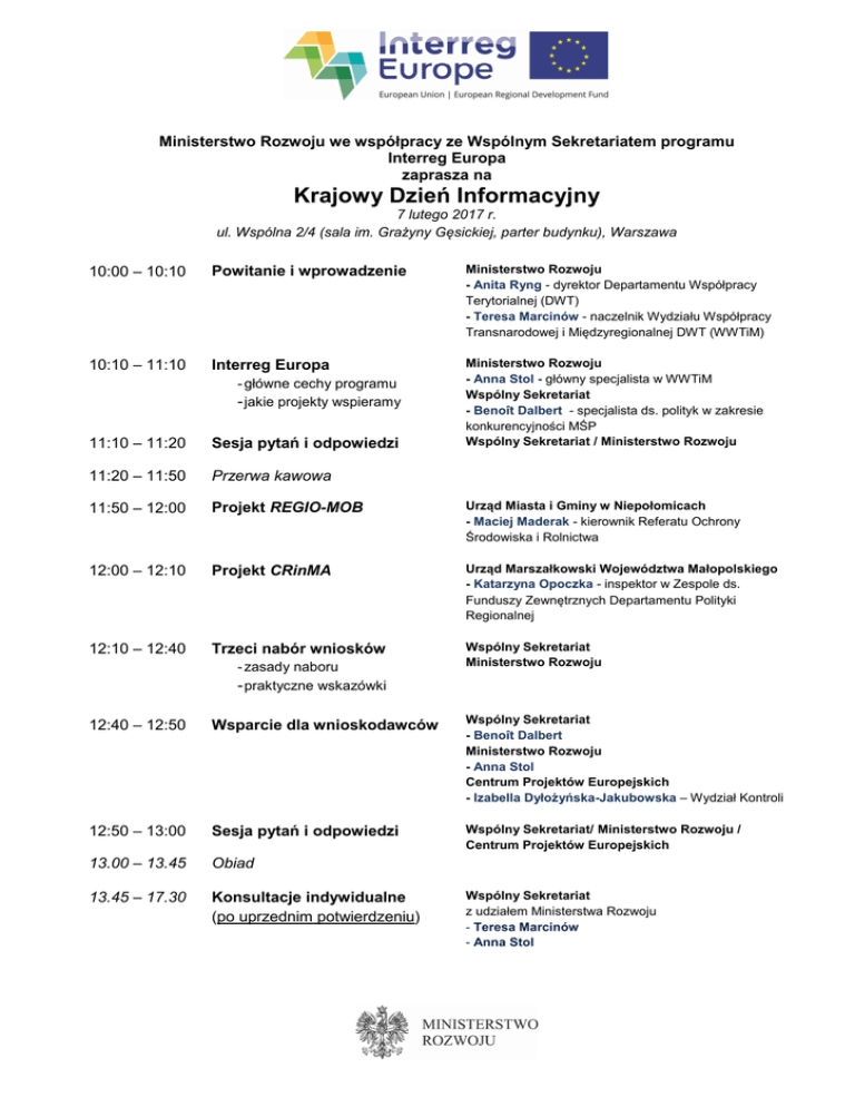 Ministerstwo Rozwoju we współpracy ze Wspólnym Sekretariatem programu Interreg Europa zaprasza na Krajowy Dzień Informacyjny 7 lutego 2017 r. ul. Wspólna 2/4 (sala im. Grażyny Gęsickiej, parter budynku), Warszawa 10:00 – 10:10 Powitanie i wprowadzenie Ministerstwo Rozwoju - Anita Ryng - dyrektor Departamentu Współpracy Terytorialnej (DWT) - Teresa Marcinów - naczelnik Wydziału Współpracy Transnarodowej i Międzyregionalnej DWT (WWTiM) 10:10 – 11:10 Interreg Europa Ministerstwo Rozwoju - Anna Stol - główny specjalista w WWTiM Wspólny Sekretariat - Benoît Dalbert - specjalista ds. polityk w zakresie konkurencyjności MŚP Wspólny Sekretariat / Ministerstwo Rozwoju - główne cechy programu - jakie projekty wspieramy 11:10 – 11:20 Sesja pytań i odpowiedzi 11:20 – 11:50 Przerwa kawowa 11:50 – 12:00 Projekt REGIO-MOB Urząd Miasta i Gminy w Niepołomicach - Maciej Maderak - kierownik Referatu Ochrony Środowiska i Rolnictwa 12:00 – 12:10 Projekt CRinMA Urząd Marszałkowski Województwa Małopolskiego - Katarzyna Opoczka - inspektor w Zespole ds. Funduszy Zewnętrznych Departamentu Polityki Regionalnej 12:10 – 12:40 Trzeci nabór wniosków Wspólny Sekretariat Ministerstwo Rozwoju - zasady naboru - praktyczne wskazówki 12:40 – 12:50 Wsparcie dla wnioskodawców Wspólny Sekretariat - Benoît Dalbert Ministerstwo Rozwoju - Anna Stol Centrum Projektów Europejskich - Izabella Dyłożyńska-Jakubowska – Wydział Kontroli 12:50 – 13:00 Sesja pytań i odpowiedzi Wspólny Sekretariat/ Ministerstwo Rozwoju / Centrum Projektów Europejskich 13.00 – 13.45 Obiad 13.45 – 17.30 Konsultacje indywidualne (po uprzednim potwierdzeniu) Wspólny Sekretariat z udziałem Ministerstwa Rozwoju - Teresa Marcinów - Anna Stol