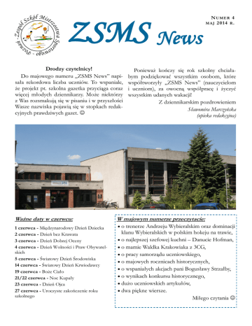 ZSMS News Drodzy czytelnicy! Do majowego numeru „ZSMS News” napisała rekordowa liczba uczniów. To wspaniale, że projekt pt. szkolna gazetka przyciąga coraz więcej młodych dziennikarzy. Może niektórzy z Was rozsmakują się w pisaniu i w przyszłości Wasze nazwiska pojawią się w stopkach redakcyjnych prawdziwych gazet. N U ME R 4 2014 R. MAJ Ponieważ kończy się rok szkolny chciałabym podziękować wszystkim osobom, które współtworzyły „ZSMS News” (nauczycielom i uczniom), za owocną współpracę i życzyć wszystkim udanych wakacji! Z dziennikarskim pozdrowieniem Sławomira Marczyńska (opieka redakcyjna) Ważne daty w czerwcu: W majowym numerze przeczytacie: 1 czerwca - Międzynarodowy Dzień Dziecka 2 czerwca - Dzień bez Krawata 3 czerwca - Dzień Dobrej Oceny 4 czerwca - Dzień Wolności i Praw Obywatelskich 5 czerwca - Światowy Dzień Środowiska 14 czerwca - Światowy Dzień Krwiodawcy 19 czerwca - Boże Ciało 21/22 czerwca - Noc Kupały 23 czerwca - Dzień Ojca 27 czerwca - Uroczyste zakończenie roku szkolnego o trenerze Andrzeju Wybieralskim oraz dominacji klanu Wybieralskich w polskim hokeju na trawie, o najlepszej szefowej kuchni – Danucie Hofman, o mamie Waldka Krakowiaka z 3CG, o pracy samorządu uczniowskiego, o majowych rocznicach historycznych, o wspaniałych akcjach pani Bogusławy Strzałby, o wynikach konkursu historycznego, dużo uczniowskich artykułów, dwa piękne wiersze. Miłego czytania Wywiad z trenerem ZSMS - Andrzejem Wybieralskim Ilu członków rodziny Wybieralskich tworzy lub tworzyło historię polskiego hokeja na trawie? Pierwszym hokeistą był Józef – najstarszy brat. To był początek lat 60-tych. Ja z drugim bratem, Jurkiem, dołączyliśmy do grona hokeistów w 1967 roku. Zaczęliśmy wszyscy w KS Warta Poznań, klub i boisko znajdowało się blisko naszego domu rodzinnego (obecnie jest tam Multikino). Pierwsze sukcesy Józefa zachęciły nas do poważnego zajęcia się sportem. Widząc nasze zaangażowanie, ojciec nasz - Jan Wybieralski zgłosił chęć działania na rzecz drużyny i klubu. Został kierownikiem grup młodzieżowych, później sekretarzem sekcji, a także w Okręgowym Związku Hokeja na Trawie odpowiadał za organizację imprez. Każdy z braci miał swoją ścieżkę kariery sportowej, ale był taki czas od 1976 do 1980 roku, że we trzech graliśmy w reprezentacji Polski. W tym czasie braliśmy udział w bardzo ważnych dla polskiego hokeja imprezach: 1977 w Inter Cup we Włoszech, 1978 w mistrzostwa Świata w Argentynie i 1978 w mistrzostwach Europy w Niemczech. Hokej przeszedł na kolejne pokolenie. Józef ma trzech synów i każdy miał kontakt z hokejem, Filip krótko, ale Krzysztof i Łukasz grają do tej pory. Jurek ma dwie córki: Agatę i Urszulę i obie grają w hokeja, a także moja córka Katarzyna grała w hokeja. Ilu Wybieralskich było na IO? Józef w Monachium w 1972 r., Jurek w Moskwie w 1980 r., w Sydney 2000 r. roku Jurek jako trener i Krzysztof i Łukasz jako zawodnicy. Str. 2 Czy ktoś z rodziny uczęszczał do ZSMS (lub do szkoły-matki, jaką dla ZSMS była SP1)? Brat Józef i siostra Krystyna uczęszczali do Szkoły Podstawowej nr 1. Później, jak SP1 przekształciła się w SMS, to naukę pobierały córki Jurka Agata i Ula, a ostatnio, w ZSMS uczyła się moja córka Kasia. Kiedy zacząłeś pracę w ZSMS? Pierwszy nabór do SMS hokeistów był w roku szkolnym 2002/2003. Polski Związek zaproponował mi objęcie funkcji trenera . Na stronie internetowej klubu wyczytałam, że 60 uczniów naszej szkoły brało udział w mistrzostwach Europy, 2 w mistrzostwach świata, a nawet jeden uczeń wywalczył kwalifikacje olimpijskie. To ogromny sukces! Co dalej dzieje się z naszymi absolwentami? Do tej pory ponad 130 uczniów ukończyło ZSMS i większość z nich grała w różnych reprezentacjach: juniorów, młodzieżowej, a nawet seniorów. Mamy aktualnie 20 absolwentów naszej szkoły w reprezentacji seniorek i seniorów. Jaki największy sukces naszej drużyny? Największy sukces sportowy ostatnich lat to awans drużyny szkolnej ZSMS do ekstraklasy. Radość z awansu uwieczniona została na zdjęciu. Gratuluję sukcesu i dziękuję za rozmowę! SM Uwaga! Ogłoszenie SU!!! Zapraszamy do udziału w nowym projekcie pt. „Najsympatyczniejszy sportowiec ZSMS roku szkolnego 2013/14”. Każda klasa ma za zadanie wytypować najfajniejszego ucznia (lub uczniów). Wybrańcy przesyłają swoje zdjęcie i krótki opis osiągnięć sportowych na maila: [email protected] do 15 maja. Później na szkolnej stronie internetowej odbędzie się głosowanie i zostanie wybranych trzech najsympatyczniejszych uczniów ZSMS. A co ostatnio się działo? KUBASY . Informacje na ten temat można znaleźć na szkolnej stronie internetowej. Przypominam również o bateriowym konkursie. Pamiętajcie, można wygrać bilety do kina! A na razie baterie otrzymaliśmy tylko od jednej osoby. No i pragnę wyrazić wielką radość z powodu zbliżającego się końca roku szkolnego (hurrraaa!!!!!!) i życzyć wszystkim uczniom ZSMS wspaniałych wakacji! Marta Górna Mateusz Ciepły - radny Młodzieżowej Rady Miasta Poznania informuje, że 27. czerwca br. odbędzie się koncert w starym korycie Warty na zakończenie roku szkolnego. Koncert organizuje właśnie Młodzieżowa Rada Miasta. Wejście na koncert jest darmowe i są zaproszeni wszyscy! K(R)wiecień Już kolejny rok kwiecień w ZSMS był miesiącem poświęconym krwiodawstwu oraz dawstwu szpiku. Uczniowie przez trzy dni, tj. od 14 do 16 kwietnia, promowali pomoc drugiemu człowiekowi. Pierwszego dnia grupa młodzieży z klasy 2S2 oraz 2S3 wyruszyła między innymi na Politechnikę Poznańską, w celu propagowania ratowania życia innym. Tam rozdawali ulotki na temat oddawania krwi oraz rejestracji w banku szpiku. We wtorek następnego dnia odwiedziła nas pani Maria Homan z Drużyny Szpiku. Przedstawiła podróż od rejestracji w banku szpiku aż do przes
