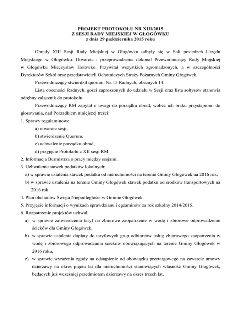 PROJEKT PROTOKOŁU NR XIII/2015 Z SESJI RADY MIEJSKIEJ W GŁOGÓWKU z dnia 29 października 2015 roku Obrady XIII Sesji Rady Miejskiej w Głogówku odbyły się w Sali posiedzeń Urzędu Miejskiego w Głogówku. Otwarcia i przeprowadzenia dokonał Przewodniczący Rady Miejskiej w Głogówku Mieczysław Hołówko. Przywitał wszystkich zgromadzonych, a w szczególności Dyrektorów Szkół oraz przedstawicieli Ochotniczych Straży Pożarnych Gminy Głogówek. Przewodniczący stwierdził quorum. Na 15 Radnych, obecnych 14. Lista obecności Radnych, gości zaproszonych do udziału w Sesji oraz lista sołtysów stanowią odrębny załącznik do protokołu. Przewodniczący RM zapytał o uwagi do porządku obrad, wobec ich braku przystąpiono do głosowania, nad Porządkiem niniejszej treści: 1. Sprawy regulaminowe: a) otwarcie sesji, b) stwierdzenie Quorum, c) uchwalenie porządku obrad, d) przyjęcie Protokołu z XII sesji RM. 2. Informacja Burmistrza o pracy między sesjami. 3. Uchwalenie stawek podatków lokalnych: a) w sprawie ustalenia stawek podatku od nieruchomości na terenie Gminy Głogówek na 2016 rok, b) w sprawie ustalenia na terenie Gminy Głogówek stawek podatku od środków transportowych na 2016 rok. 4. Plan obchodów Święta Niepodległości w Gminie Głogówek. 5. Przyjęcie informacji o wynikach sprawdzianu i egzaminów za rok szkolny 2014/2015. 6. Rozpatrzenie projektów uchwał: a) w sprawie zatwierdzenia taryf na zbiorowe zaopatrzenie w wodę i zbiorowe odprowadzenie ścieków dla Gminy Głogówek, b) w sprawie ustalenia dopłaty do taryfowych grup odbiorców usług zbiorowego zaopatrzenia w wodę i zbiorowego odprowadzania ścieków obowiązujących na terenie Gminy Głogówek w 2016 roku, c) w sprawie wyrażenia zgody na odstąpienie od obowiązku przetargowego na zawarcie umowy dzierżawy na okres pięciu lat dla nieruchomości stanowiących własność Gminy Głogówek, będących już wcześniej przedmiotem dzierżawy na okres trzech lat, d) w sprawie ustalenia wysokości dziennych stawek opłaty targowej, zasad poboru i terminu jej płatności, zarządzenia poboru opłaty targowej w drodze inkasa, określenia inkasentów i wysokości ich wynagrodzenia za inkaso oraz zwolnień z opłaty targowej na terenie Gminy Głogówek, e) w sprawie Regulaminu utrzymania czystości i porządku na terenie Gminy Głogówek, f) w sprawie szczegółowego sposobu i zakresu świadczenia usług na terenie Gminy Głogówek w zakresie odbierania odpadów komunalnych od właścicieli nieruchomości i zagospodarowania tych odpadów w zamian za uiszczoną przez właściciela nieruchomości opłatę za gospodarowanie odpadami komunalnymi. 7. Zapytania Radnych. 8. Odpowiedzi na zapytania i interpelacje. 9. Wolne wnioski i informacje. 10. Zakończenie XIII Sesji Rady Miejskiej w Głogówku. Porządek obrad przyjęto jednogłośnie. Kolejno Przewodniczący RM zapytał o uwagi do projektu protokołu z XII Sesji RM w Głogówku. Wobec ich braku przystąpiono do głosowania nad w/w protokołem, który przyjęto jednogłośnie. Ad 2. Burmistrz Głogówka Andrzej Kałamarz odczytał informacje o swojej pracy w okresie międzysesyjnym. Następnie Przewodniczący RM poprosił o przedstawienie przez Burmistrza informacji nt. działalności Ochotniczych Straży Pożarnych na terenie Gminy Głogówek. W związku z kończącą się kadencją Zarządu Gminnego OSP i zbliżającymi się wyborami Burmistrz na ręce obecnych przedstawicieli OSP złożył serdeczne podziękowania za pełnioną służbę. Podkreślił, że od momentu objęcia funkcji Prezesa Gminnego ZOSP, dokładał wszelkich starań celem poprawy działalności OSP. Przypomniał powódź, która dotknęła Gminę Głogówek w 2007 r., ukazującą kiepski i niedofinansowany stan techniczny całej infrastruktury OSP, ale również wielkie poświęcenie i zaangażowanie strażaków ochotników. Wówczas, wspólnie z Radą została podjęta decyzja o konieczności pilnego doposażenia straży. Podkreślił, że w chwili obecnej jednostki z Gminy Głogówek są wzorem dla Powiatu Prudnickiego. Czego efektem między innymi jest zdobywanie czołowych miejsc w powiatowych zawodach sportowo – pożarniczych. W tym miejscu Burmistrz złożył gratulacje jednostce, która w w/w zawodach, w roku bieżącym zajęła pierwsze miejsce tj. jednostce OSP Wróblin. Uznał, że wyposażenie niektórych jednostek, niejednokrotnie jest lepsze niż w straży zawodowej. Jest to podyktowane min. tym, że na terenie naszej Gminy nie znajduje się PSP, zatem wszystko opiera się na ochotnikach. Tak więc niezbędne będą kolejne inwestycje. Następnie Burmistrz poinformował, ile w roku bieżącym zostało przeznaczone pieniędzy na wynagrodzenie strażaków w ramach ekwiwalentów – 29 300 zł. Przy czym, z woli członków OSP pieniądze te nie trafiają do kieszeni strażaków, tylko wydawane są na działalność jednostek. Zwracając się do obecnych strażaków Burmistrz podziękował, że służbę na rzecz Gminy Głogówek. Podał, że niejednokrotnie miał okazję brać udział w różnych akcjach i naocznie być świadkiem zaangażowania i ofiarności strażaków. Następnie Burmistrz przytoczył, co następuje: Na działalność OSP w roku 2015 zaplanowano środki finansowe w wysokości 536 824,00 zł. Na chwilę obecną wykonanie kształtuje się na poziomie ok. 430 tys. zł. W/w suma jest wynikiem m. in. następujących zobowiązań. Lp. Nazwa Kwota 1 Ekwiwalenty za akcje ratownictwa poż. 29 300,00,- 2. Energia elektryczna i woda 47 685,84,- 3. Zakup materiałów i wyposażenia, w tym paliwa 87 681,02,- 4. Ubezpieczenia poj./OC,NW/ oraz strażaków 20 455,00,- 5. Badania lekarskie okresowe i psychologiczne 8 156,50,- 6. Zakup usług pozostałych (przeglądy sam. strażackich, rejestracja pojazdów, szkolenia oraz inne usługi świadczone na rzecz obrony p.poż.) 58 773,41,- Ponadto w roku sprawozdawczym przeprowadzono następujące inwestycje: Lp. 