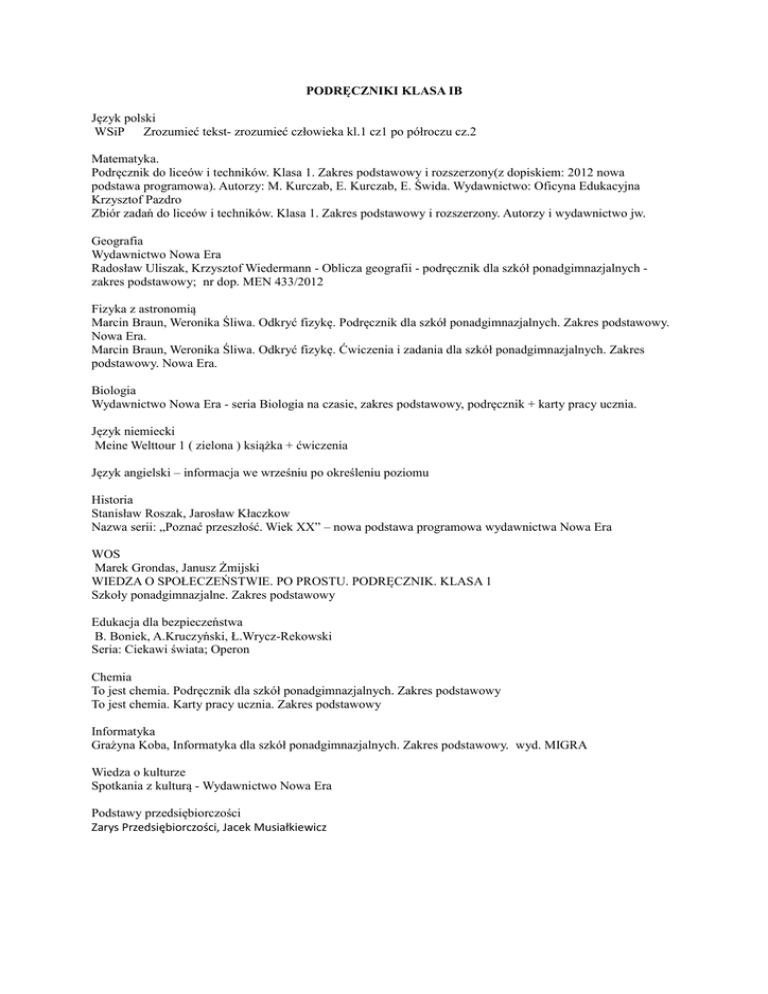 PODRĘCZNIKI KLASA IB Język polski WSiP Zrozumieć tekst- zrozumieć człowieka kl.1 cz1 po półroczu cz.2 Matematyka. Podręcznik do liceów i techników. Klasa 1. Zakres podstawowy i rozszerzony(z dopiskiem: 2012 nowa podstawa programowa). Autorzy: M. Kurczab, E. Kurczab, E. Świda. Wydawnictwo: Oficyna Edukacyjna Krzysztof Pazdro Zbiór zadań do liceów i techników. Klasa 1. Zakres podstawowy i rozszerzony. Autorzy i wydawnictwo jw. Geografia Wydawnictwo Nowa Era Radosław Uliszak, Krzysztof Wiedermann - Oblicza geografii - podręcznik dla szkół ponadgimnazjalnych zakres podstawowy; nr dop. MEN 433/2012 Fizyka z astronomią Marcin Braun, Weronika Śliwa. Odkryć fizykę. Podręcznik dla szkół ponadgimnazjalnych. Zakres podstawowy. Nowa Era. Marcin Braun, Weronika Śliwa. Odkryć fizykę. Ćwiczenia i zadania dla szkół ponadgimnazjalnych. Zakres podstawowy. Nowa Era. Biologia Wydawnictwo Nowa Era - seria Biologia na czasie, zakres podstawowy, podręcznik + karty pracy ucznia. Język niemiecki Meine Welttour 1 ( zielona ) książka + ćwiczenia Język angielski – informacja we wrześniu po określeniu poziomu Historia Stanisław Roszak, Jarosław Kłaczkow Nazwa serii: „Poznać przeszłość. Wiek XX” – nowa podstawa programowa wydawnictwa Nowa Era WOS Marek Grondas, Janusz Żmijski WIEDZA O SPOŁECZEŃSTWIE. PO PROSTU. PODRĘCZNIK. KLASA 1 Szkoły ponadgimnazjalne. Zakres podstawowy Edukacja dla bezpieczeństwa B. Boniek, A.Kruczyński, Ł.Wrycz-Rekowski Seria: Ciekawi świata; Operon Chemia To jest chemia. Podręcznik dla szkół ponadgimnazjalnych. Zakres podstawowy To jest chemia. Karty pracy ucznia. Zakres podstawowy Informatyka Grażyna Koba, Informatyka dla szkół ponadgimnazjalnych. Zakres podstawowy. wyd. MIGRA Wiedza o kulturze Spotkania z kulturą - Wydawnictwo Nowa Era Podstawy przedsiębiorczości Zarys Przedsiębiorczości, Jacek Musiałkiewicz
