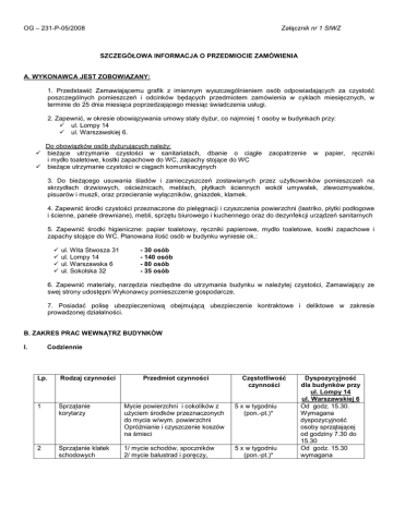 OG – 231-P-05/2008 Załącznik nr 1 SIWZ SZCZEGÓŁOWA INFORMACJA O PRZEDMIOCIE ZAMÓWIENIA A. WYKONAWCA JEST ZOBOWIĄZANY: 1. Przedstawić Zamawiającemu grafik z imiennym wyszczególnieniem osób odpowiadających za czystość poszczególnych pomieszczeń i odcinków będących przedmiotem zamówienia w cyklach miesięcznych, w terminie do 25 dnia miesiąca poprzedzającego miesiąc świadczenia usługi. 2. Zapewnić, w okresie obowiązywania umowy stały dyŜur, co najmniej 1 osoby w budynkach przy: ul. Lompy 14 ul. Warszawskiej 6. Do obowiązków osób dyŜurujących naleŜy: bieŜące utrzymanie czystości w sanitariatach, dbanie o ciągłe i mydło toaletowe, kostki zapachowe do WC, zapachy stojące do WC bieŜące utrzymanie czystości w ciągach komunikacyjnych zaopatrzenie w papier, ręczniki 3. Do bieŜącego usuwania śladów i zanieczyszczeń zostawianych przez uŜytkowników pomieszczeń na skrzydłach drzwiowych, ościeŜnicach, meblach, płytkach ściennych wokół umywalek, zlewozmywaków, pisuarów i muszli, oraz przecieranie wyłączników, gniazdek, klamek. 4. Zapewnić środki czystości przeznaczone do pielęgnacji i czyszczenia powierzchni (lastriko, płytki podłogowe i ścienne, panele drewniane), mebli, sprzętu biurowego i kuchennego oraz do dezynfekcji urządzeń sanitarnych 5. Zapewnić środki higieniczne: papier toaletowy, ręczniki papierowe, mydło toaletowe, kostki zapachowe i zapachy stojące do WC. Planowana ilość osób w budynku wyniesie ok.: ul. Wita Stwosza 31 ul. Lompy 14 ul. Warszawska 6 ul. Sokolska 32 - 30 osób - 140 osób - 80 osób - 35 osób 6. Zapewnić materiały, narzędzia niezbędne do utrzymania budynku w naleŜytej czystości, Zamawiający ze swej strony udostępni Wykonawcy pomieszczenie gospodarcze. 7. Posiadać polisę ubezpieczeniową obejmującą ubezpieczenie kontraktowe i deliktowe w zakresie prowadzonej działalności. B. ZAKRES PRAC WEWNĄTRZ BUDYNKÓW I. Codziennie Lp. Rodzaj czynności Przedmiot czynności Częstotliwość czynności 1 Sprzątanie korytarzy Mycie powierzchni i cokolików z uŜyciem środków przeznaczonych do mycia w/wym. powierzchni OpróŜnianie i czyszczenie koszów na śmieci 5 x w tygodniu (pon.-pt.)* 2 Sprzątanie klatek schodowych 1/ mycie schodów, spoczników 2/ mycie balustrad i poręczy, 5 x w tygodniu (pon.-pt.)* Dyspozycyjność dla budynków przy ul. Lompy 14 ul. Warszawskiej 6 Od godz. 15.30. Wymagana dyspozycyjność osoby sprzątającej od godziny 7.30 do 15.30 Od godz. 15.30 wymagana dezynfekcja poręczy 3/ ścieranie wewnętrznych parapetów okiennych 3 Sprzątanie toalet 4 Sprzątanie pomieszczeń biurowych 5 Sprzątanie pomieszczeń technicznych 6 Sprzątanie pomieszczeń magazynowych i archiwów Mycie okien 7 8 Dodatkowo: Dotyczy wszelkich pomieszczeń 1/ mycie muszli wc, desek sedesowych 2/mycie pisuarów j/w 3/mycie umywalek , blatów, armatury, luster 4/uzupełnianie: mydła, papieru toaletowego, ręczników papierowych 5/mycie podłóg, cokolików, bieŜące usuwanie brudu ze ścian pokrytych płytkami, opróŜnianie koszy na odpadki, ścieranie parapetów okiennych 6/mycie drzwi kabin wc 7/mycie drzwi wejściowych do pomieszczeń sanitariatów 8/mycie ścian /powierzchnie z płytek ceramicznych 1/ mycie podłóg i listew przyściennych z uŜyciem środka przeznaczonego do czyszczenia w/w powierzchni 2/ czyszczenie biurek, stolików, szaf, regałów, ław, luster 3/ opróŜnianie koszy na odpadki, pojemników niszczarek, 4/odkurzanie sprzętu biurowego i komputerowego z uŜyciem przeznaczonych do tego celu środków 5/ścieranie parapetów okiennych 6/ mycie drzwi 7/ mycie szaf biurowych Sprzątanie w obecności pracownika odpowiedzialnego za wyposaŜenie danego pomieszczenia Sprzątanie w obecności pracownika odpowiedzialnego za wyposaŜenie danego pomieszczenia 1/ stolarka okienna, parapety zewnętrzne, balustrady zewnętrzne 1/ dezynfekcja urządzeń sanitarnych 2/ odkurzanie wykładzin dywanowych 3/przecieranie krzeseł i foteli 4/nabłyszczanie powierzchni podłogowych 5/ przecieranie kaloryferów 6/ mycie lamperii 7/ mycie lamp sufitowych 8/ pranie wykładzin dywanowych 9/ pranie tapicerki krzeseł i foteli 10/ mycie ścian marmurowych w klatkach schodowych 11/ pranie firan, odkurzanie Ŝaluzji okiennych -Pozycje od 1-5 5 x w tygodniu ( pon.-pt.)* Pozycja 6, 7, 8 - 1 x w tygodniu 5 x w tygodniu (pon.-pt.)* 1 x w tygodniu w od 8.00-15.00 2 x w tygodniu od 8.00-15.00 1 x na kwartał 1/ 1 x w tygodniu 2/ codziennie (pon.-pt.)* 3/ codziennie (pon.-pt.)* 4/ 1 x w tygodniu 5/ 1 x w tygodniu 6/ 1 x w tygodniu 7/ 1 x w miesiącu 8/ 1 x na kwartał 9/ 1 x na kwartał 10/ 1 x na kwartał 11/ 1 raz na pół roku dyspozycyjność osoby sprzątającej od godziny 7.30 do 15.30 Od godz. 15.30 wymagana dyspozycyjność osoby sprzątającej od godziny 7.30 do 15.30 * określenie terminu od poniedziałku do piątku obejmuje równieŜ soboty, które będą dniami normalnego urzędowania Sądu wyznaczonymi przez Prezesa Sądu Rejonowego Katowice – Wschód w Katowicach, jako dni do odpracowywania w zamian za dzień wolny w tygodniu. C. TERENY ZEWNĘTRZNE : I. Codziennie : 1. Zamiatanie (odśnieŜanie) parkingów wewnętrznych oraz przylegających do budynku Sądu chodników zewnętrznych ulicy Sokolskiej 32. II. Wykonawca zobowiązany jest do utrzymywania chodników zewnętrznych oraz parkingów wewnętrznych w stanie zapewniającym bezpieczne poruszanie się przechodniów lub pojazdów poprzez ich regularne odśnieŜanie i posypywanie piaskiem lub solą. „Akcja zima” będzie przeprowadzana w zaleŜności od występujących potrzeb. III. Wykonawca jeŜeli zachodzi taka potrzeba jest zobowiązany na własny koszt do uŜycia ciągników, odśnieŜarek i innego sprzętu mechanicznego niezbędnego do usunięcia zalegającego śniegu na parkingach wewnętrznych oraz chodnikach w ramach umowy (bez ponoszenia dodatkowych kosztów ze strony Zamawiającego ) - tzw. „akcja zima”. D. ORGAZNIZA