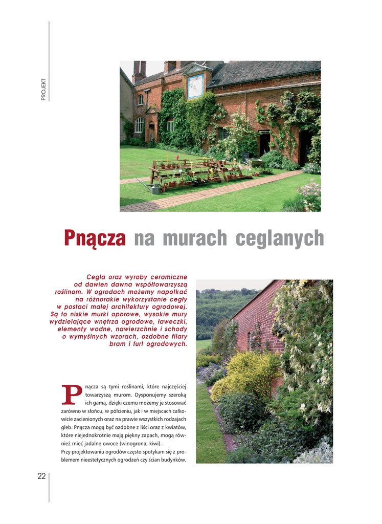 PROJEKT Pnącza na murach ceglanych Cegła oraz wyroby ceramiczne od dawien dawna współtowarzyszą roślinom. W ogrodach możemy napotkać na różnorakie wykorzystanie cegły w postaci małej architektury ogrodowej. Są to niskie murki oporowe, wysokie mury wydzielające wnętrza ogrodowe, ławeczki, elementy wodne, nawierzchnie i schody o wymyślnych wzorach, ozdobne filary bram i furt ogrodowych. P nącza są tymi roślinami, które najczęściej towarzyszą murom. Dysponujemy szeroką ich gamą, dzięki czemu możemy je stosować zarówno w słońcu, w półcieniu, jak i w miejscach całkowicie zacienionych oraz na prawie wszystkich rodzajach gleb. Pnącza mogą być ozdobne z liści oraz z kwiatów, które niejednokrotnie mają piękny zapach, mogą również mieć jadalne owoce (winogrona, kiwi). Przy projektowaniu ogrodów często spotykam się z problemem nieestetycznych ogrodzeń czy ścian budynków. 22 Równie często powtarzającym się tematem są niecieka- Pnącza muszą się piąć z tych problemów mogą rozwiązać właśnie pnącza Chcąc wprowadzić do projektu pnącza to oprócz odpo- – jeśli chodzi o szybkie, tanie i w miarę trwałe zasło- wiedniego doboru stanowiska oraz gleby trzeba zasta- nięcie mało ciekawych elementów, to rośliny te zro- nowić się nad czynnikiem, bez którego rośliny pnące bią to doskonale. rosnąć nie będą. Jak sama nazwa wskazuje pnącze musi PROJEKT we widoki lub kwestia prywatności w ogrodzie. Każdy się po czymś piąć! Do prawidłowego rozwoju roślin potrzebne są, więc podpory. Dobieramy je na podstawie sposobu wspinania się pnączy. 23 PROJEKT Pnącza prymitywne Nie posiadają one prawdziwych organów czepnych, lecz kolce. Aby się wznosić, wpełzają po innych roślinach lub po podporach, pomagając sobie w tym kolcami. Do tej grupy roślin należą na przykład róże pnące i jeżyny. Będą one wymagać podpór, do których będzie można przywiązywać roślinę, np. pergoli, haków, linek. Pnącza owijające się Mogą owijać się w prawą stronę i nazywamy je prawo- Do tej grupy należą rośliny, które wspinając się owija- skrętnymi, mogą też owijać się w lewą stronę i te nazy- ją się wokół podpór. wamy lewoskrętnymi. Pnącza te będą się dobrze czuły owijając się na pergolach, trejażach oraz innych podporach, które mogą być również zamontowane w pewnej odległości od muru, najlepiej ok. 7 cm. Pnącza prawoskrętne: Actinidia arguta – aktinidia ostrolistna (kiwi), Actinidia kolomikta – aktinidia pstrolistna, Akebia quinata – akebia pięciolistna, Wisteria sinensis – glicynia chińska. Pnącza lewoskrętne: Wisteria floribunda – glicynia kwiecista, Lonicera – wiciokrzew, Schisandra chinensis – cytryniec chiński. Pnącza wąsoczepne Do tej grupy należą rośliny, które przy wspinaniu się pomagają sobie przekształconymi pędami – wąsami czepnymi lub ogonkami liściowymi i szypułkami kwiatowymi. Te pnącza potrzebują podpory, która jest wykonana z materiałów o małej średnicy ułatwiającej drobnym wąsom i ogonkom liściowym przytrzymywanie się. Dla roślin tych najlepszą podporą będą pergole i treja- 24 że wykonane z prętów metalowych lub drewna o ma- Pnącza wąsoczepne: Parthenocissus quinquefolia – winobluszcz pięcio- PROJEKT łej średnicy, siatka ogrodzeniowa, itp. listkowy, Vitis riparia – winorośl pachnąca, Vitis coignetiae – winorośl japońska. Pnącza ogonko– i szypułkoczepne: Clematis – powojnik. Pnącza samoczepne Wspinają się ku górze przytrzymując się podpory za pomocą przylg lub korzonków przybyszowych, wyrastających wzdłuż pędów. Tego rodzaju pnącza do wspinania się wymagają chropowatych powierzchni, do czego doskonale nadają się powierzchnie z cegły. Niechętnie będą wspinać się na siatkę ogrodzeniową czy na pergolę z dużymi prześwitami. Możemy prowadzić pnącza korzonkoczepne na kratkach drewnianych, lecz wymaga to sporo pracy i czasu. Pnącza przytrzymujące się za pomocą przylg: Parthenocissus tricuspidata – winobluszcz trójkla- powy. Pnącza korzonkoczepne: Campsis radicans – milin amerykański, Campsis grandiflora – milin wielkokwiatowy, Euonymus fortunei – trzmielina pnąca, Hedera helix – bluszcz pospolity, Hydrangea petriolaris – hortensja pnąca. Rośliny pnące są doskonałym dopełnieniem dla murów i innych konstrukcji ceglanych, ozdabiają je, łagodzą ich formę i kształt, nadają im niepowtarzalny charakter. Agnieszka Hubeny-Żukowska 25