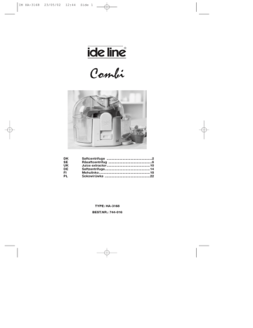 IM HA-3168 23/05/02 12:44 Side 1 ® Combi DK SE UK DE FI PL Saftcentrifuge ................................................2 Råsaftcentrifug ..............................................6 Juice extractor..............................................10 Saftzentrifuge................................................14 Mehulinko......................................................18 SokowirÛwka ................................................22 TYPE: HA-3168 BEST.NR.: 744-016 IM HA-3168 23/05/02 12:44 Side 2 DK INTRODUKTION For at De kan få mest glæde af Deres nye saftcentrifuge, beder vi Dem venligst gennemlæse denne brugsanvisning, før De tager apparatet i brug. Vi anbefaler Dem yderligere at gemme brugsanvisningen, hvis De på et senere tidspunkt skulle få brug for at opfriske saftcentrifugens funktioner. FUNKTIONSOVERSIGT 1. 2. 3. 4. 5. 6. 7. 8. 9. 10. 11. 12. 13. Nedstopper Påfyldningshul Beskyttelses låg Rivejern og filterkurv Pulp seperator Juice udløbstud Udløbstud for pulp Motor del Beholder for pulp og frugt stykker Hængsler Tænd/sluk knap Saftbeholder Støtteplade VIGTIGE SIKKERHEDSFORANSTALTNINGER - - - Pres aldrig frugten/grøntsagerne hårdt ned i apparatet med nedstopperen. Dette ødelægger rivejernet og selve motoren. Læs hele brugsanvisningen. For at undgå elektrisk stød - kontroller at ledningen og stikket er tørre. Undlad at rykke i ledningen, når stikket tages ud af stikkontakten. Såfremt saftcentrifugen eller ledningen skulle blive beskadiget, undlad da at benytte den. Der skal anvendes specialværktøj, så De skal indlevere saftcentrifugen til en fagmand for reparation. Gå aldrig fra saftcentrifugen, mens den er i brug. Tag altid stikket ud af stikkontakten når apparatet ikke er i brug, når De påsætter eller aftager løsdele, og før De rengøre apparatet. Undlad at røre ved de roterende dele og husk altid at sætte beholderne på plads før brug. Låget skal være lukket helt tæt til med hængslerne. Hængslerne må ikke løsnes under brugen. Læg aldrig frugten/grøntsagerne i apparatet med fingrene - brug altid nedstopperen. Hvis frugten/grøntsagerne sætter sig fast i åbningen, brug da nedstopperen til at løsne det. Hvis det skulle være umuligt at fjerne frugten/grøntsagerne på denne måde, skal De slukke for strømmen, tage låget af og tage filtret og rivejernet ud for at kunne fjerne frugten/grøntsagerne. Husk at vente indtil motoren står helt stille. Brug ikke saftcentrifugen udendørs. Sørg for at ledningen ikke kommer i klemme bag borde, skabe m.m., og at den ikke kommer i nærheden af varme kilder såsom komfur, kogeplader eller gasblus. Motorenheden må ikke nedsænkes i nogen former for væske. Der må ikke bruges andet tilbehør end det som fulgte med ved købet af saftcentrifugen, da brugen af andet tilbehør kan forårsage brand, elektrisk stød eller skade. Desuden vil garantien bortfalde. Vær altid opmærksom, hvis maskinen bruges i nærheden/eller af børn. Tænderne på rivejernet er meget skarpe - vær derfor meget forsigtig under rengøring af rivejernet. 2 IM HA-3168 23/05/02 12:44 Side 3 FØR BRUG Sørg for at voltstyrken stemmer overens mellem apparat og stikkontakt. Vask de dele af apparatet der vil komme i kontakt med de grønsager og frugter der skal centrifugeres. Prøv at samle og skille apparatet et par gange ind den bruges med frugt og grønsager. MONTERING AF SAFTCENTRIFUGEN - Sæt tænd/sluk knappen på Off og åben for hængslerne (10). Fjern beskyttelseslåget (3). Fjern pulp separatoren (5) tag derefter rivejern og filterkurv (4) op. Placér pulp separatoren (5) over motordelen (8). Pres ned med begge hænder på pulp separatoren. Indsæt rivejern og filter, drej det i urets retning indtil det sidder sikkert fast. Monter sikkerhedslåget (3) og fastgør hængslerne (10) Placér pulpbeholderen (9) under pulp tuden (7), placer herefter juice beholderen (12) under juice tuden (6). Hvis man vælger ikke at bruge juice beholderen skal støttepladen (13) placeres på centrifugen således glas og kopper kan stå på pladen. AFMONTERING AF SAFTCENTRIFUGEN - Sluk på tænd/sluk Tag stikket ud af stikkontakten Løsn hængslerne fra tapperne på siden af apparatet. Løft rivejernet / filterkurven af, vask delene i varmt vand med sæbe i, skyl sæben af og tør derefter delene. Vær opmærksom på at tænderne på rivejernet er meget skarpe. Tag pulp/frugtstykke beholderen af, og rengør den under rindende vand. BRUG - - - Brug ikke saftcentrifugen i mere end 4 minutter uafbrudt af gangen. Skub tænd/sluk knappen om på Off, og lad apparatet køle af i ca. 2 minutter. Hvis produktet kører mere end 4 minutter og ikke får de 2 minutters køletid - vil overbelastning sikringen træde i funktion. Produktet skal da indleveres til fagmand for reparation. En fejl af denne art dækkes ikke af garantien. Middelhårde grøntsager såsom gulerødder og rødbeder skal lægges i blød i vand før de lægges i maskinen - maskinen vil ellers tage skade. Før De sætter strøm til saftcentrifugen, skal De sikre Dem, at tænd/sluk knappen står i Off position, og at låget er sat forsvarligt på. Rengør frugterne og grønsagerne grundigt og skær dem i mindre stykker, så de kan komme igennem påfyldnings hullet. Anvend ikke kokosnødder eller lignende hårde frugter og grønsager, da disse kan ødelægge motoren og filtret. Skræl og sten skal fjernes fra appelsiner, citroner, grapefrugter og meloner ligesom kernehuset fra æbler og pærer- osv. bør fjernes. Det vil forbedre smagen betydeligt. Bladgrønsager bør formes til kugler eller ruller og derefter lægges i centrifugen. Forbered frugterne og læg dem forsigtigt i centrifugen ved hjælp af nedstopperen. Det er helt normalt, at der samler sig pulp i låget, mens De laver saft. Når enten pulp- eller saftbeholderen er fyldt, slukkes på tænd/sluk knappen og denne/disse tømmes, før De fortsætter. Det kan ske, at området mellem filterringen og pulp beholderen 