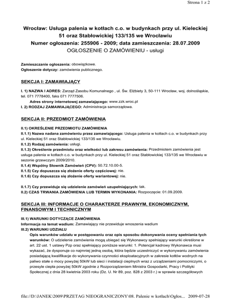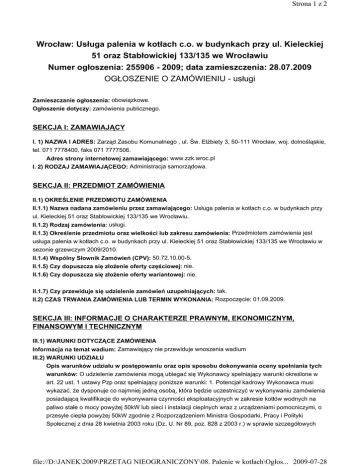 Strona 1 z 2 Wrocław: Usługa palenia w kotłach c.o. w budynkach przy ul. Kieleckiej 51 oraz Stabłowickiej 133/135 we Wrocławiu Numer ogłoszenia: 255906 - 2009; data zamieszczenia: 28.07.2009 OGŁOSZENIE O ZAMÓWIENIU - usługi Zamieszczanie ogłoszenia: obowiązkowe. Ogłoszenie dotyczy: zamówienia publicznego. SEKCJA I: ZAMAWIAJĄCY I. 1) NAZWA I ADRES: Zarząd Zasobu Komunalnego , ul. Św. ElŜbiety 3, 50-111 Wrocław, woj. dolnośląskie, tel. 071 7778400, faks 071 7777506. Adres strony internetowej zamawiającego: www.zzk.wroc.pl I. 2) RODZAJ ZAMAWIAJĄCEGO: Administracja samorządowa. SEKCJA II: PRZEDMIOT ZAMÓWIENIA II.1) OKREŚLENIE PRZEDMIOTU ZAMÓWIENIA II.1.1) Nazwa nadana zamówieniu przez zamawiającego: Usługa palenia w kotłach c.o. w budynkach przy ul. Kieleckiej 51 oraz Stabłowickiej 133/135 we Wrocławiu. II.1.2) Rodzaj zamówienia: usługi. II.1.3) Określenie przedmiotu oraz wielkości lub zakresu zamówienia: Przedmiotem zamówienia jest usługa palenia w kotłach c.o. w budynkach przy ul. Kieleckiej 51 oraz Stabłowickiej 133/135 we Wrocławiu w sezonie grzewczym 2009/2010. II.1.4) Wspólny Słownik Zamówień (CPV): 50.72.10.00-5. II.1.5) Czy dopuszcza się złoŜenie oferty częściowej: nie. II.1.6) Czy dopuszcza się złoŜenie oferty wariantowej: nie. II.1.7) Czy przewiduje się udzielenie zamówień uzupełniających: tak. II.2) CZAS TRWANIA ZAMÓWIENIA LUB TERMIN WYKONANIA: Rozpoczęcie: 01.09.2009. SEKCJA III: INFORMACJE O CHARAKTERZE PRAWNYM, EKONOMICZNYM, FINANSOWYM I TECHNICZNYM III.1) WARUNKI DOTYCZĄCE ZAMÓWIENIA Informacja na temat wadium: Zamawiający nie przewiduje wnoszenia wadium III.2) WARUNKI UDZIAŁU Opis warunków udziału w postępowaniu oraz opis sposobu dokonywania oceny spełniania tych warunków: O udzielenie zamówienia mogą ubiegać się Wykonawcy spełniający warunki określone w art. 22 ust. 1 ustawy Pzp oraz spełniający poniŜsze warunki: 1. Potencjał kadrowy Wykonawca musi wykazać, Ŝe dysponuje co najmniej jedną osobą, która będzie uczestniczyć w wykonywaniu zamówienia posiadającą kwalifikacje do wykonywania czynności eksploatacyjnych w zakresie kotłów wodnych na paliwo stałe o mocy powyŜej 50kW lub sieci i instalacji cieplnych wraz z urządzeniami pomocniczymi, o przesyle ciepła powyŜej 50kW zgodnie z Rozporządzeniem Ministra Gospodarki, Pracy i Polityki Społecznej z dnia 28 kwietnia 2003 roku (Dz. U. Nr 89, poz. 828 z 2003 r.) w sprawie szczegółowych file://D:\JANEK\2009\PRZETAG NIEOGRANICZONY\08. Palenie w kotłach\Ogłos... 2009-07-28 Strona 2 z 2 zasad stwierdzania posiadania kwalifikacji przez osoby zajmujące się eksploatacją urządzeń, instalacji i sieci. Sposób dokonywania oceny spełniania warunków udziału w postępowaniu: Na potwierdzenie spełnienia wyŜej wymienionych warunków - Wykonawca dołączy do oferty oświadczenia i dokumenty wymienione w rozdziale IV SIWZ. Ocena spełniania warunków wymaganych od Wykonawcy zostanie dokonana wg formuły: spełnia - nie spełnia. Informacja o oświadczeniach i dokumentach, jakie mają dostarczyć wykonawcy w celu potwierdzenia spełniania warunków udziału w postępowaniu: 1. Oświadczenie o spełnieniu warunków określonych w art. 22 ust.1 ustawy Pzp; 2. Aktualny odpis z właściwego rejestru albo aktualne zaświadczenie o wpisie do ewidencji działalności gospodarczej, jeŜeli odrębne przepisy wymagają wpisu do rejestru lub zgłoszenia do ewidencji działalności gospodarczej, wystawione nie wcześniej niŜ 6 miesięcy przed upływem terminu składania ofert. 3. Jeśli Wykonawca ma siedzibę lub miejsce zamieszkania poza terytorium Rzeczpospolitej Polskiej, zamiast dokumentu określonego w pkt. 2 składa dokument lub dokumenty, wystawione w kraju, w którym ma siedzibę lub miejsce zamieszkania, potwierdzające, ze nie otwarto jego likwidacji ani nie ogłoszono upadłości, wystawione nie wcześniej niŜ 6 miesięcy przed upływem terminu składania ofert. 4. Informacja o osobie, którą dysponuje Wykonawca i która będzie uczestniczyć w wykonywaniu zamówienia, posiadającą kwalifikacje do wykonywania czynności eksploatacyjnych w zakresie kotłów wodnych na paliwo stałe o mocy powyŜej 50kW lub sieci i instalacji cieplnych wraz z urządzeniami pomocniczymi, o przesyle ciepła powyŜej 50kW zgodnie z Rozporządzeniem Ministra Gospodarki, Pracy i Polityki Społecznej z dnia 28 kwietnia 2003 roku (Dz. U. Nr 89, poz. 828 z 2003 r.) w sprawie szczegółowych zasad stwierdzania posiadania kwalifikacji przez osoby zajmujące się eksploatacją urządzeń, instalacji i sieci. NaleŜy dołączyć świadectwa kwalifikacyjne wskazanych osób, zgodnie z Rozporządzeniem Ministra Gospodarki, Pracy i Polityki Społecznej z 28.04.2003 r. w sprawie szczegółowych zasad stwierdzania posiadania kwalifikacji przez osoby zajmujące się eksploatacją urządzeń, instalacji i sieci (Dz. U. z 21.05.2003 r.).. SEKCJA IV: PROCEDURA IV.1) TRYB UDZIELENIA ZAMÓWIENIA IV.1.1) Tryb udzielenia zamówienia: przetarg nieograniczony. IV.2) KRYTERIA OCENY OFERT IV.2.1) Kryteria oceny ofert: najniŜsza cena. IV.2.2) Wykorzystana będzie aukcja elektroniczna: nie. IV.3) INFORMACJE ADMINISTRACYJNE IV.3.1) Adres strony internetowej, na której dostępna jest specyfikacja istotnych warunków zamówienia: www.zzk.wroc.pl. Specyfikację istotnych warunków zamówienia moŜna uzyskać pod adresem: bezpłatnie ze strony www.zzk.wroc.pl lub otrzymać w cenie 10,00 zł w Dziale Zamówień Publicznych i Umów ZZK we Wrocławiu przy ul. Grabiszyńskiej 257, pok. 106, lub za zaliczeniem pocztowym. IV.3.4) Termin składania wniosków o dopuszczenie do udziału w postępowaniu lub ofert: 07.08.2009 godzina 10:00, miejsce: Dział Zamówień Publicznych i Umów ZZK, ul. Grabiszyńska 257 we Wrocławiu, pok 105, I piętro lub moŜna przesłać pocztą na adres: Zarząd Zasobu Komunalnego, ul. Św. ElŜbiety 3, 50-111 Wrocław. IV.3.5) Termin związania ofertą: okres w dniac